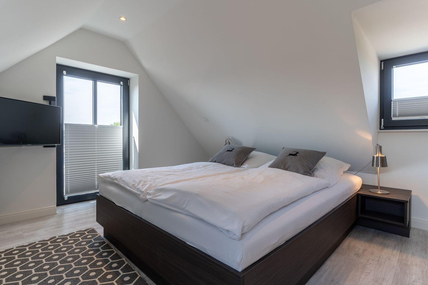 Vom Flur gelangen Sie ins Doppelschlafzimmer mit einem 160er Doppelbett mit TV.