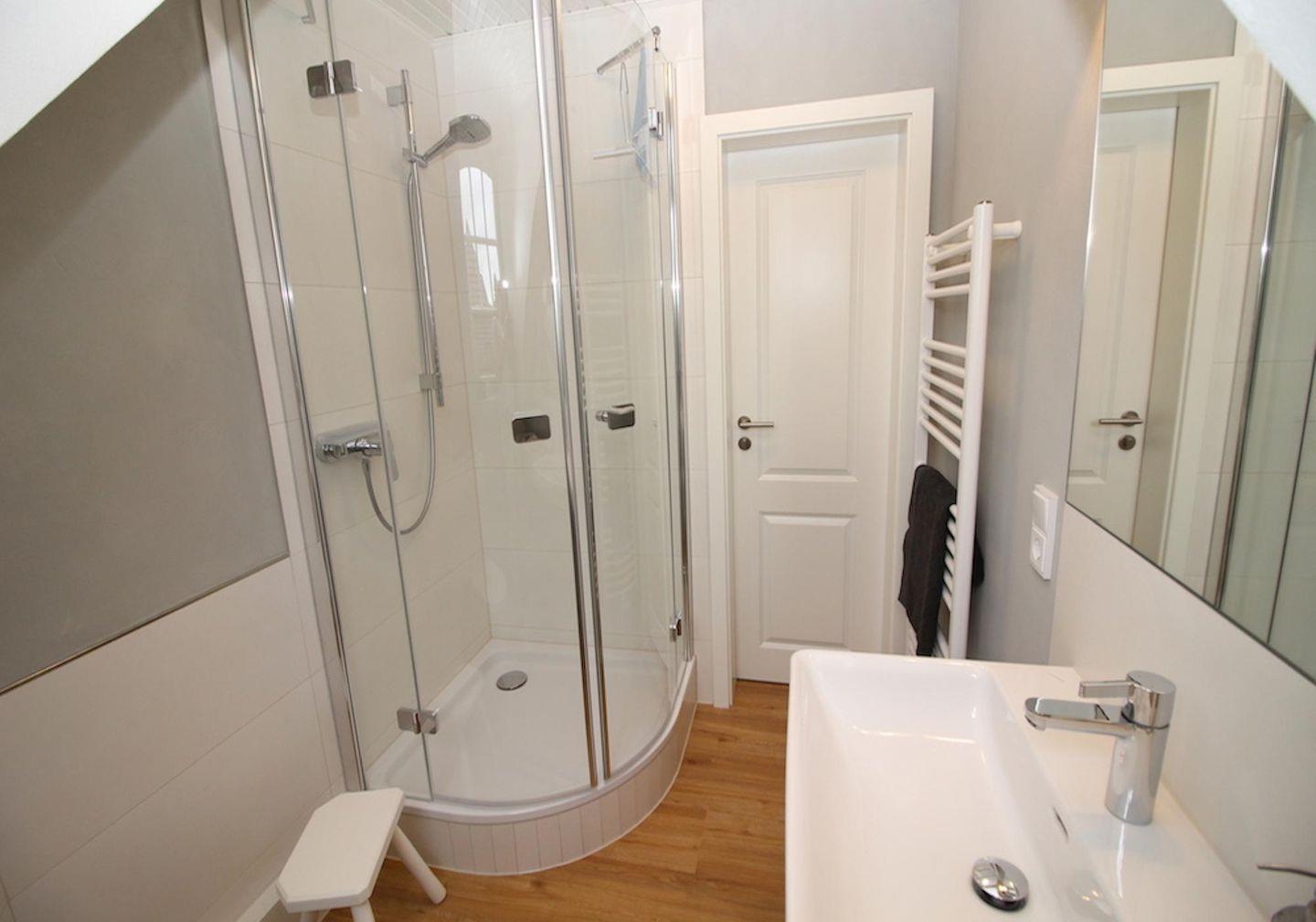 Vom Flur aus gelangen Sie in das helle Duschbad.