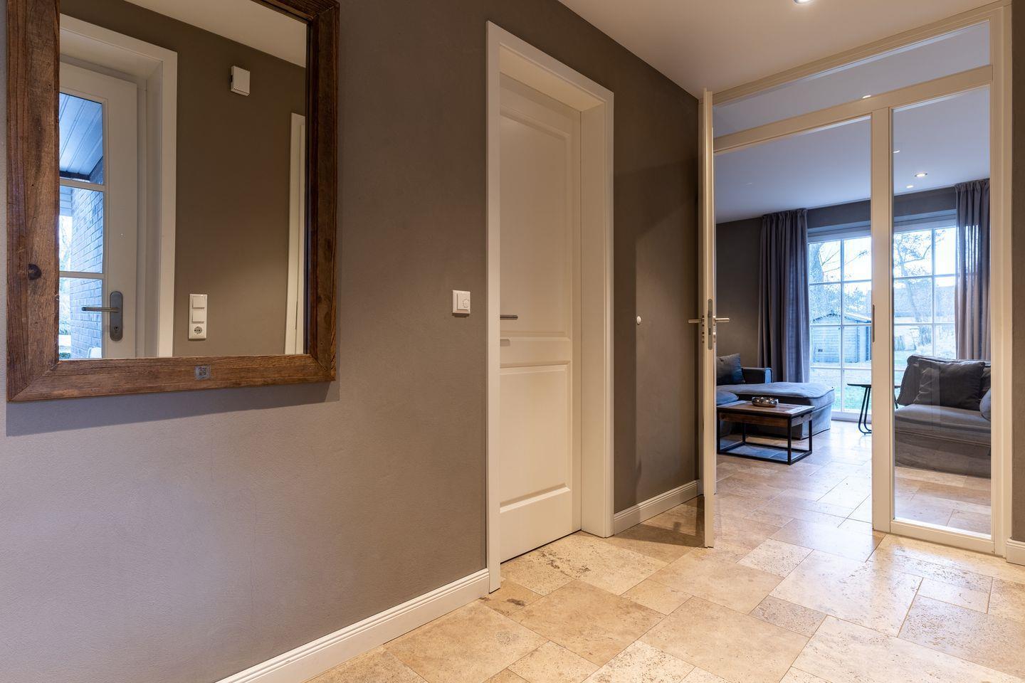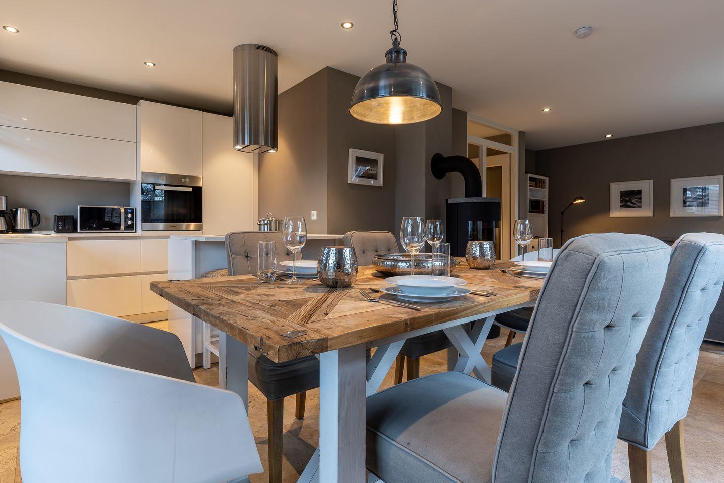 Die luxuriöse Haushälfte Dorfremise verfügt über ca. 120 m² Wohnfläche und bietet Platz für 6 Personen. Im Erdgeschoss befindet sich der lichtdurchflutete Wohnraum mit TV, Kamin, einer offener Küche sowie einem stilvollen Essbereich. Die Wohn- und Schlafräume sind mit exklusiven Möbeln von Riviera Maison ausgestattet. Die Küche verfügt über hochwertige Elektrogeräte. An den Wohnbereich schließen sich ein Flur mit eingebauter Garderobe, ein Hauswirtschaftsraum und ein mit edlem Sandstein gefliestes Duschbad an. Das Erdgeschoss verfügt über einen geschmackvollen Natursteinfußboden, der über eine Fußbodenheizung beheizt werden kann.