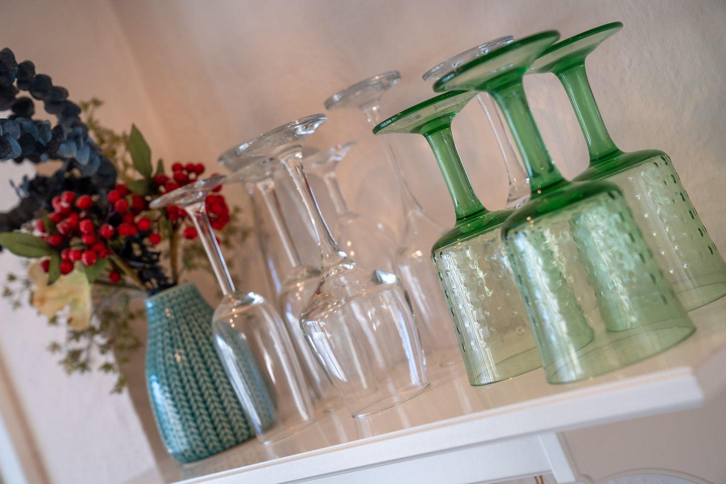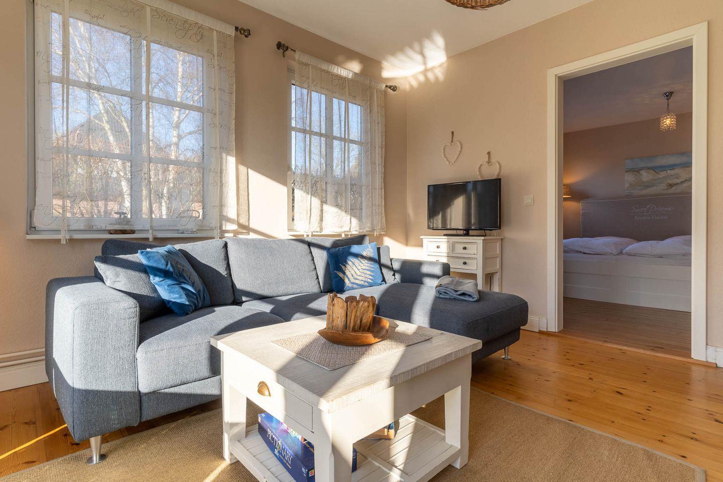Über den Haupteingang gelangen Sie in den Flur mit Garderobe. Von dort kommen sie direkt in die gemütliche Küche. Der lichtdurchflutete Wohnraum mit TV und Kamin sorgt für sofortige Entspannung. Die Wohnräume sind mit exklusiven Möbeln von Riviera Maison ausgestattet. An den Wohnbereich schließt sich ein Schlafzimmer mit großem Kleiderschrank an.