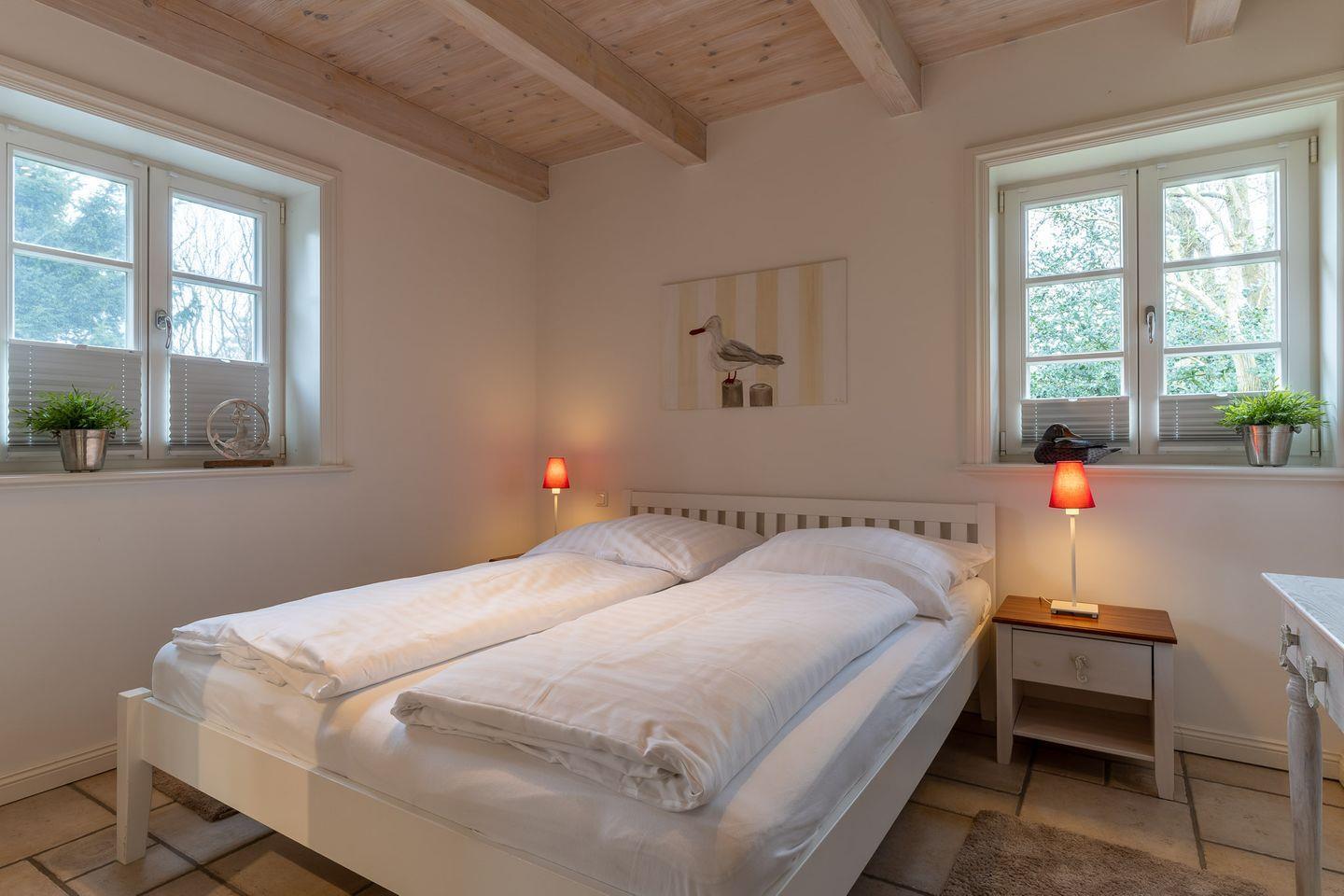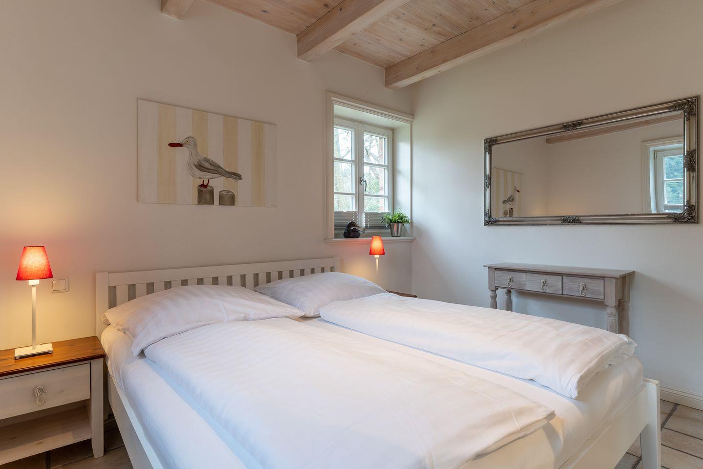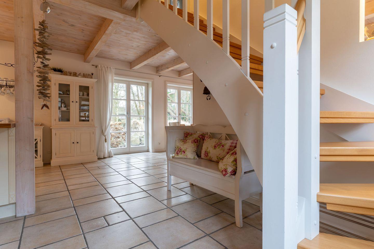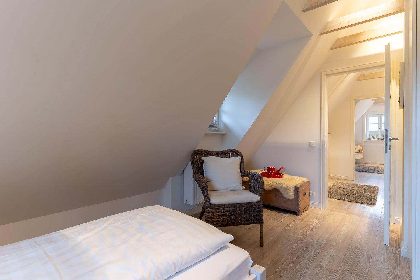 Über den geräumigen Flur gelangen Sie über eine wunderschöne Holztreppe in das Obergeschoss. Hier sind zwei weitere gemütliche Schlafzimmer. Fallen lassen und abschalten.