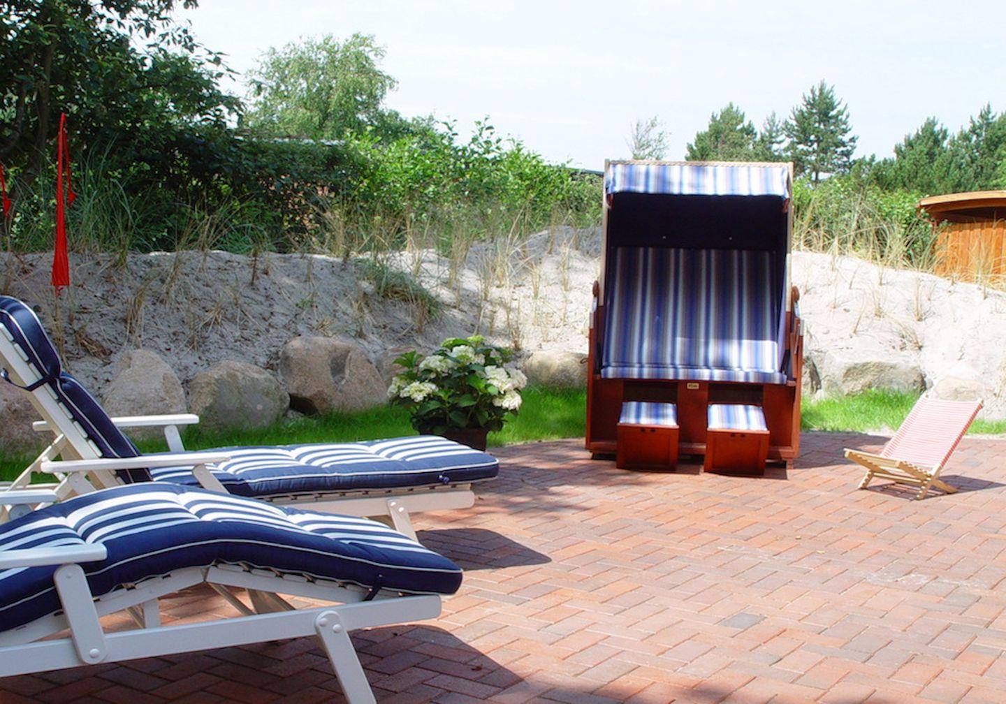 Gartenmöbel und ein Strandkorb laden Sie zur Erholung ein.