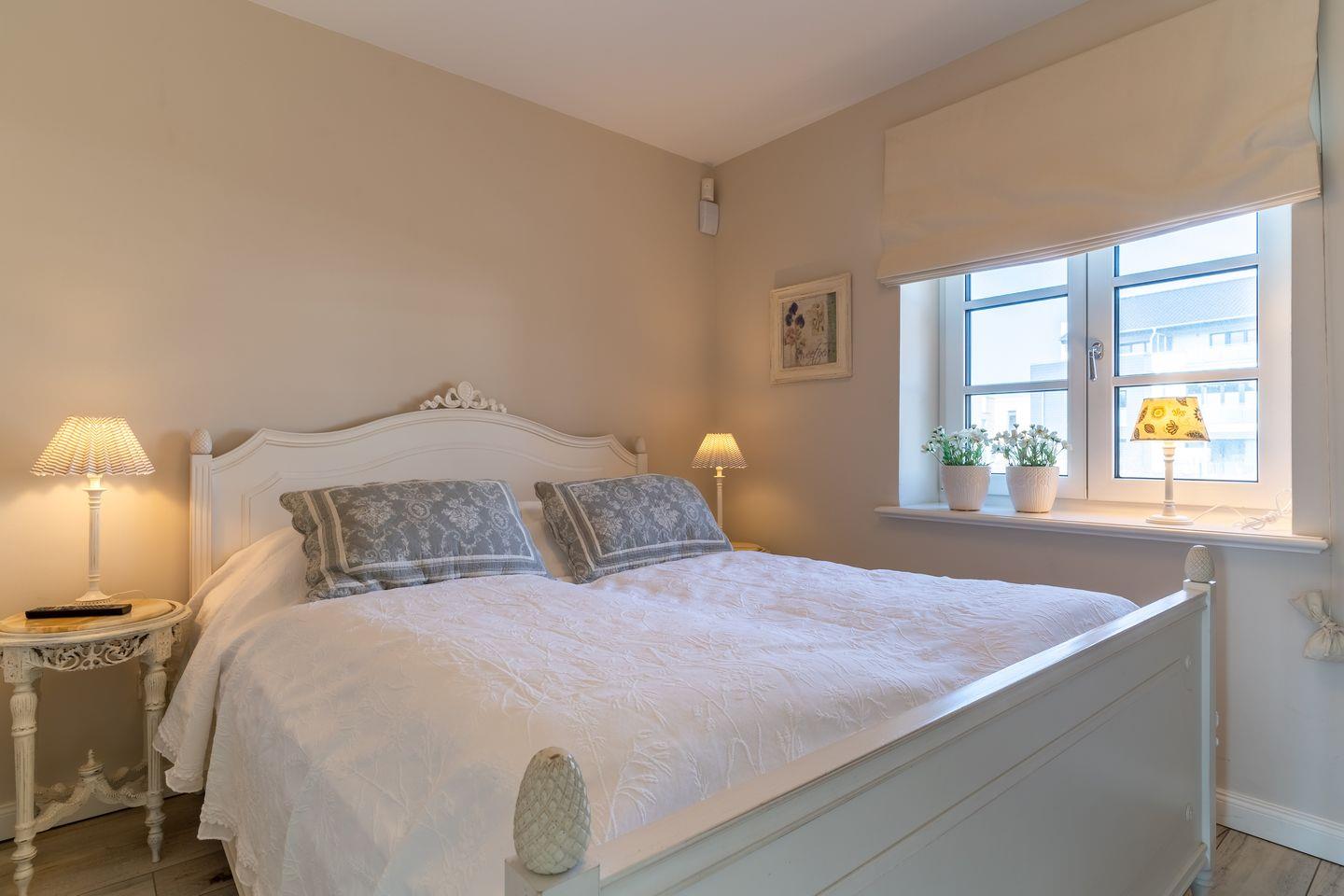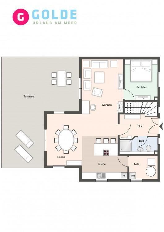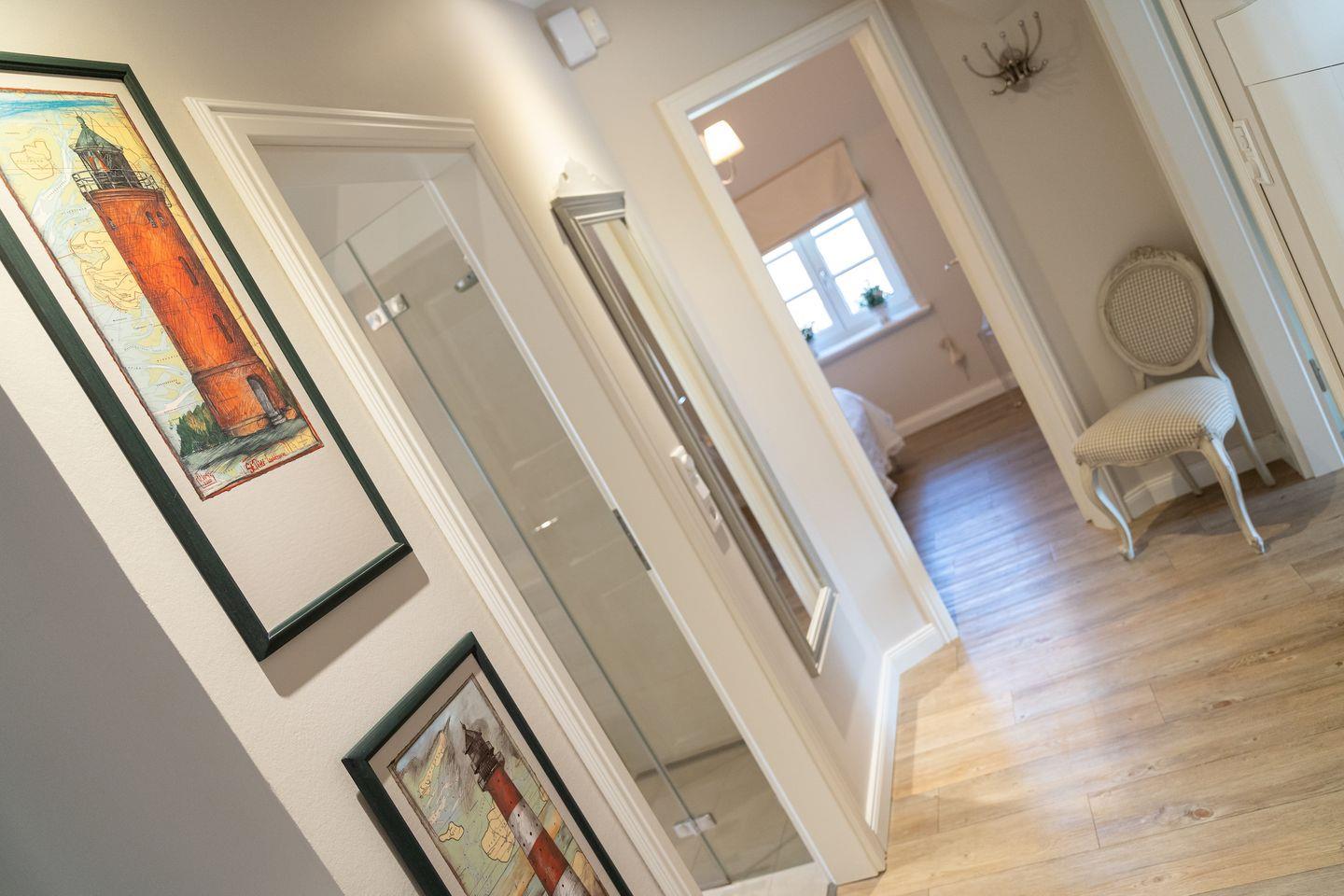 Im Erdgeschoss befindet sich der lichtdurchflutete Wohnraum mit einer offenen Küche und einem gemütlichen Essbereich. Die Küche ist mit hochwertigen Geräten voll ausgestattet. Ein edler Kamin im Wohnraum bietet einen warmen Charakter. Im Erdgeschoss ist ebenso ein großer Flur mit eingebauter Garderobe, ein Hauswirtschaftsraum und ein großzügiges Gästebad / Dusche. Außerdem befindet sich im Erdgeschoss ein Doppelschlafzimmer (Bett:160 x 200) mit TV.
