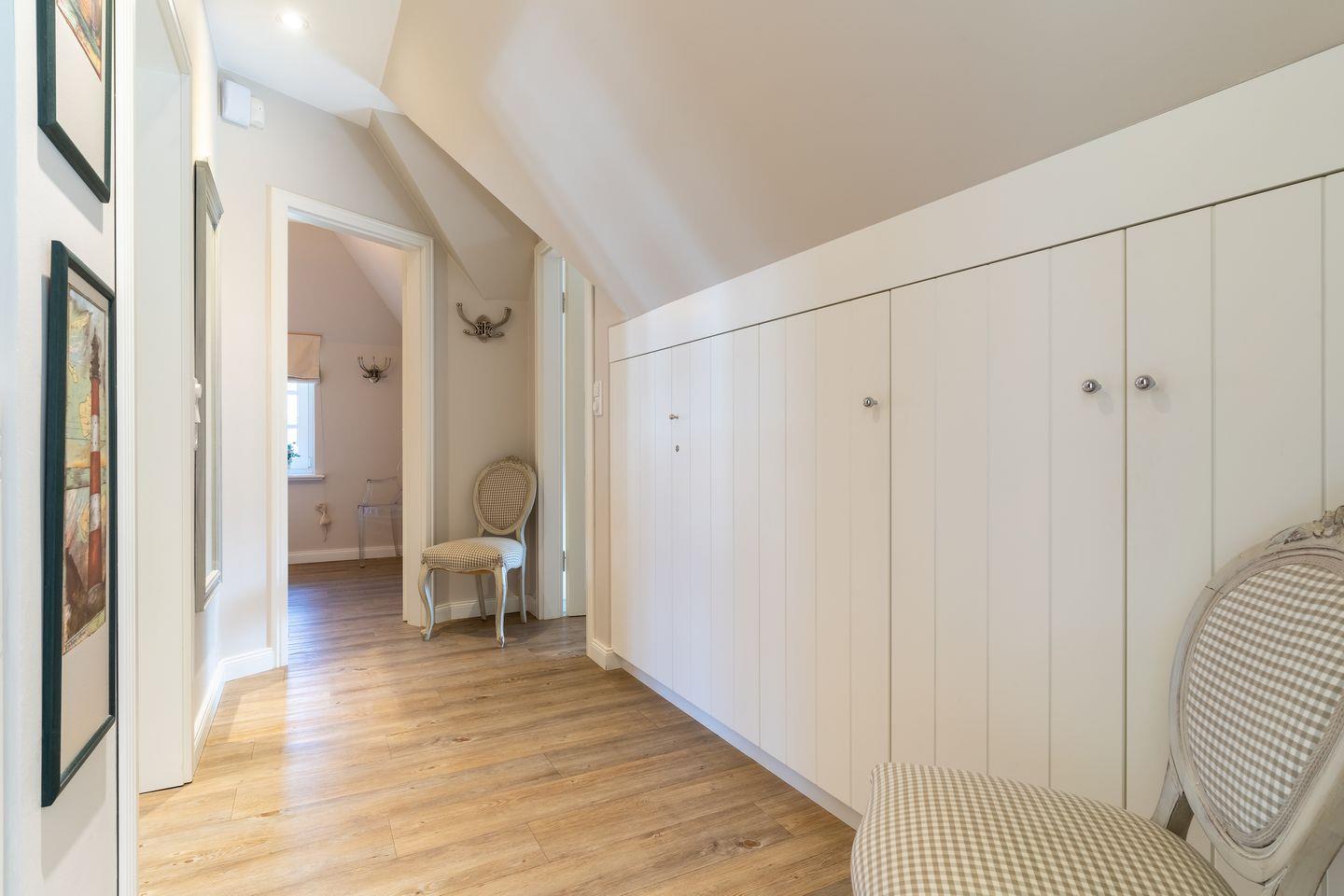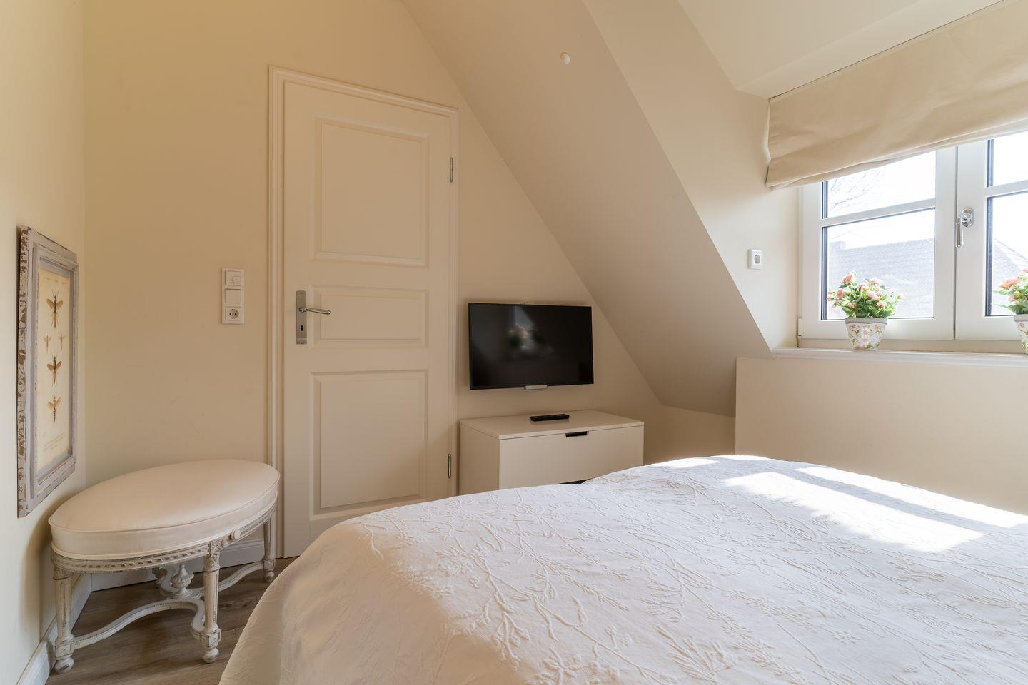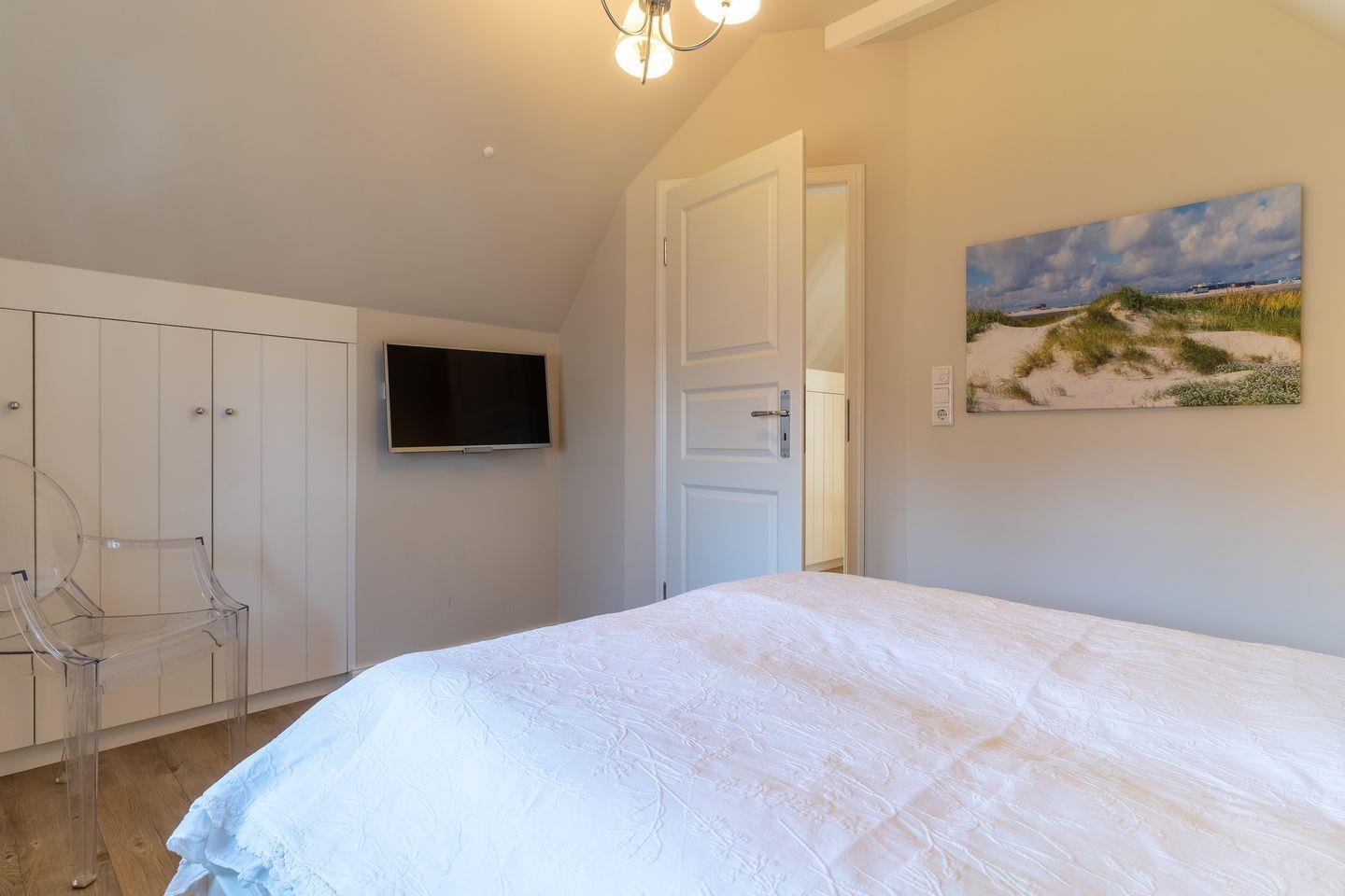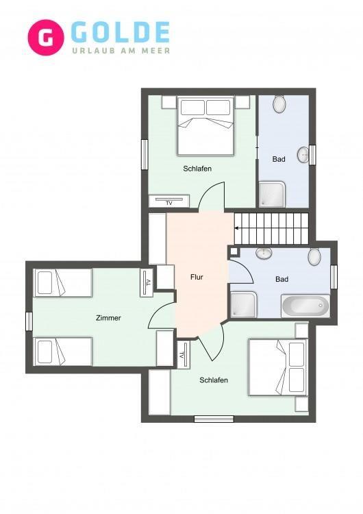 Über eine Holztreppe gelangt man in das Obergeschoss mit 3 großzügigen und liebevoll eingerichteten Schlafzimmern und 2 Bädern. Ein Doppelschlafzimmer (140 x 200 mit eigenem Duschbad / WC en suite), ein Doppelzimmer (160 x 200), außerdem ein Zweibettzimmer (Betten: 90 x 200). Für Kinder sowie Erwachsene ein Traum in jeder Hinsicht. Jedes Schlafzimmer ist mit einem TV ausgestattet.