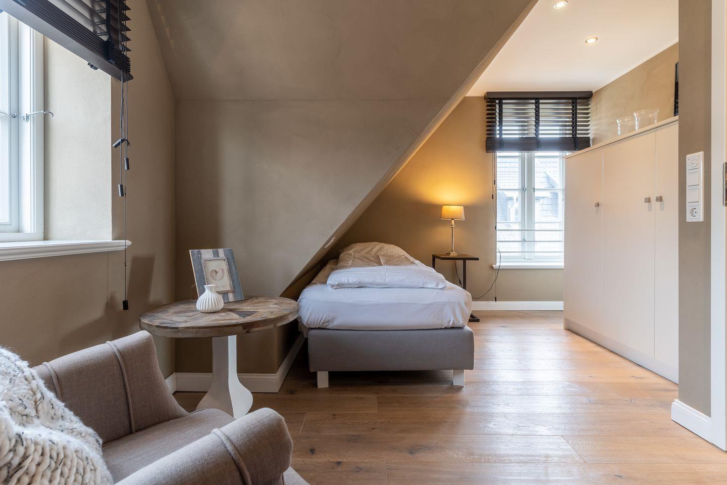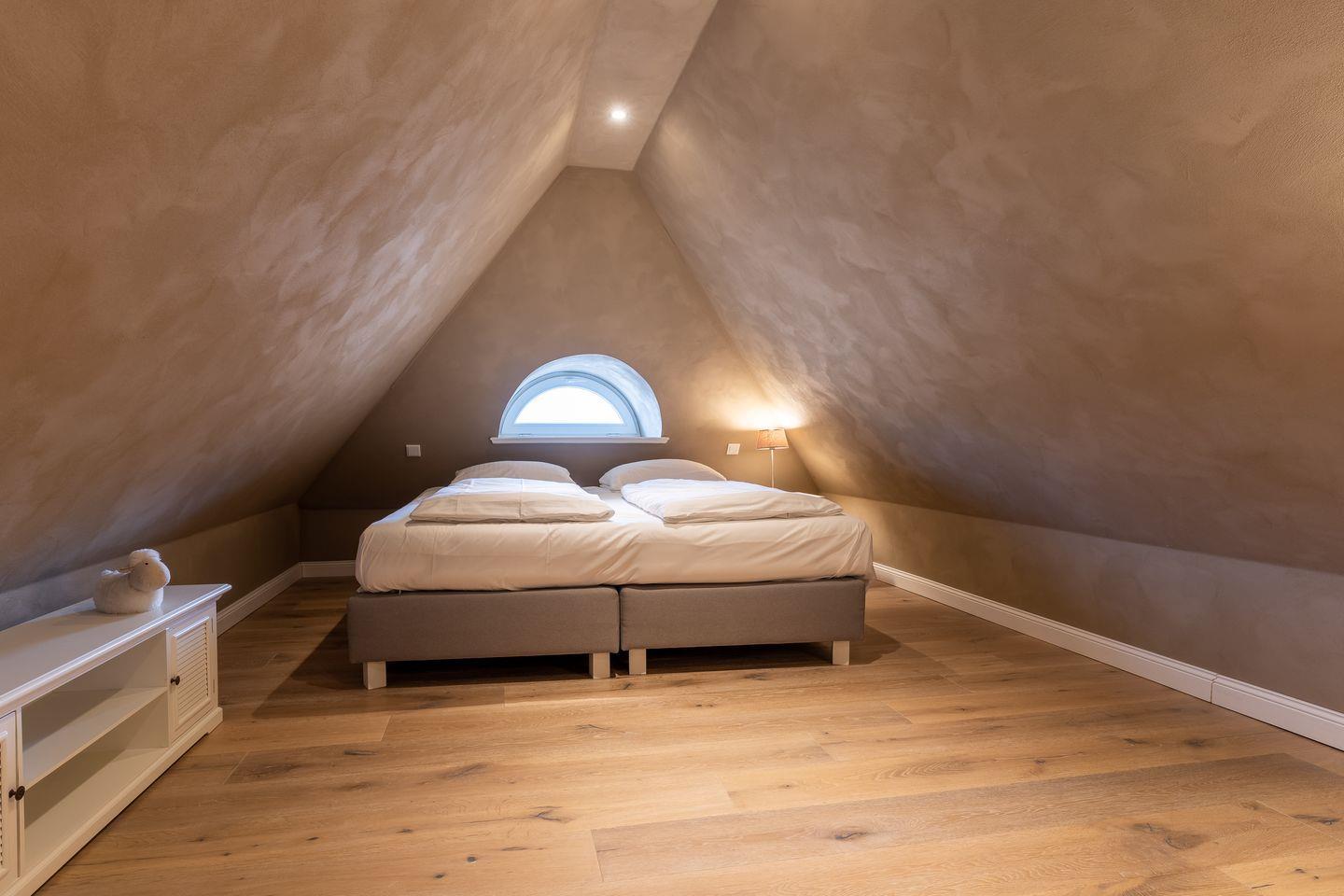 Über eine Holztreppe gelangt man in das mit Parkett ausgelegte Obergeschoss. Dieses verfügt ebenfalls über eine Fußbodenheizung. Die beiden Schlafzimmer, eines mit einem Boxspring-Doppelbett und eines mit 2 Boxspring-Einzelbetten, sind ebenfalls jeweils mit TV ausgestattet. Einbauschränke gewähren Ihnen hinreichend Ablageflächen. Darüber hinaus befindet sich im Obergeschoss ein weiteres, geräumiges Bad mit Dusche und Badewanne. Vom Obergeschoss führt die Holztreppe hinauf in das Dachgeschoss. Hier befindet sich ein zusätzliches Schlafzimmer mit 2 Boxspring-Einzelbetten, die zum Doppelbett zusammen geschoben werden können. Dieses wunderschöne Haus lässt keine Wünsche offen und bringt Sie sofort in Urlaubsstimmung.