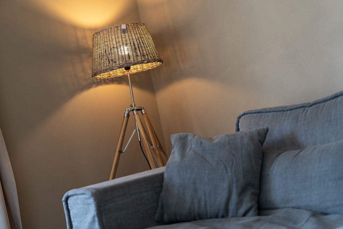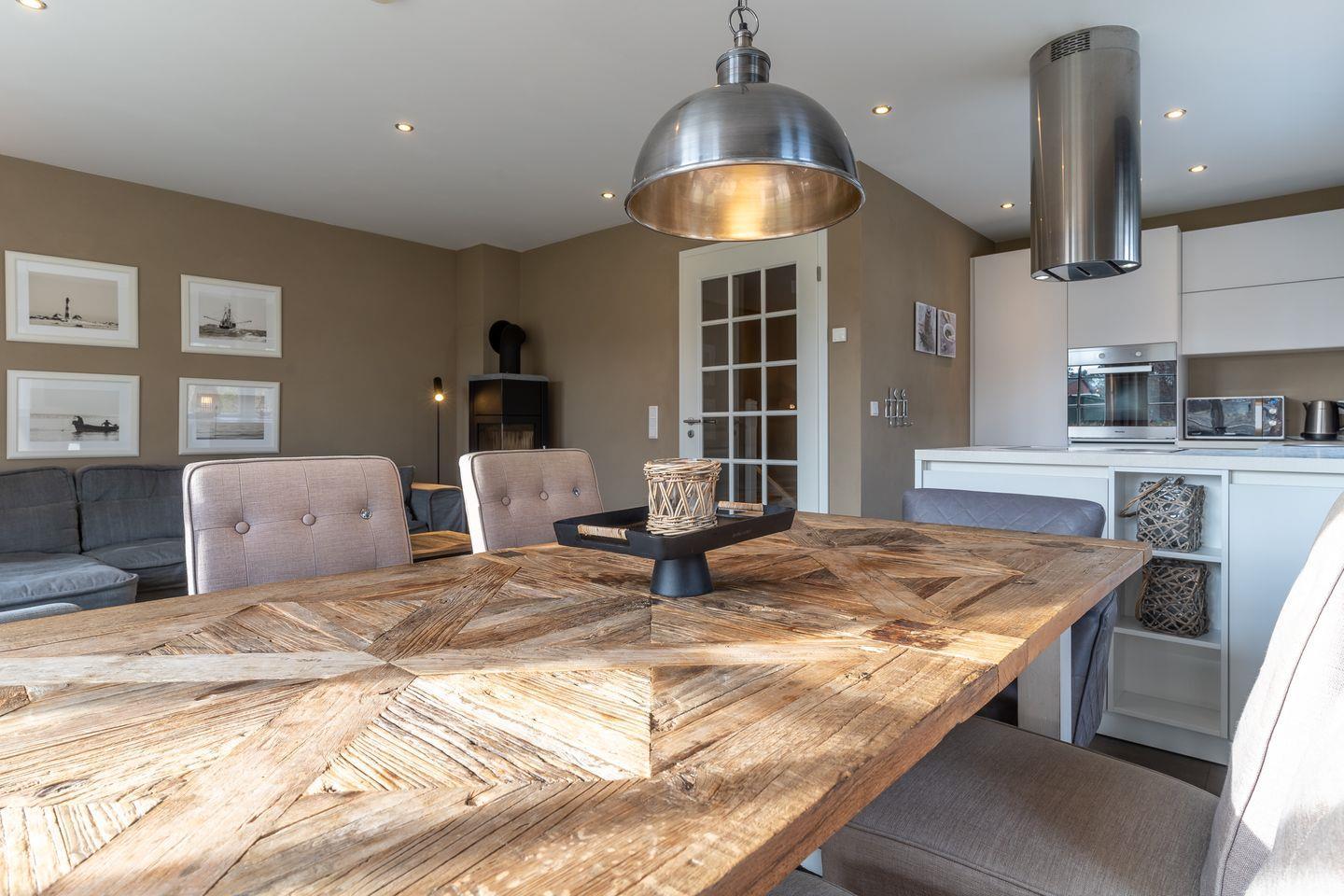 Die luxuriöse Haushälfte unter Reet verfügt über ca. 108 m² Wohnfläche und bietet Platz für 6 Personen. Im Erdgeschoss befindet sich der lichtdurchflutete Wohnraum mit TV, Kamin, einer offenen Küche sowie einem stilvollen Essbereich. Die Wohnräume sind mit exklusiven Möbeln von Riviera Maison ausgestattet. Die Küche verfügt über hochwertige Elektrogeräte. An den Wohnbereich schließen sich ein Flur mit eingebauter Garderobe, ein Hauswirtschaftsraum und ein Duschbad an. Das gesamte Erdgeschoss verfügt über geschmackvolle Fußbodenfliesen, die über eine Fußbodenheizung (Erdwärme) beheizt werden können.