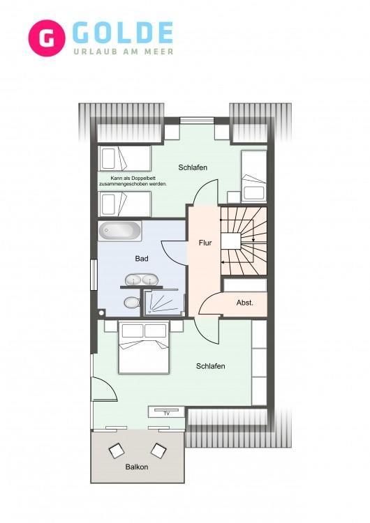 Über eine Holztreppe gelangt man in das Obergeschoss mit zwei großzügigen Schlafzimmern, ein Doppelschlafzimmer mit TV und großem Einbauschrank und ein Dreibettzimmer mit einem Einzelbett, sowie 2 weiteren Einzelbetten, diese können jedoch mit einem Klick zu einem Doppelbett umgewandelt werden. Durchdacht bis ins letzte Detail. Im OG ist außerdem noch ein 3. Bad - ein Vollbad mit Dusche und Badewanne.