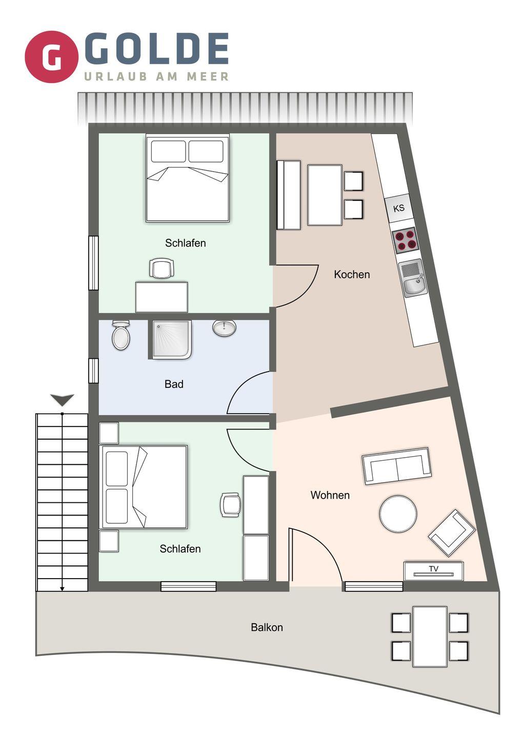 Die Wohnung befindet sich im ersten Obergeschoss mit einem großzügigen Wohnraum mit TV und einer modernen Wohnküche. Die Küche verfügt über hochwertige Elektrogeräte, eine Pad-Kaffeemaschine und eine Filter-Kaffeemaschine. An den Wohnbereich schließen sich ein Duschbad, sowie zwei Schlafzimmer mit jeweils einem Boxspringbett (1,80 x 2,00 m) und 1x mit TV an. Vom Wohnzimmer gelangen Sie auf einem großzügigen Balkon. Hier können Sie sich entspannen und die Seele baumeln lassen.