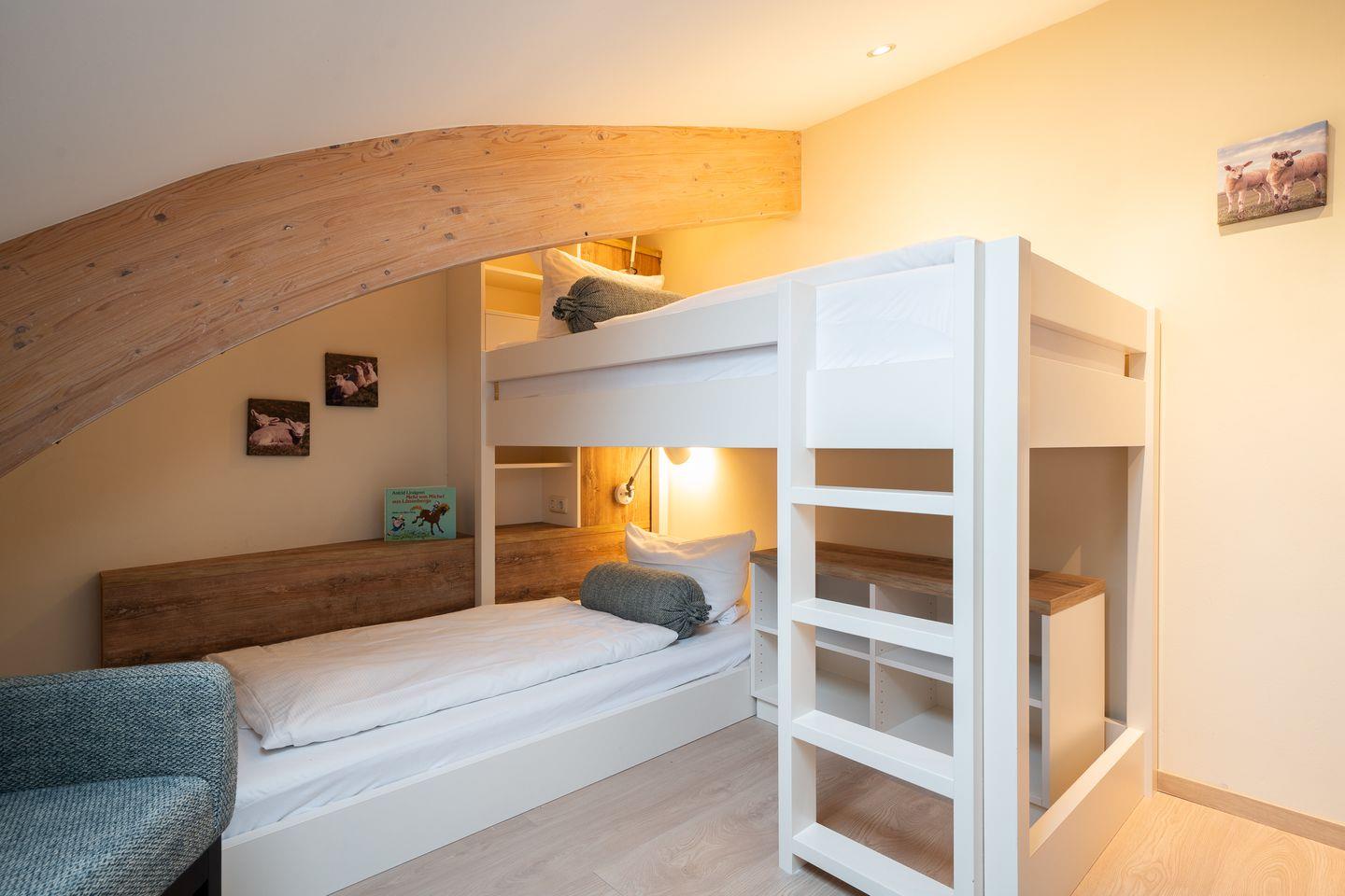 Über eine Treppe aus dem Wohnraum gelangt man in das Obergeschoss. Hier sind zwei großzügige Schlafzimmer mit jeweils einem Boxspringbett (180 x 210cm) + (180 x 200cm) + (1x mit TV). Das dritte Schlafzimmer hat ein gemütliches Etagenbett (2x 90x200cm). Außerm ist noch ein weiteres Duschbad vorhanden.