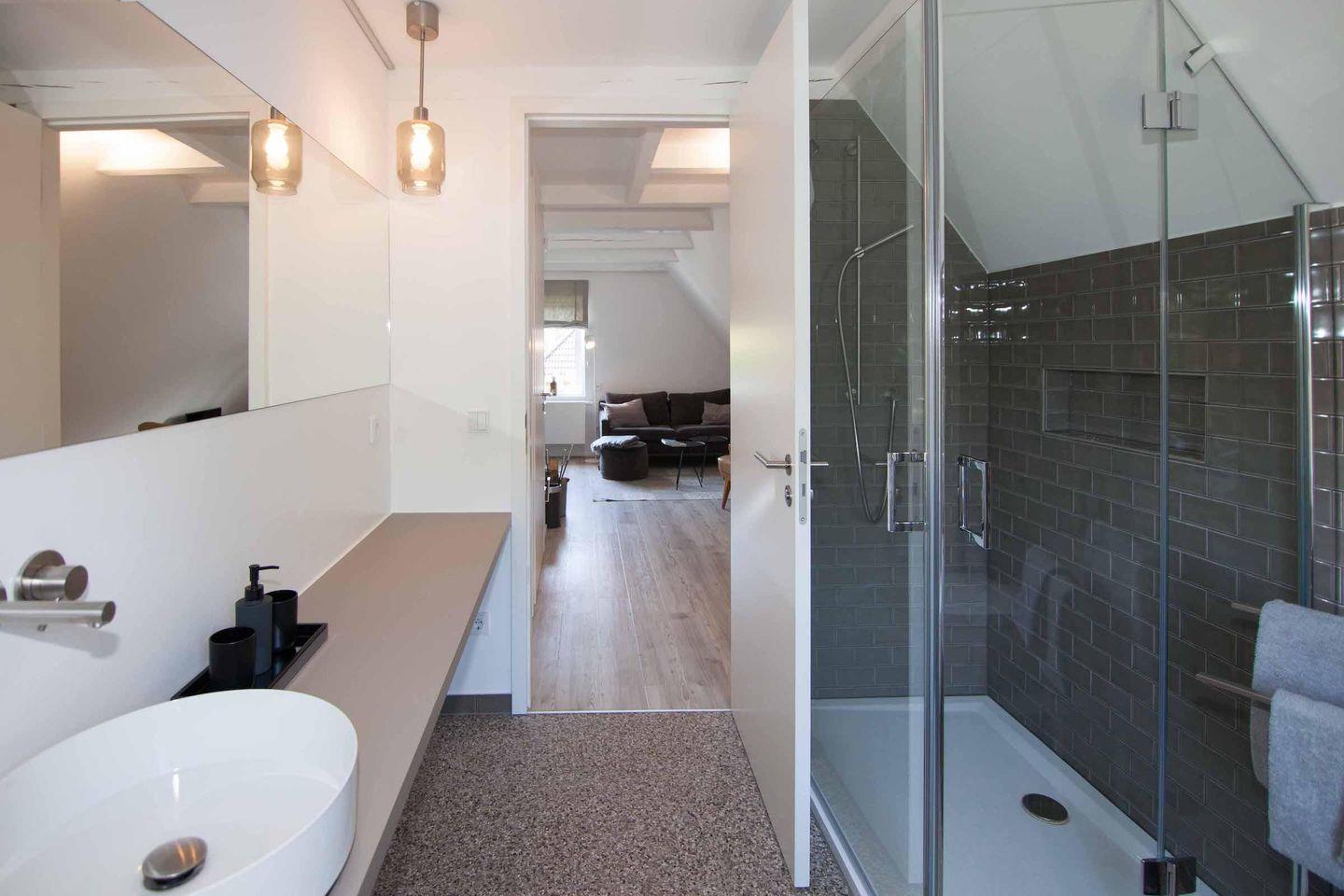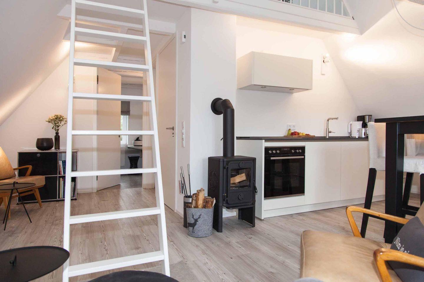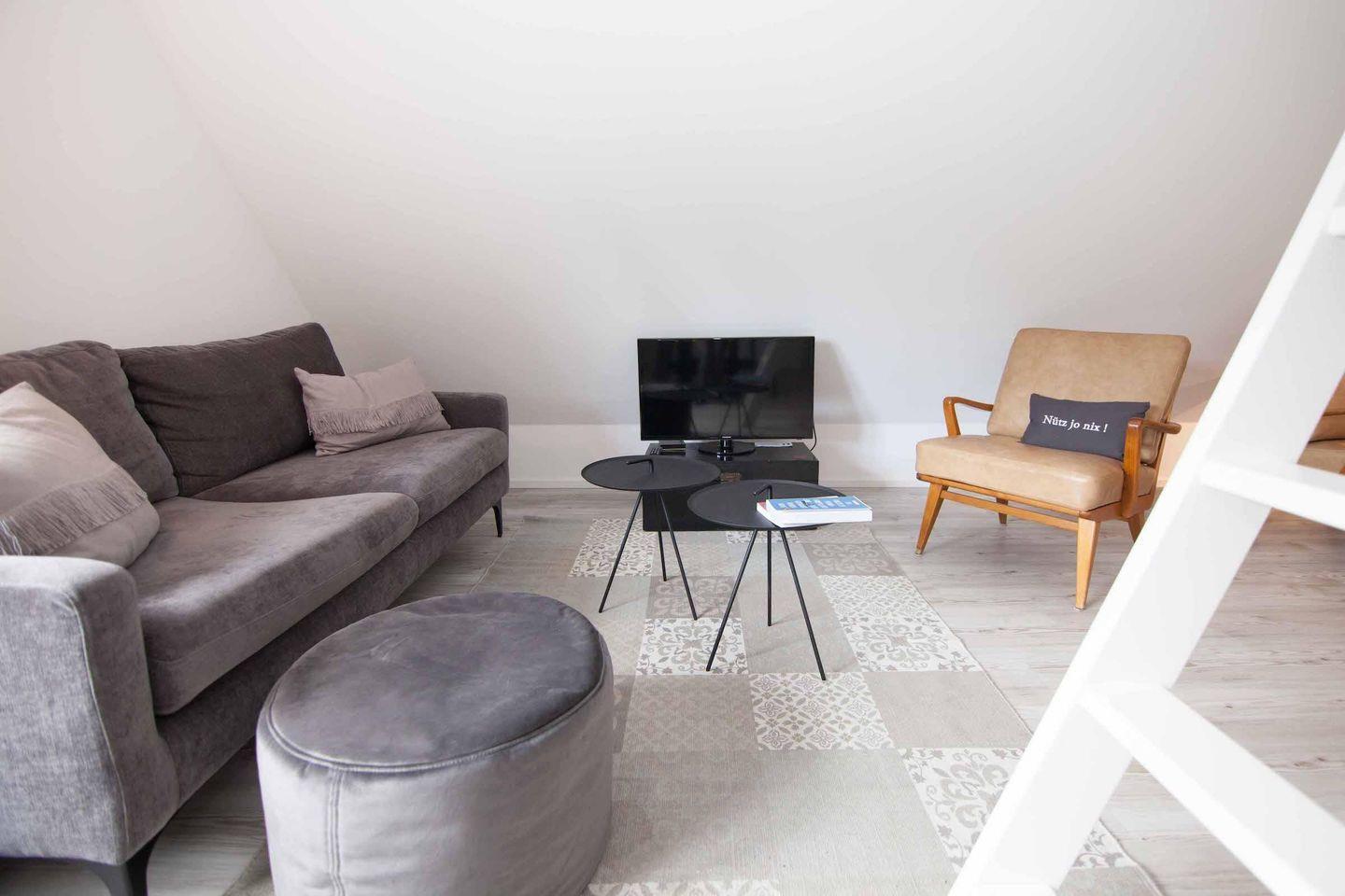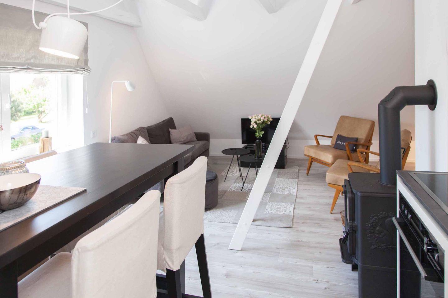 Das gemütlich eingerichtete Appartement verfügt über ca. 75 m² Wohnfläche und bietet Platz für 4 Personen. Die Wohnung befindet sich im Obergeschoss mit einem großzügige Wohnraum mit TV und einer modernen Wohnküche mit einem gemütlichen Essbereich. Das Duschbad bietet genügend Platz für Ihre Utensilien. Das Schlafzimmer mit 180er Doppelbett sorgt für ruhevolle Erholung. Das 2. 180er Doppelbett befindet sich im Dachgeschoss und ist über eine Leiter zu erreichen - für Kleinkinder nicht geeignet. Im Erdgeschoss befindet sich noch ein Flur und ein 2. Wohnbereich mit einer kleinen Veranda für den ersten Morgengruß vor der Tür.