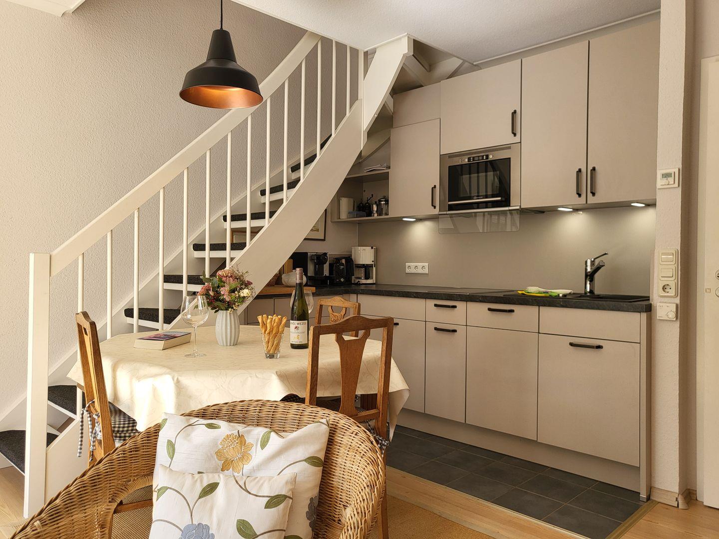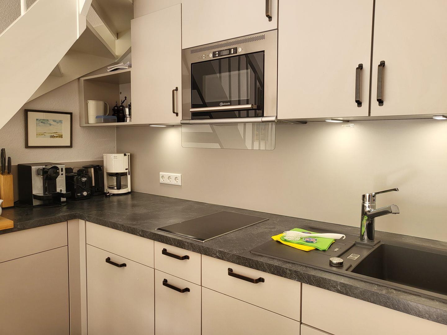 Die integrierte Küchenzeile ist gut ausgestattet und verfügt unter anderem über Cerankochfeld und Backofen sowie Kühlschrank, Geschirrspüler und Kaffeemaschine.