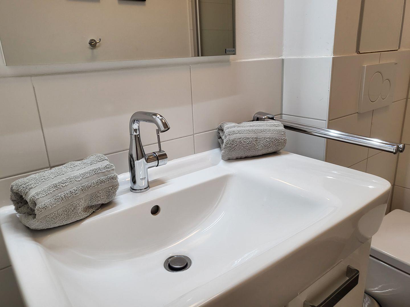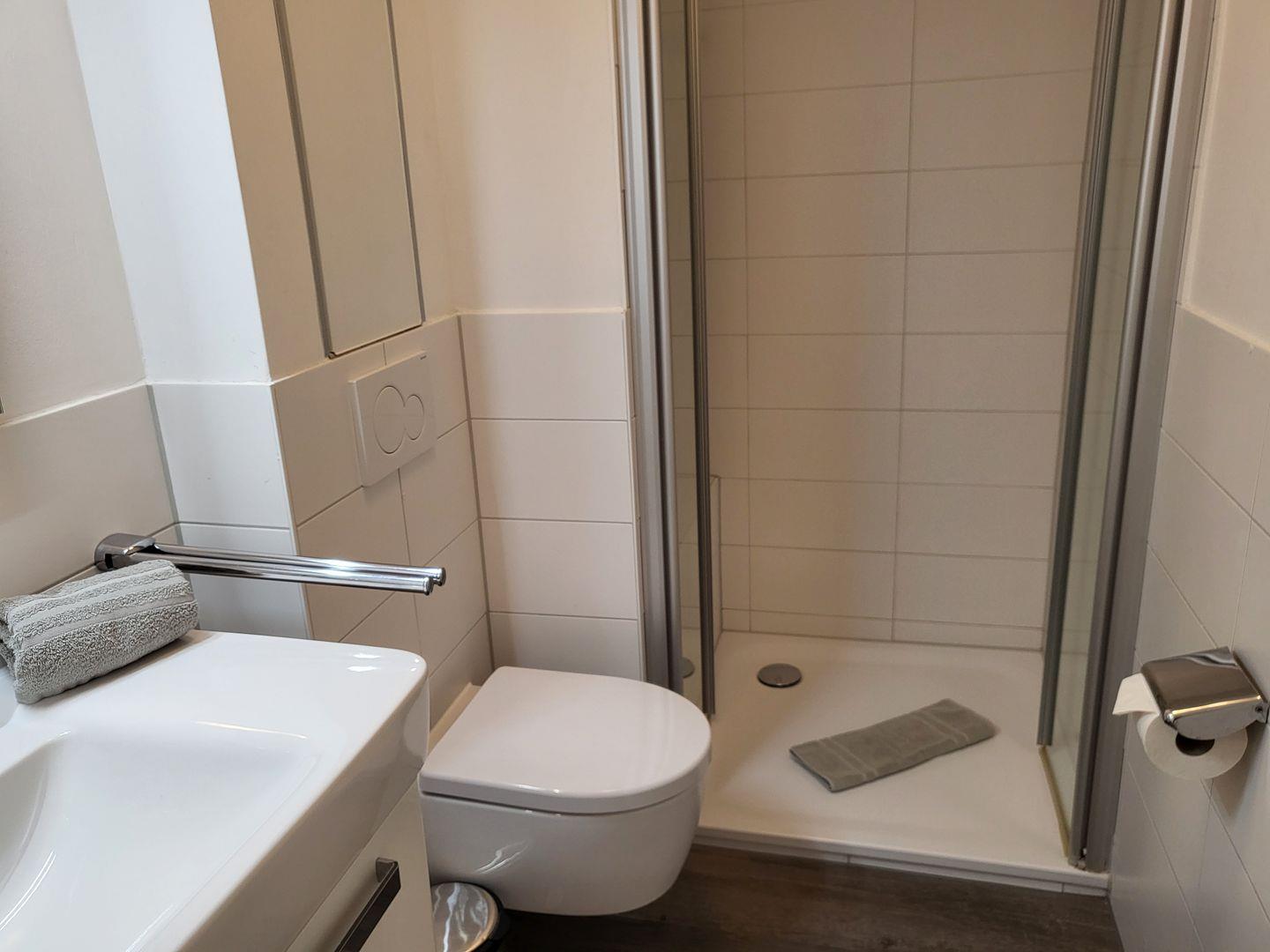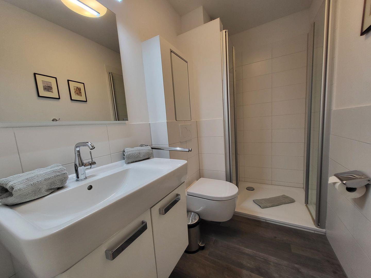 Ebenfalls im 1. OG gelegen ist ein Schlafzimmer mit Einzelbett und Bettschublade. Ein Duschbad mit bodengleicher Dusche und WC ist vorhanden.