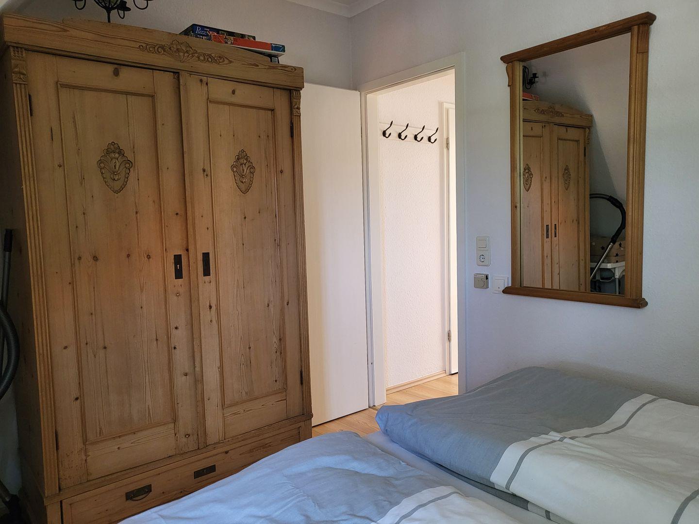 Helle 3-Zimmer Ferienwohnung über zwei Ebenen mit möbliertem Balkon. Wohnzimmer mit Küchenzeile, kleines Schlafzimmer mit Doppelbett , Dachgeschoss mit Doppelbett, Duschbad mit WC, 2x Fernseher vorhanden