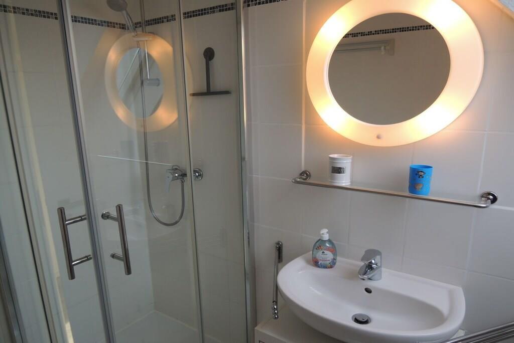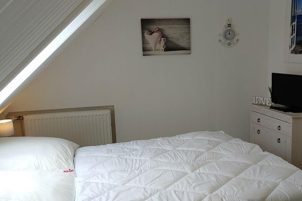 Im maritimen Style eingerichtete Fewo mit Dachloggia, ca.45 qm, Südwestlage, Gartenbenutzung. Ein Kleiderschrank als Raumteiler trennt den Wohnbereich vom Schlafbereich (Doppelbett 180/200 cm). Im separaten Schlaf- bzw. Kinderzimmer steht ein Doppelbett (140/200 cm). SAT-TV mit DVD. Kinderspielecke mit Velo-Spieltisch, Labyrinth, Tischflipper, Twister etc . Fenster mit Verdunkelungsrollo. Die Küchenzeile ist komplett ausgestattet: Kühlschrank mit Gefrierfach, Backofen, Herd mit Ceranfeld, Kaffeevollautomat, Kaffeemaschine, Wasserkocher, Toaster, Mikrowelle, ausreichend Geschirr, Gläser und Besteck. Duschbad mit Dachfenster, Reisefön ist vorhanden. Küche, Diele und Wohnraum sind offen gestaltet. 1 reservierter Pkw-Stellplatz. Waschmaschine gegen Gebühr in einem Gästewaschraum (2,50 Euro). Eigenes abschließbares Gartenhaus für Ihre Fahrräder. Gemeinschafts-Fahrradständer hinter dem Haus.