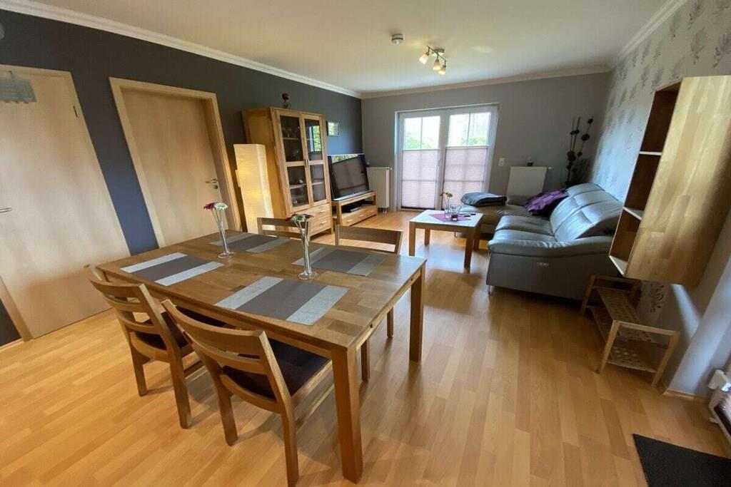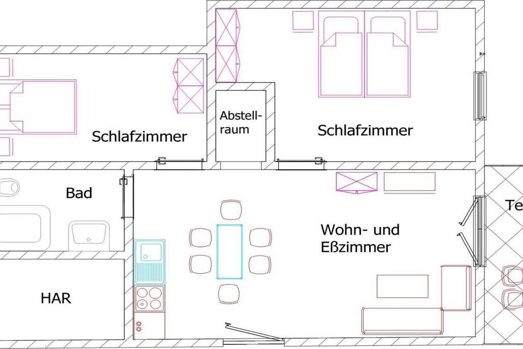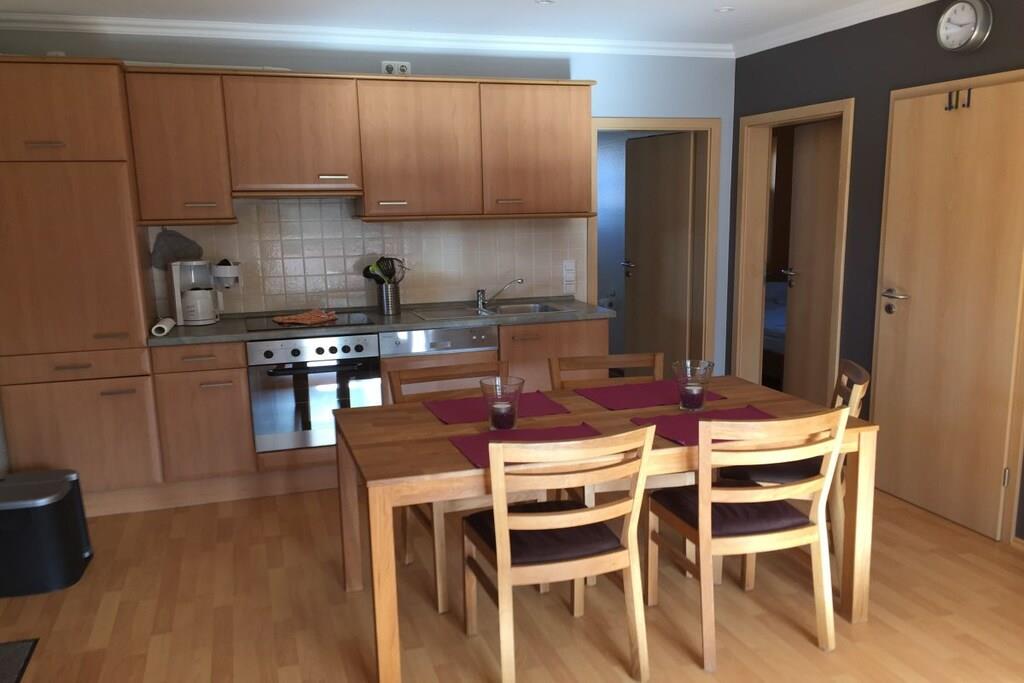Unsere Terrassenwohnung hat eine Gesamtgröße von 70 qm und für bis zu 4 Personen eingerichtet. Sie bietet zwei Schlafzimmer mit je einem Doppelbett (180x200 und 140x200). Im großen Wohn-Essraum steht eine Leder- Eckgarnitur (Sat-TV, CD-MC, MP3, DVD). Die Küchenzeile ist komplett eingerichtet u. a. mit Ceranfeld, Umluftbackofen, Geschirrspülmaschine, Mixer, Toaster, Kaffeemaschine, Kühlschrank, Wasserkocher etc. Im Badezimmer befindet sind eine Dusche/WC (gefliest). und der Fußboden in den Wohnräumen ist mit Laminat ausgelegt. Im separaten Raum steht eine Waschmaschine und ein Gefrierschrank. Die große Terrasse lädt zum Sonnenbaden ein. Auf der Terrasse steht ein Tisch mit 6 Stühlen, Liegen und ein Sonnenschirm. Parkplatz vor dem Haus