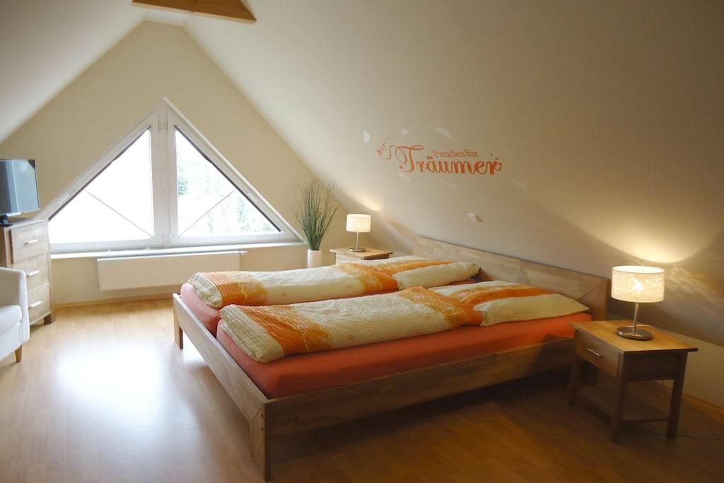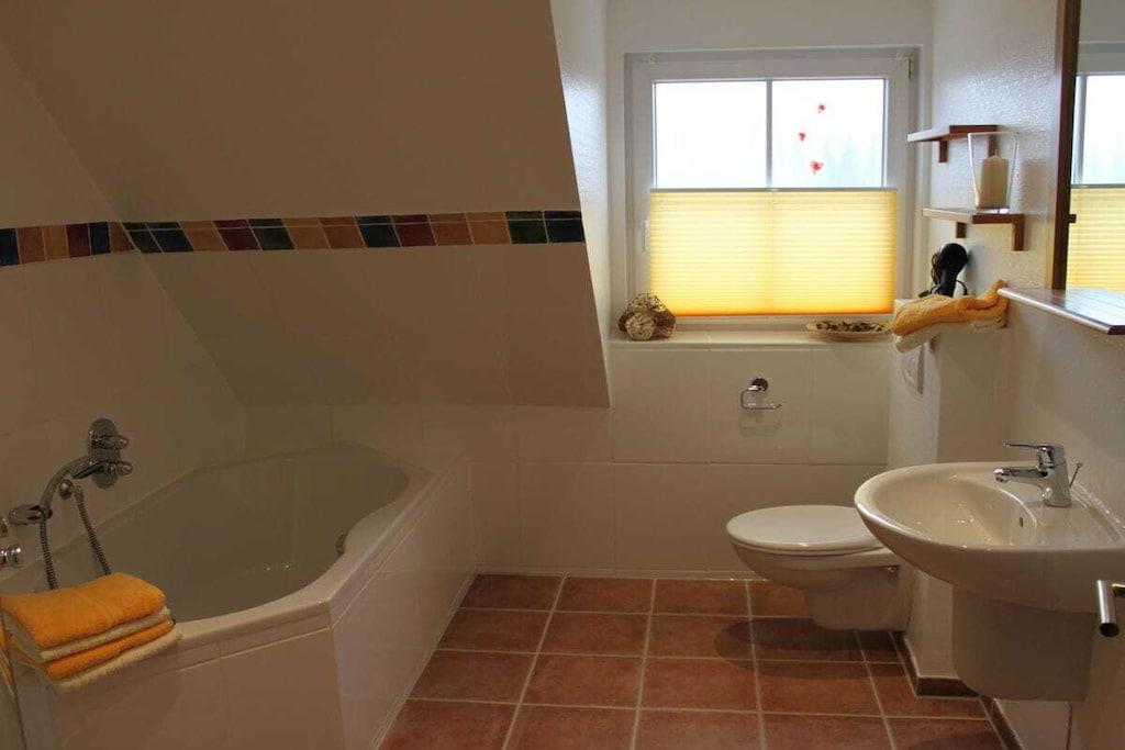 Unsere helle freundliche Balkonwohnung hat eine Gesamtgröße von 90 qm und verteilt sich über 2 Ebenen. Sie ist gemütlich für bis zu 4 Personen eingerichtet. Sie bietet zwei Schlafzimmer mit je einem Doppelbett. In dem Wohnraum, mit einer offenen Küche, steht eine Eckgarnitur zur Verfügung. Die Küchenzeile mit Umluftofen ist komplett eingerichtet u. a. mit Ceranfeld, Mixer, Toaster, Kaffeemaschine, Kühlschrank ohne Gefrierfach (Gefrierschrank und Waschmaschine in einem separaten Raum), Wasserkocher etc. Es gibt ein Duschbad mit WC und Badewanne (gefliest). Der Fußboden der restlichen Wohnung ist mit Laminat oder PVC ausgelegt. Es stehen Ihnen ein kostenloser Internetzugang per DSL, Sat-TV mit HiFi-Anlage (CD-MC, MP3, DVD) zur Verfügung. Parkplatz vor dem Haus