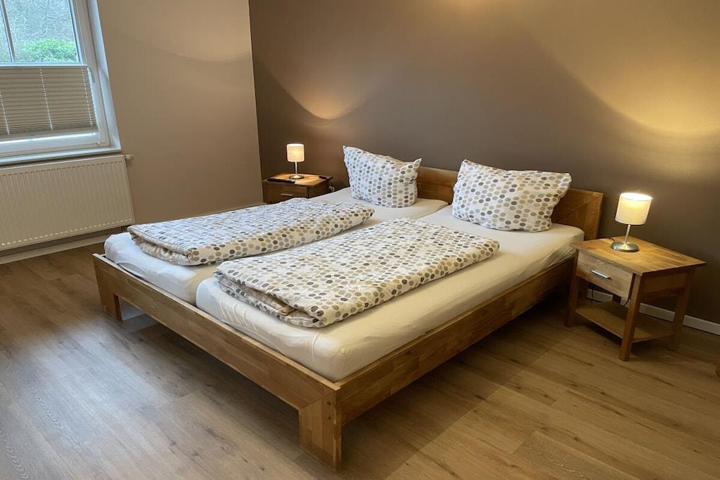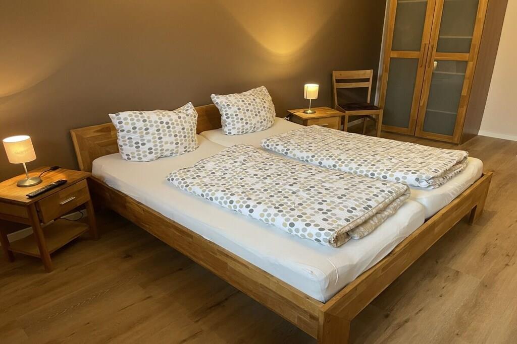 Unsere helle freundliche Terrassenwohnung hat eine Gesamtgröße von 70 qm und für bis zu 4 Personen eingerichtet. Sie bietet zwei Schlafzimmer mit je einem Doppelbett (180 x 200 und 140 x 200 cm). Im Wohnraum steht eine Eckgarnitur für kuschelige Fernsehabende (Sat-TV mit HiFi-Anlage (CD-MC, MP3, DVD) Die Küchenzeile ist komplett eingerichtet u.a. mit Ceranfeld, Umluftbackofen, Mixer, Toaster, Kaffeemaschine, Kühlschrank, Wasserkocher etc. Im Badezimmer befindet sind eine Dusche/WC (gefliest). Der Fußboden in den Wohnräumen ist mit Laminat ausgelegt und somit "Allergiker freundlich". In einem Nebenraum ist eine Waschmaschine und ein Gefrierschrank. Internetzugang steht Ihnen frei zur Verfügung. Parkplatz vor dem Haus