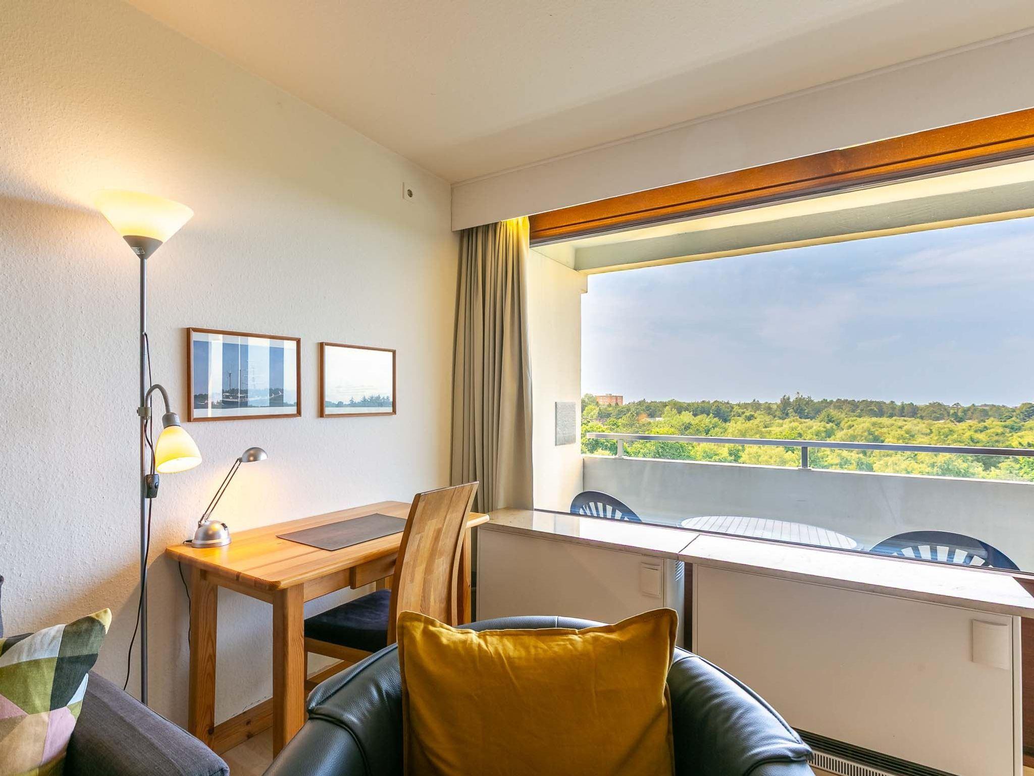 Wohnzimmer mit ausziehbarem (Schlaf-) Sofa (140x190cm), 2 Sesseln, kleinem Schreibtisch mit Stuhl, Esstisch mit 4 Stühlen, SMART-TV (Sat), DVD-Player und Stereo-Kompaktanlage. Direkter Zugang zum möblierten Balkon nach Westen.
