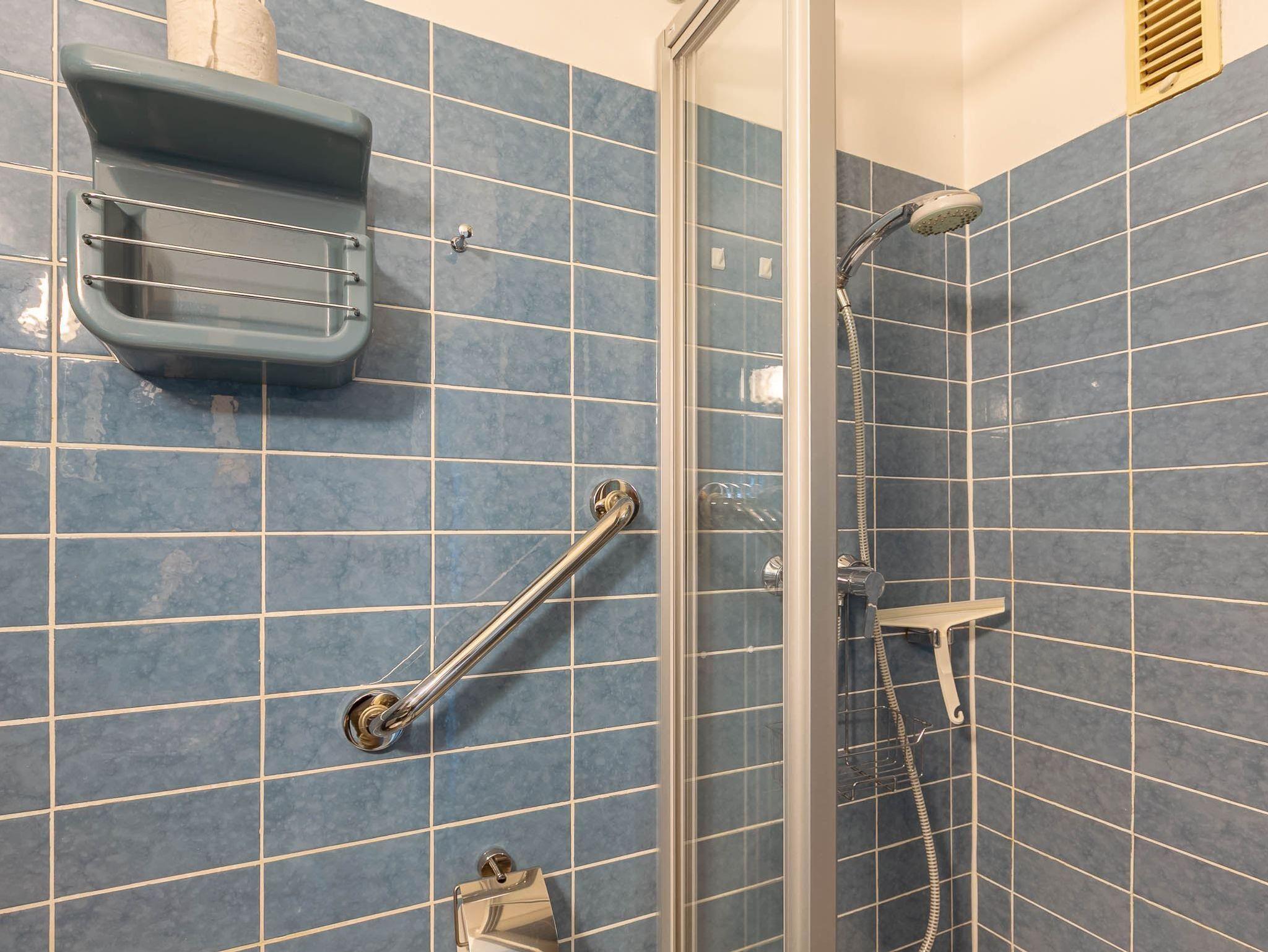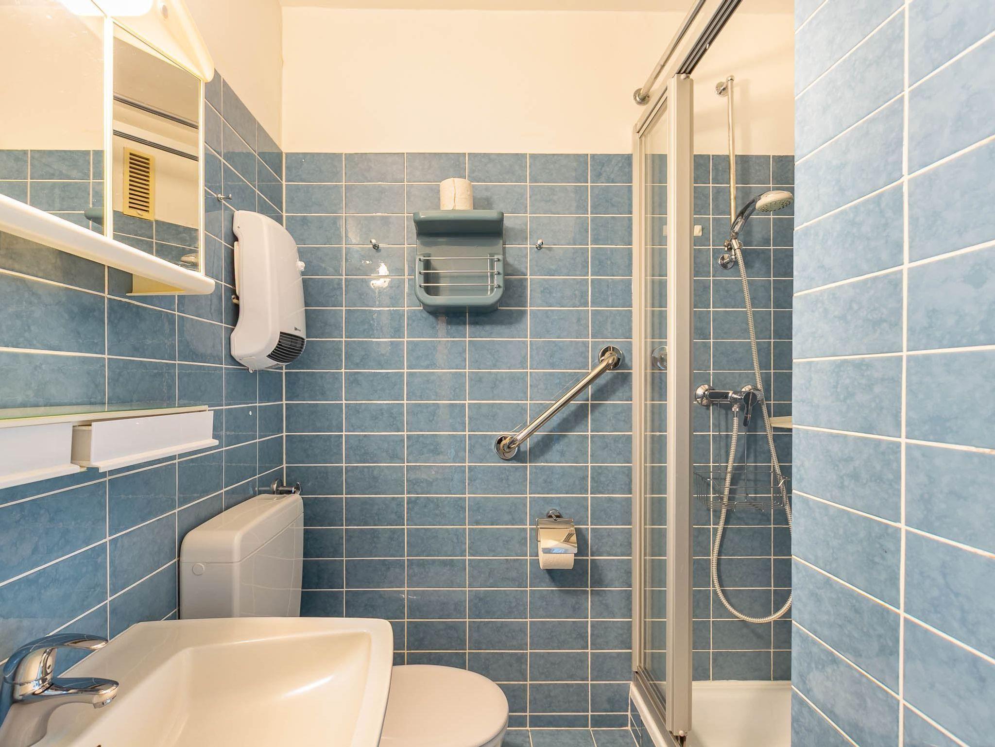 Badezimmer (Duschbad) mit Dusche, WC und Föhn.