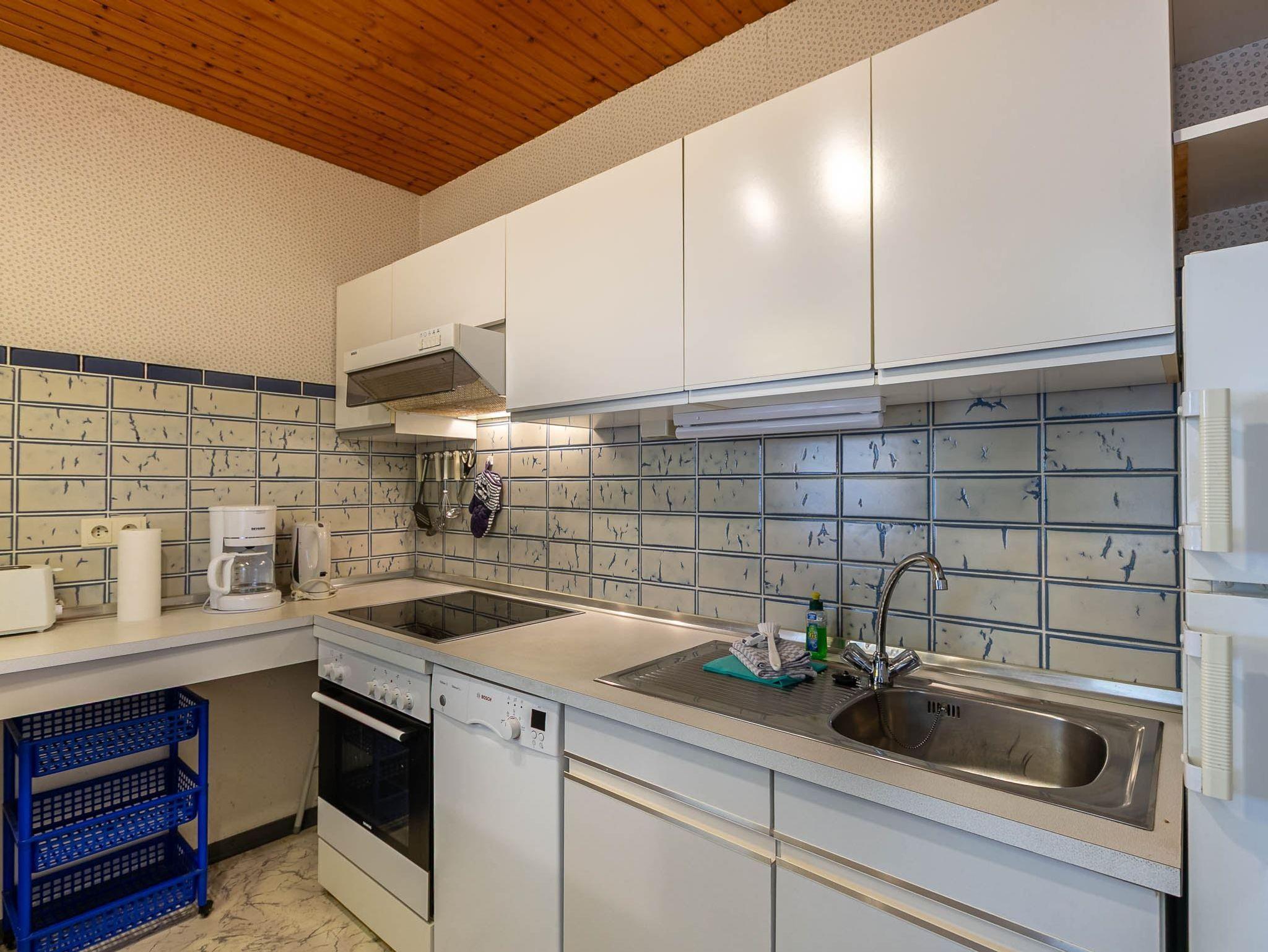 Separate Küche mit Backofen, Mikrowelle, Geschirrspüler und Kühl-Gefrier-Kombination.