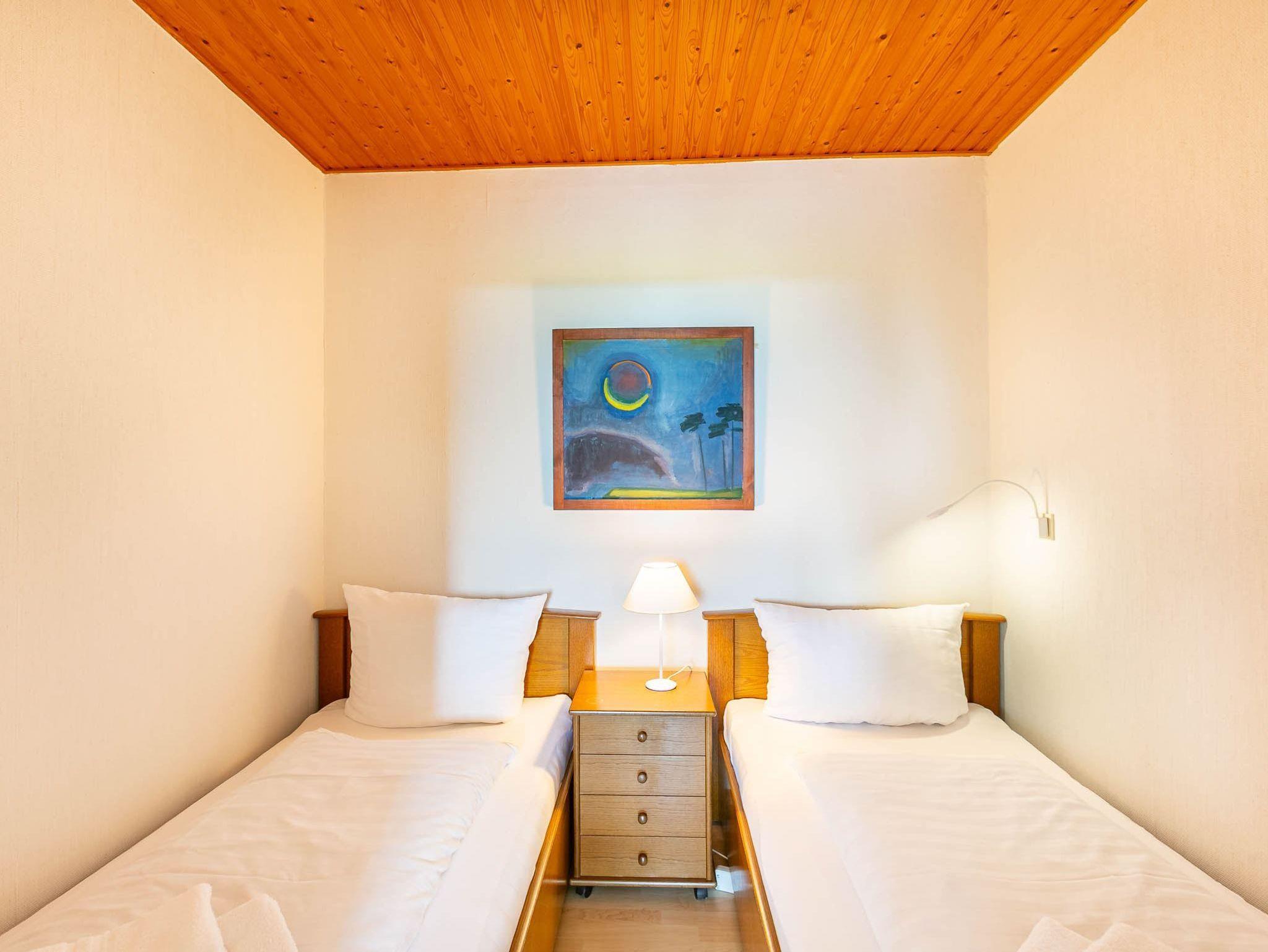 Schlafzimmer mit 2 Einzelbetten (je 90x200cm). Dieses Schlafzimmer ist durch einen Vorhang vom Wohnzimmer abgeteilt.