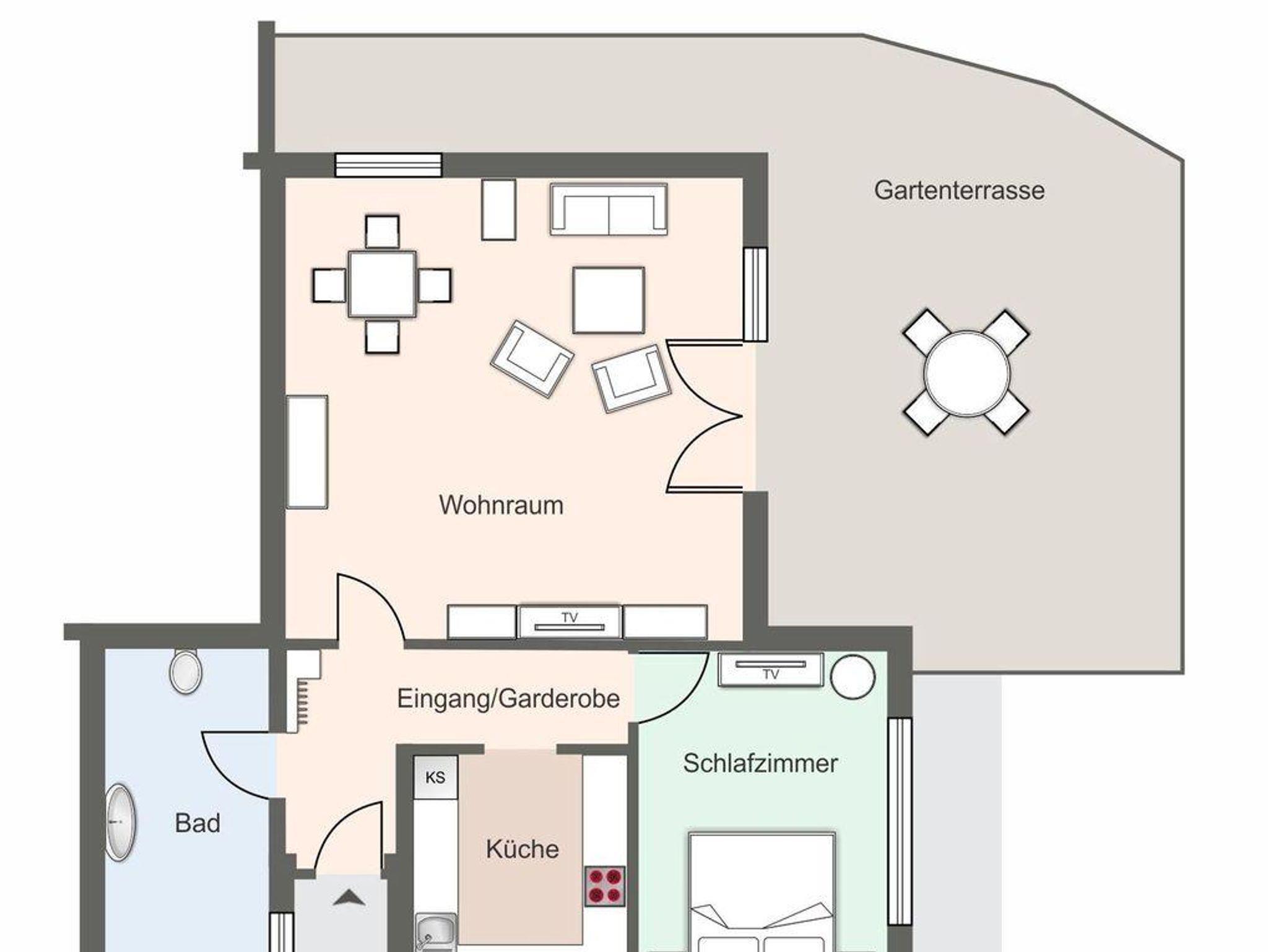 Die Bungalowhaushälfte verfügt über ca. 65m² Wohnfläche und teilt sich wie folgt auf: Im Erdgeschoss befindet sich der großzügige Wohnraum mit Essbereich. Ebenso auf gleicher Ebene ist eine voll ausgestattete Küche und ein Duschbad. Vom Flur gelangen Sie ins Doppelschlafzimmer mit TV. Vom Wohnzimmer kommen Sie direkt auf die Terrassen mit Blick in den wunderschön Garten.