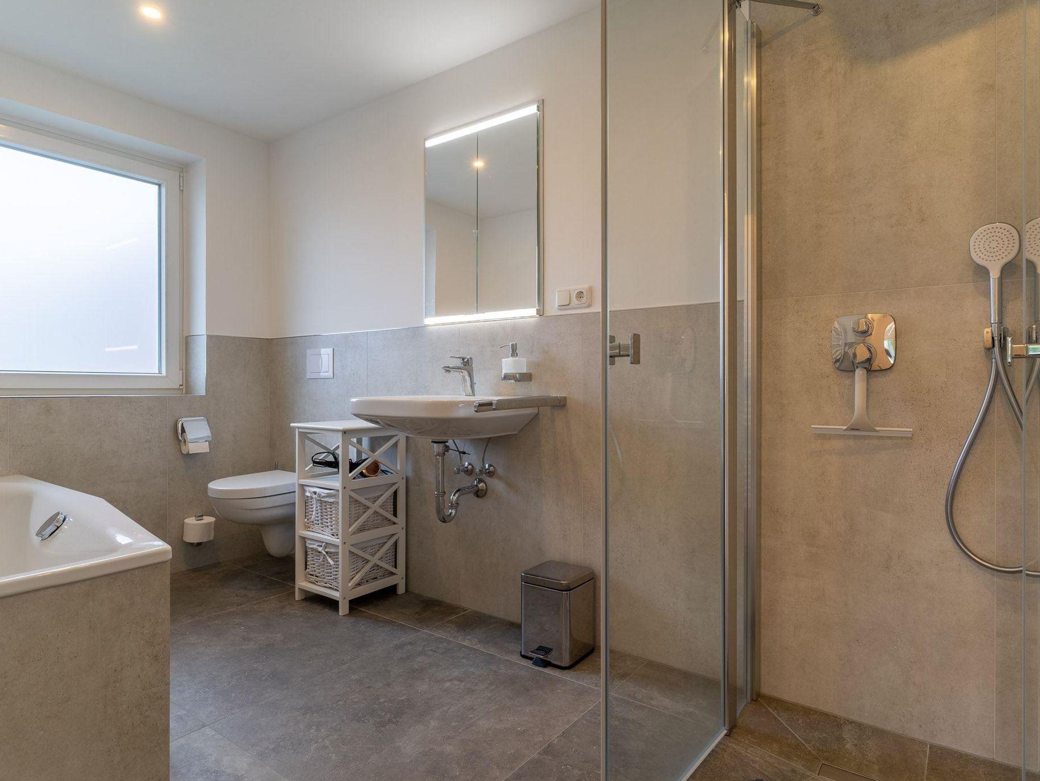 Die Erdgeschoß-Ferienwohnung ist frisch renoviert und besticht durch eine geschmackvoll und zeitlose Einrichtung. Hinter der Eingangstür befindet sich direkt auf der linken Seite das 1. Schlafzimmer mit einem französischen Bett. Über den Flur gelangt man in die großzügige Wohn-Essküche von der man auch Zugang zur Terrasse hat. Im weiteren Flurverlauf hat man zur rechten das 2. Schlafzimmer mit einem 1,80x2,00 m großen Bett und da hinter direkt das Dusch-Wannenbad. Ebenfalls ein Hauswirtschaftsraum grenzt an den Hausflur wo sich die Waschmaschine befindet.