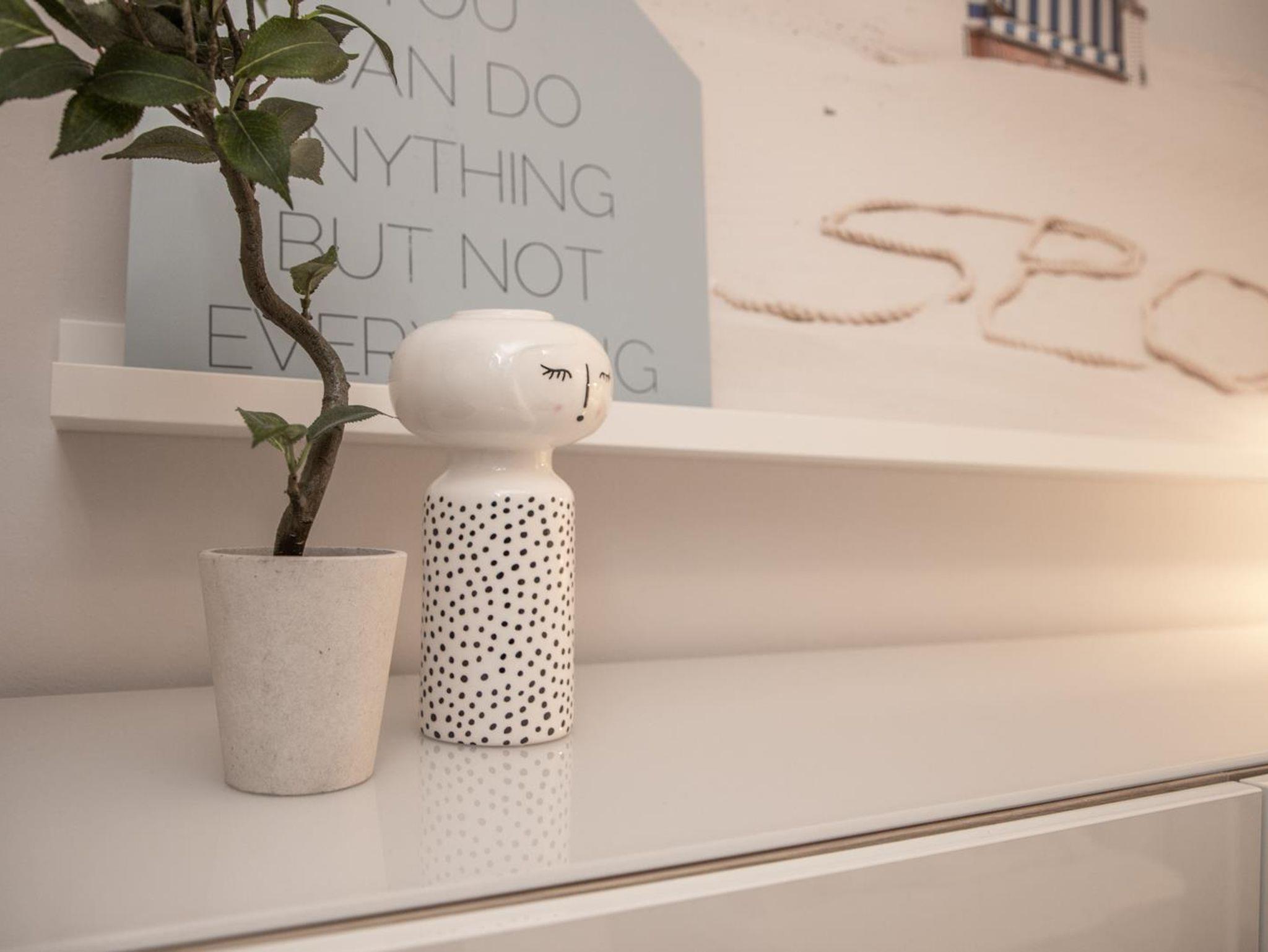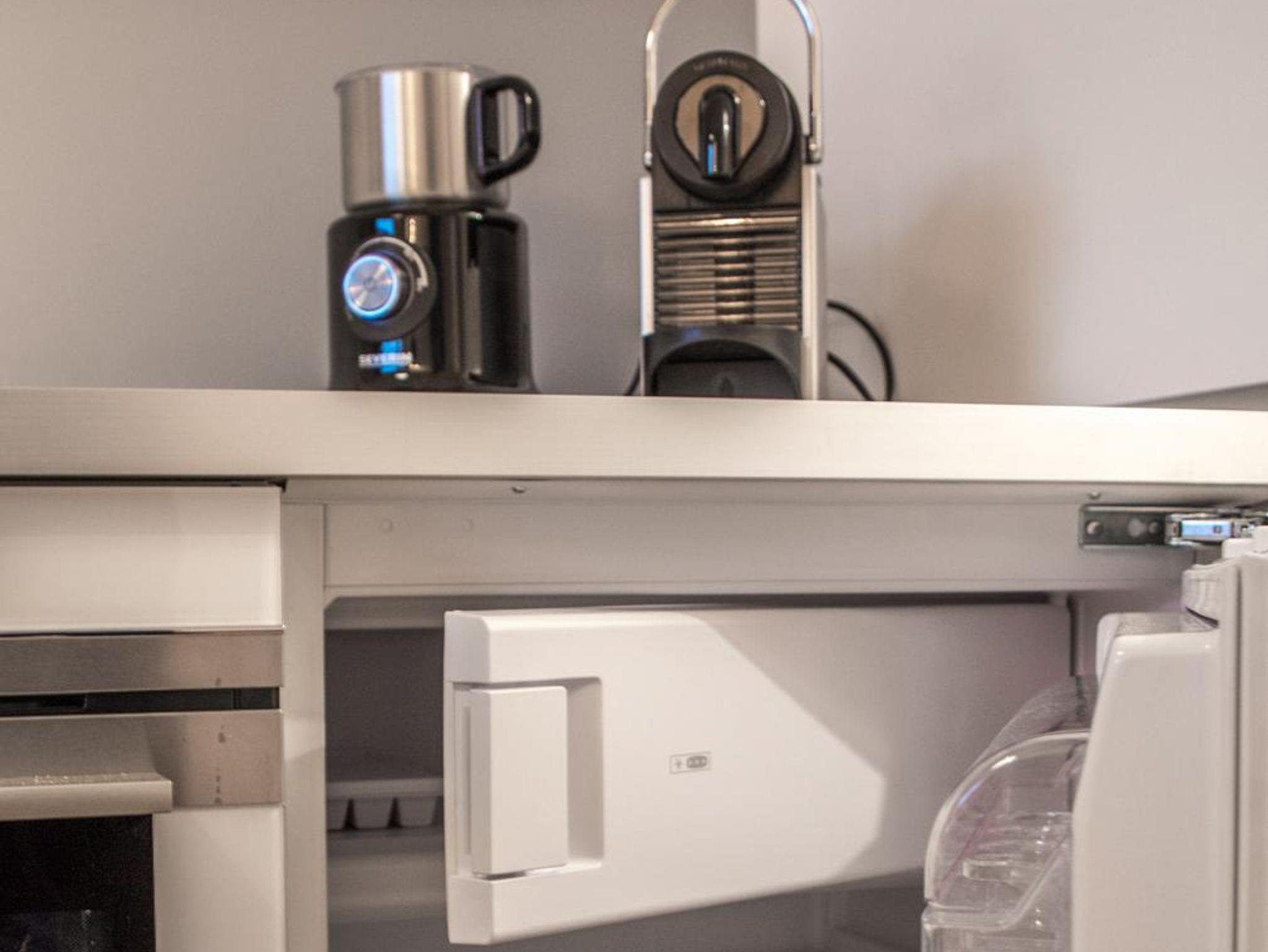 Eine offene Küche ist teilweise in das Wohnzimmer integriert. Eine Trennwand bietet eine schöne optische Trennung beider Bereiche. Der moderne Essbereich liegt direkt neben der Küche. Die Küche ist komplett ausgestattet und verfügt über hochwertige-Küchengeräte inklusive Geschirrspüler, Kühlschrank mit kleinem Gefrierfach, Backofen, Kockfeld, sowie einer Nespress Kaffeemaschine und herkömmlichen Kaffeemaschine. Sie finden auch ein Waffeleisen und weitere Küchengeräte vor.