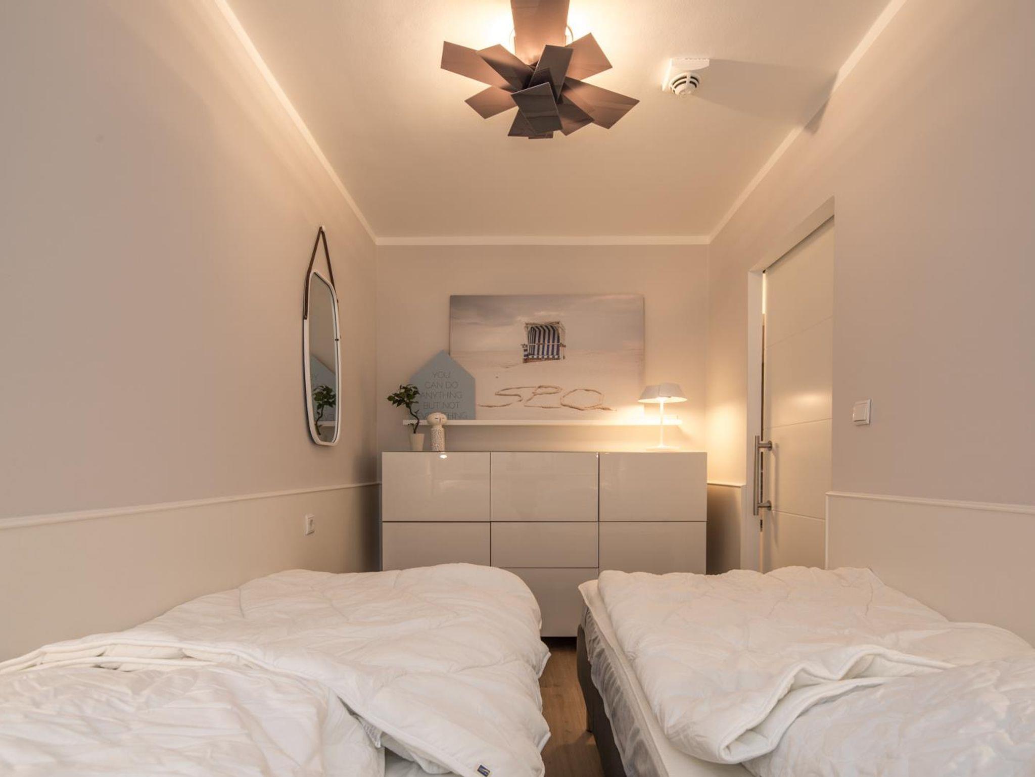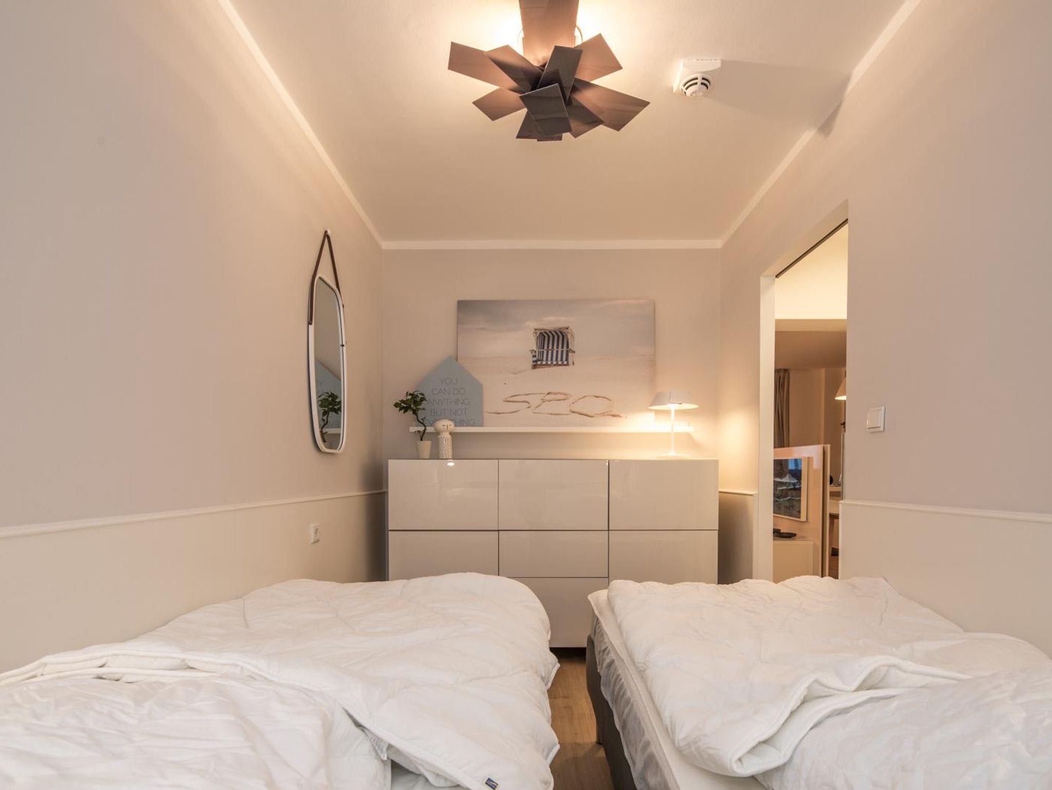 Das Schlafzimmer verfügt über zwei Betten die wahlweise als Einzelbetten oder als Doppelbett genutzt werden können. Neben einem geräumigen Sideboard gehören 2 LED- Leseleuchten zur Ausstattung dieses Raumes. Ein Hoteltresor rundet das Ausstattungspaket ab. Der Raum ist ruhig zur Waldseite gelegen.