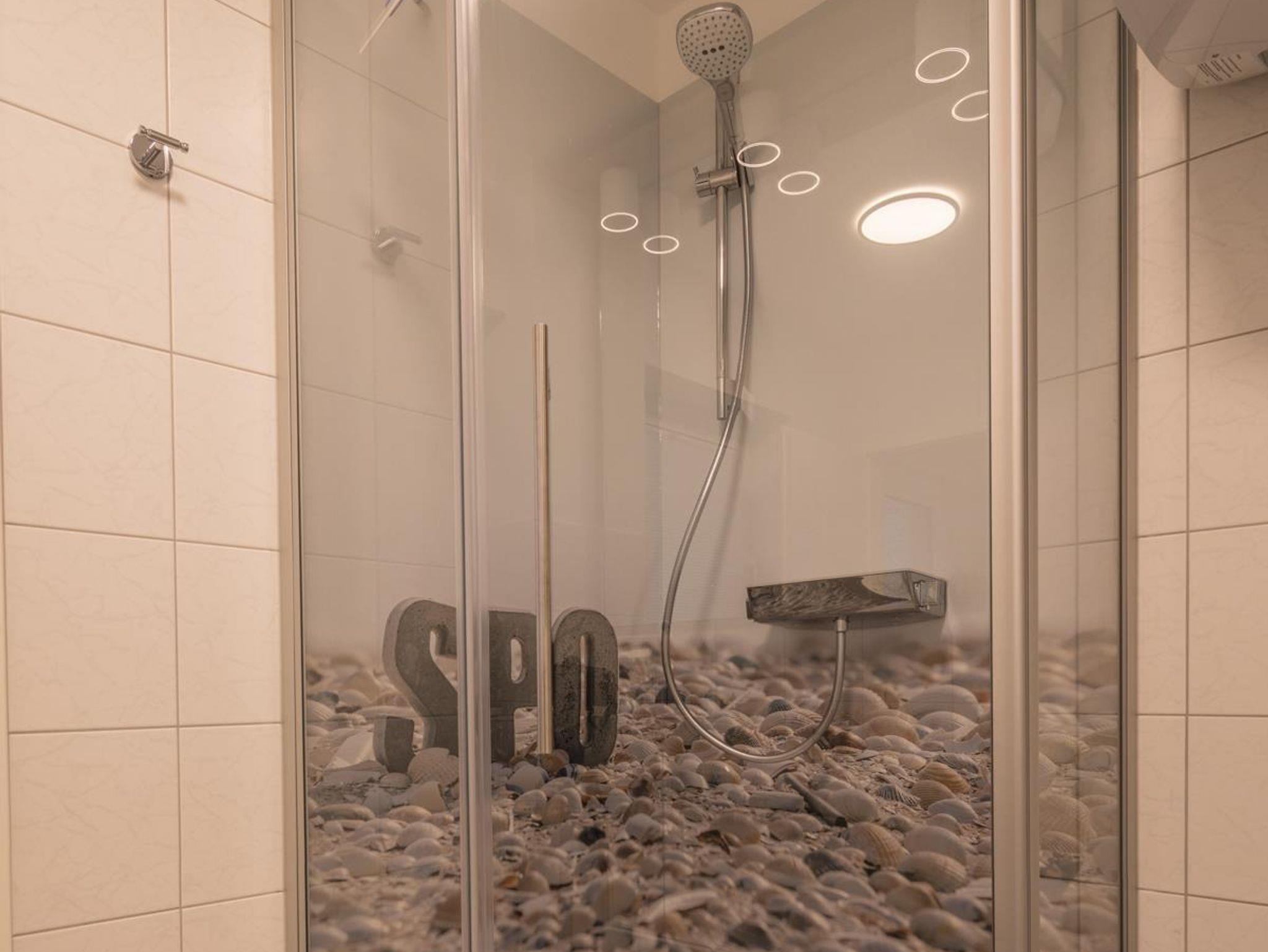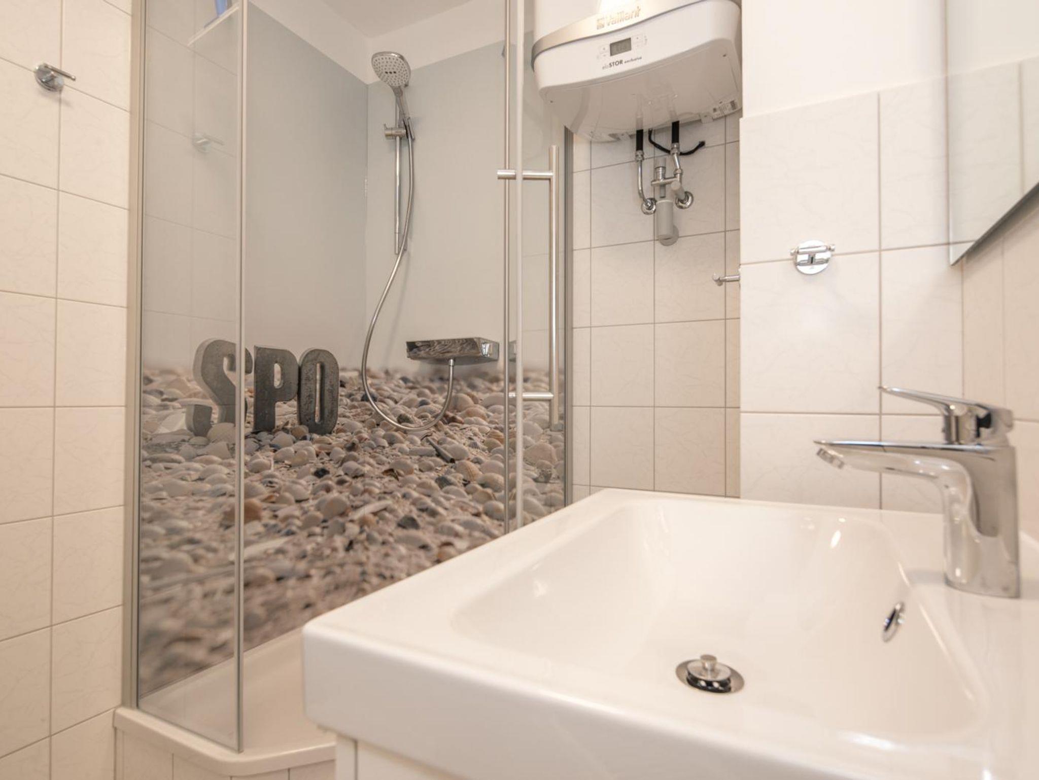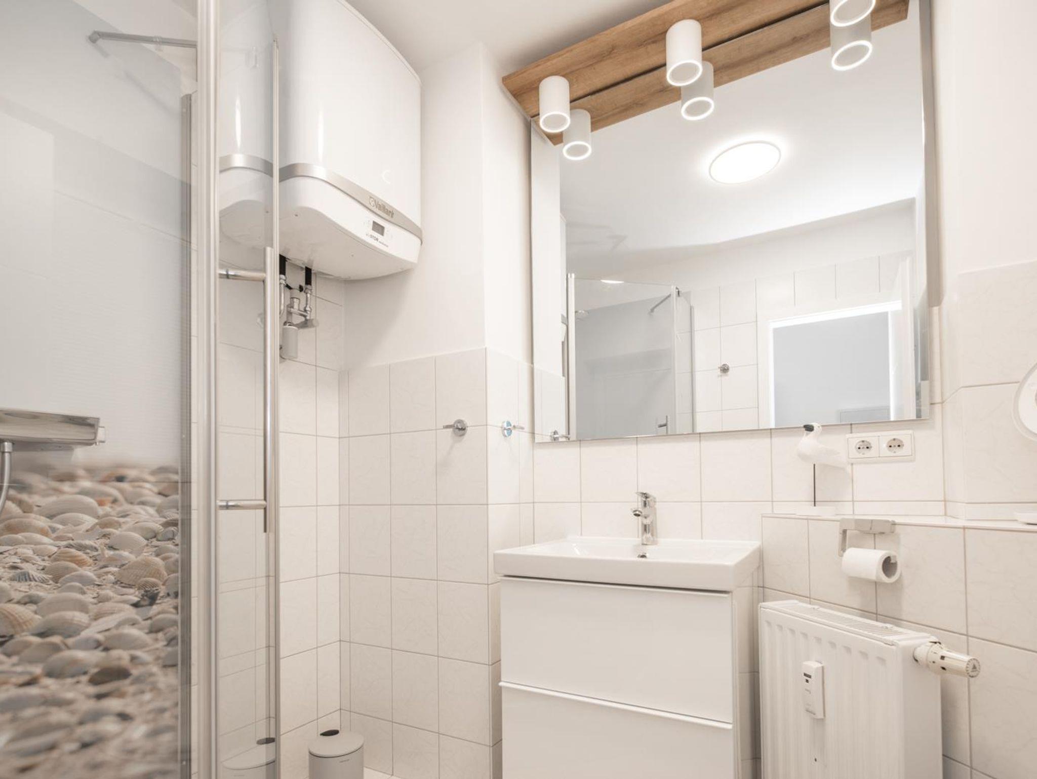 Das Badezimmer im hellen Design ist mit modernen Sanitärobjekten ausgestattet. Der Duschbereich bietet höchsten Komfort mit SPO feeling.