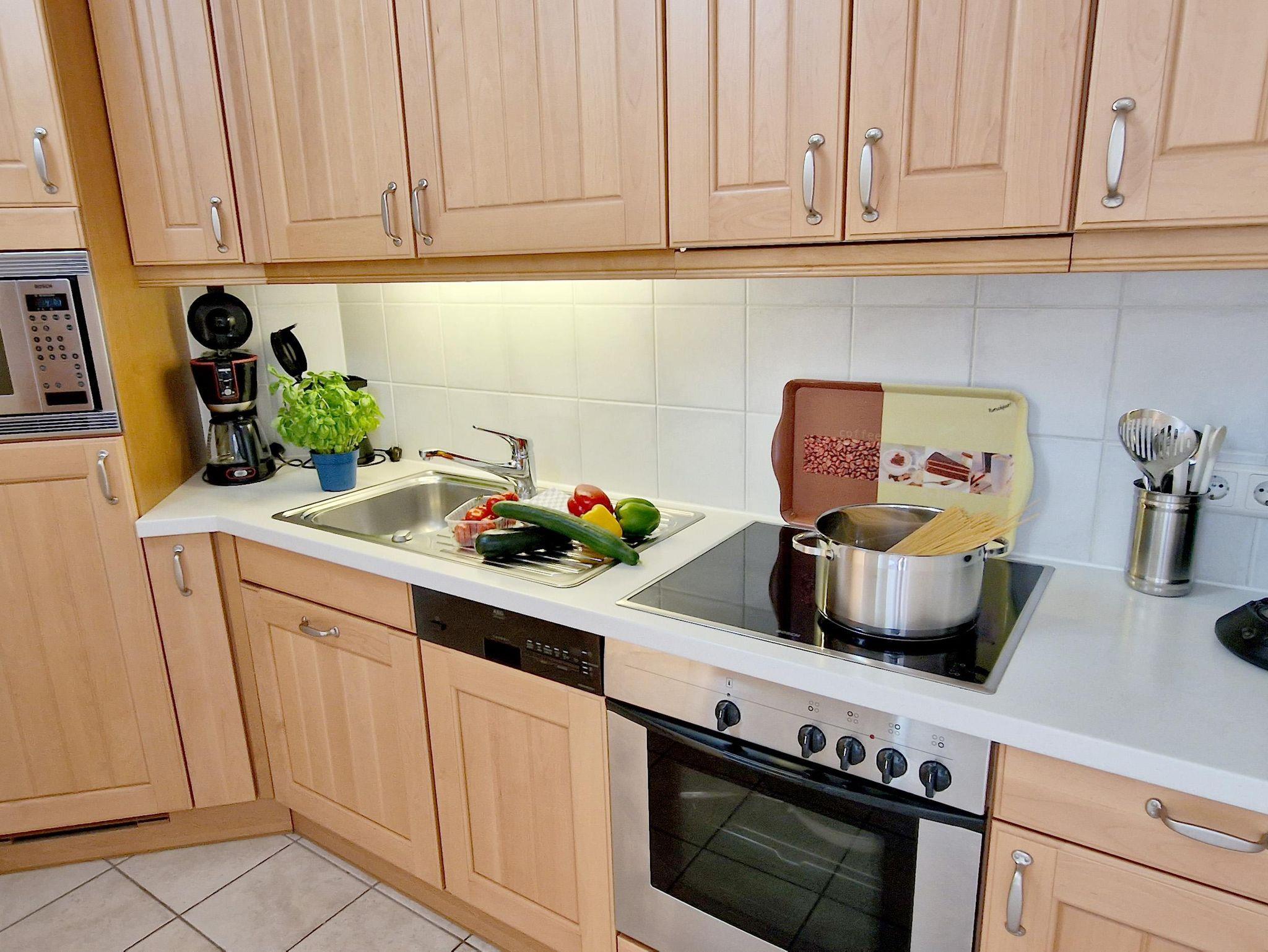 komplett eingerichtete Küche mit Ceranfeld, Mikrowelle, Backofen, Geschirrspüler, Kühlschrank mit Gefrierfach, Wasserkocher, Kaffeemaschine (Filter), Kaffeepadmaschine, Toaster.