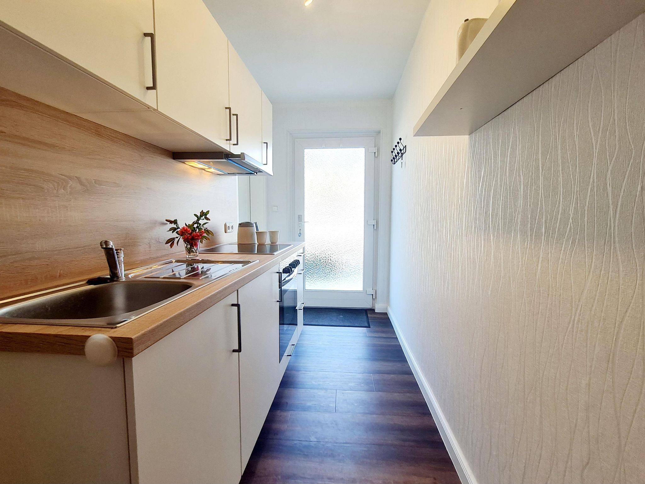 Zum Kochen nutzen Sie die Küchenzeile im Eingangsbereich mit 4-Platten-Herd und Backofen.