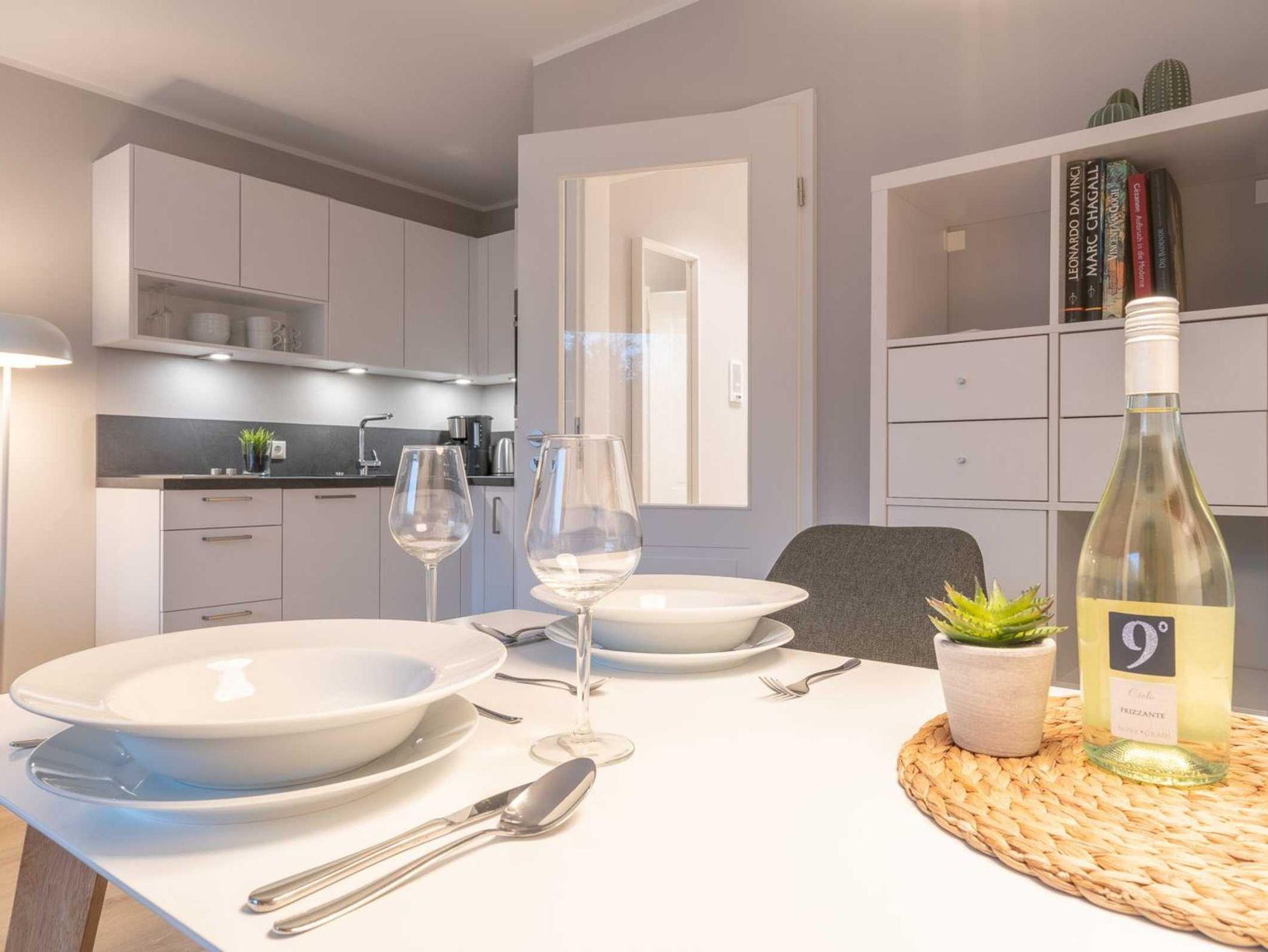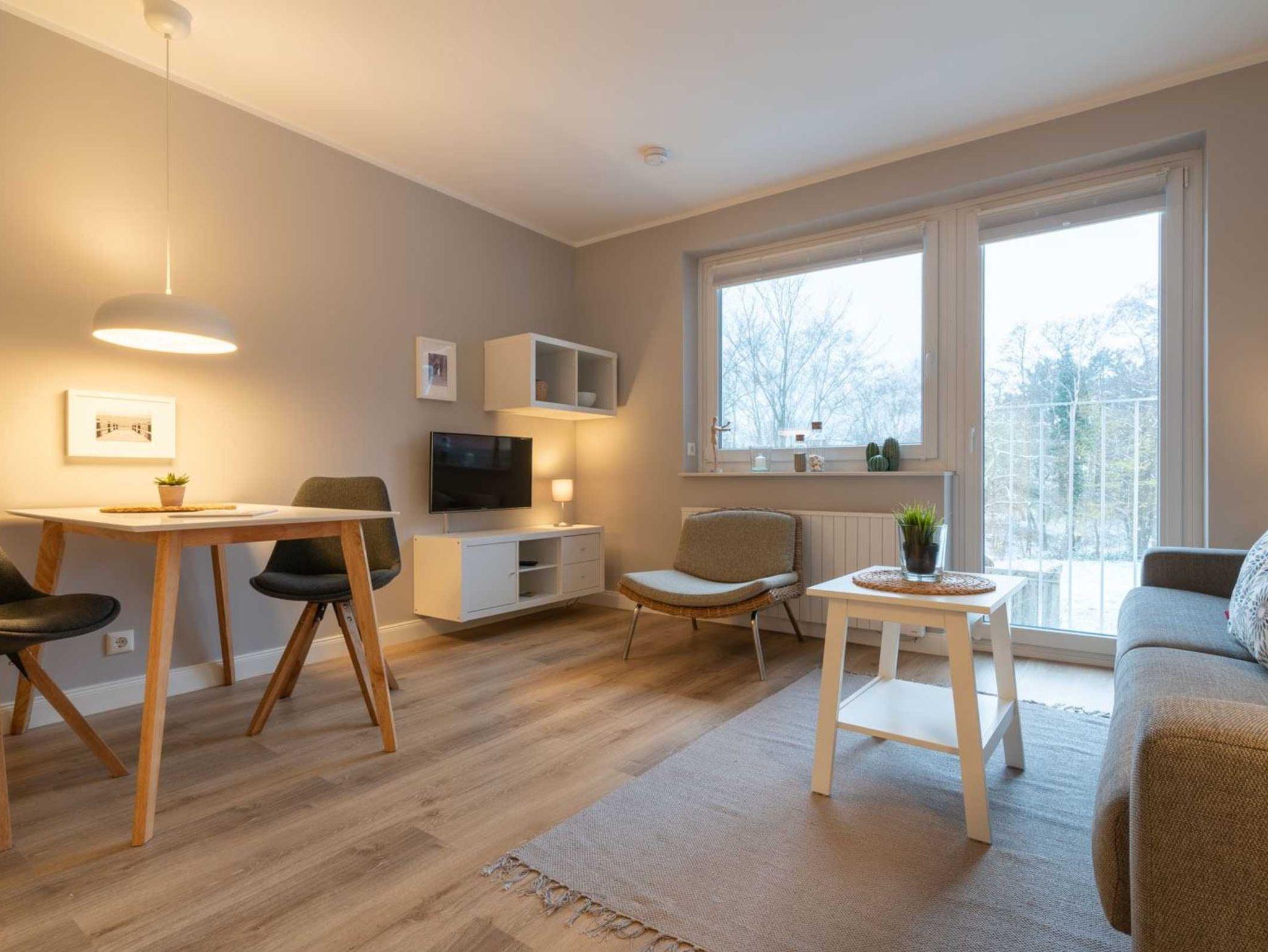 Wohn- und Schlafzimmer mit ausklappbarem Schlafsofa (160x195cm, mit rückenfreundlichem Ergoflex-Lattenrost und Matratze), Sessel, Esstisch für 2 Pesonen, TV (Sat) und CD-Player mit Radio. Französischer Balkon. Offene Küche mit Herd mit 2 Kochstellen, Backofen, Geschirrspüler und Kühlschrank mit Gefrierfach.