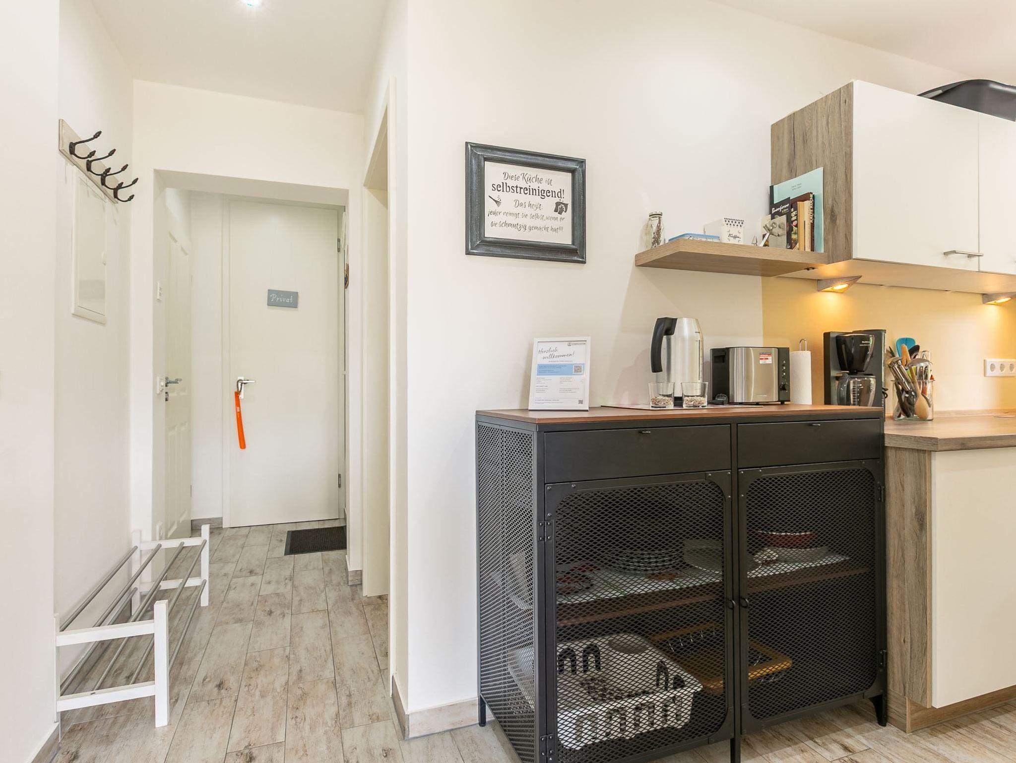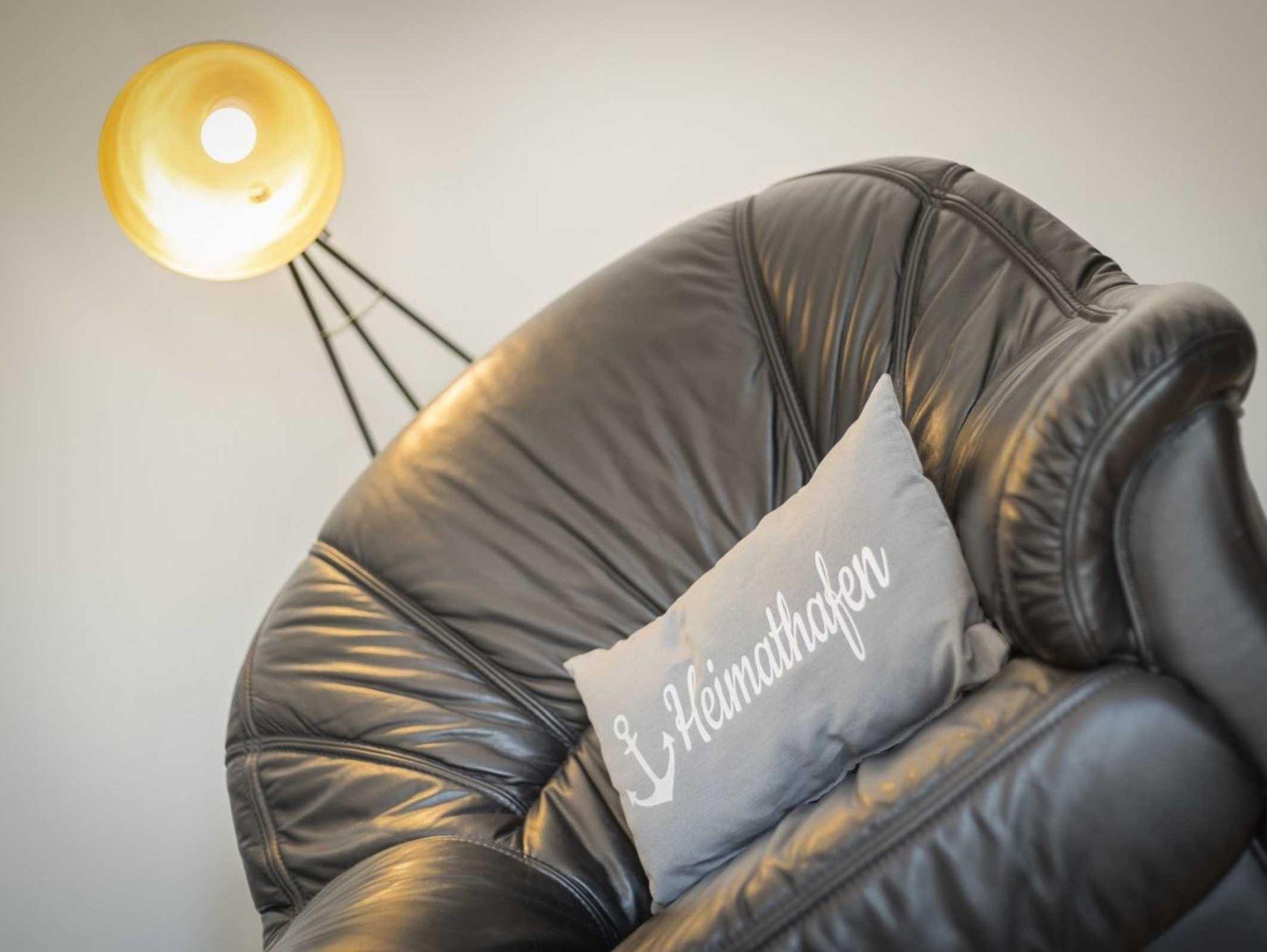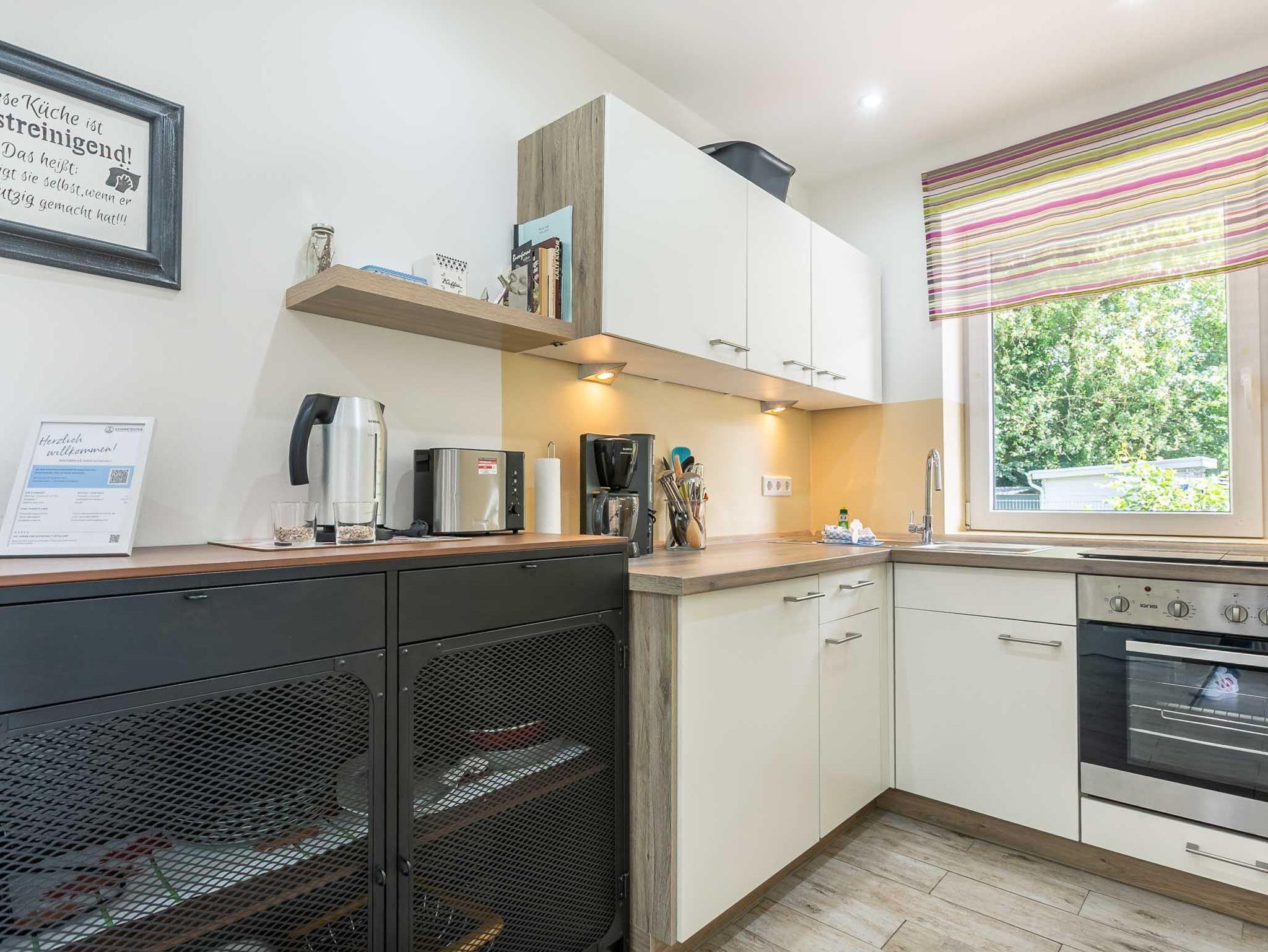 Wohnzimmer mit Schlafsofa (160x200cm), Ledersessel, großem TV (Kabel mit Magenta und Sky), Stereo-Kompaktanlage, BluRay-Player und Esstisch mit 4 Stühlen. Direkter Zugang zur möblierten Garterrasse nach Süden mit Strandkorb (ab 2020). Offene Küche mit Backofen und Kühlschrank mit Gefrierfach.