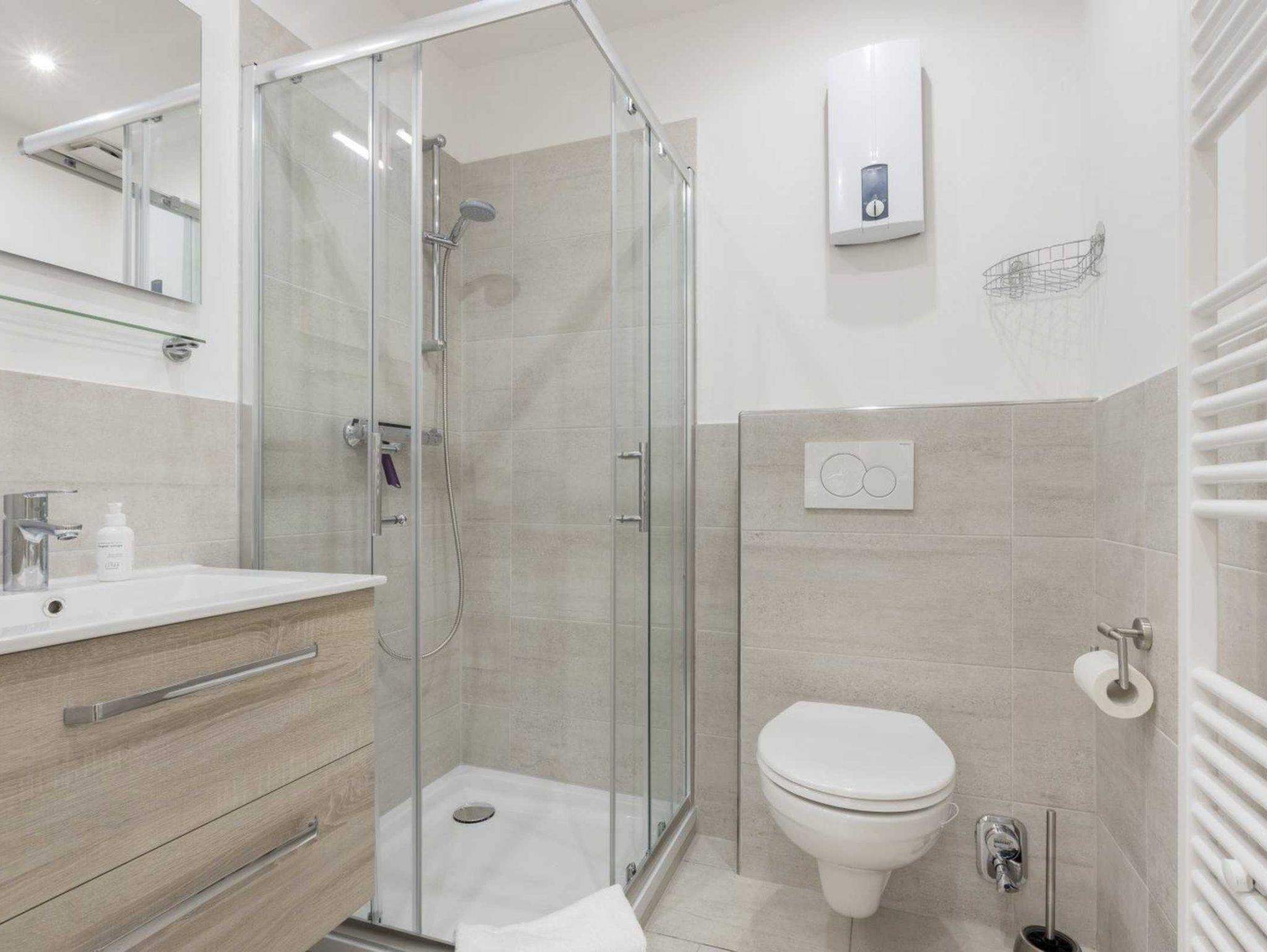 Badezimmer (Duschbad) mit Dusche, WC, Handtuchwärmer und Föhn.
