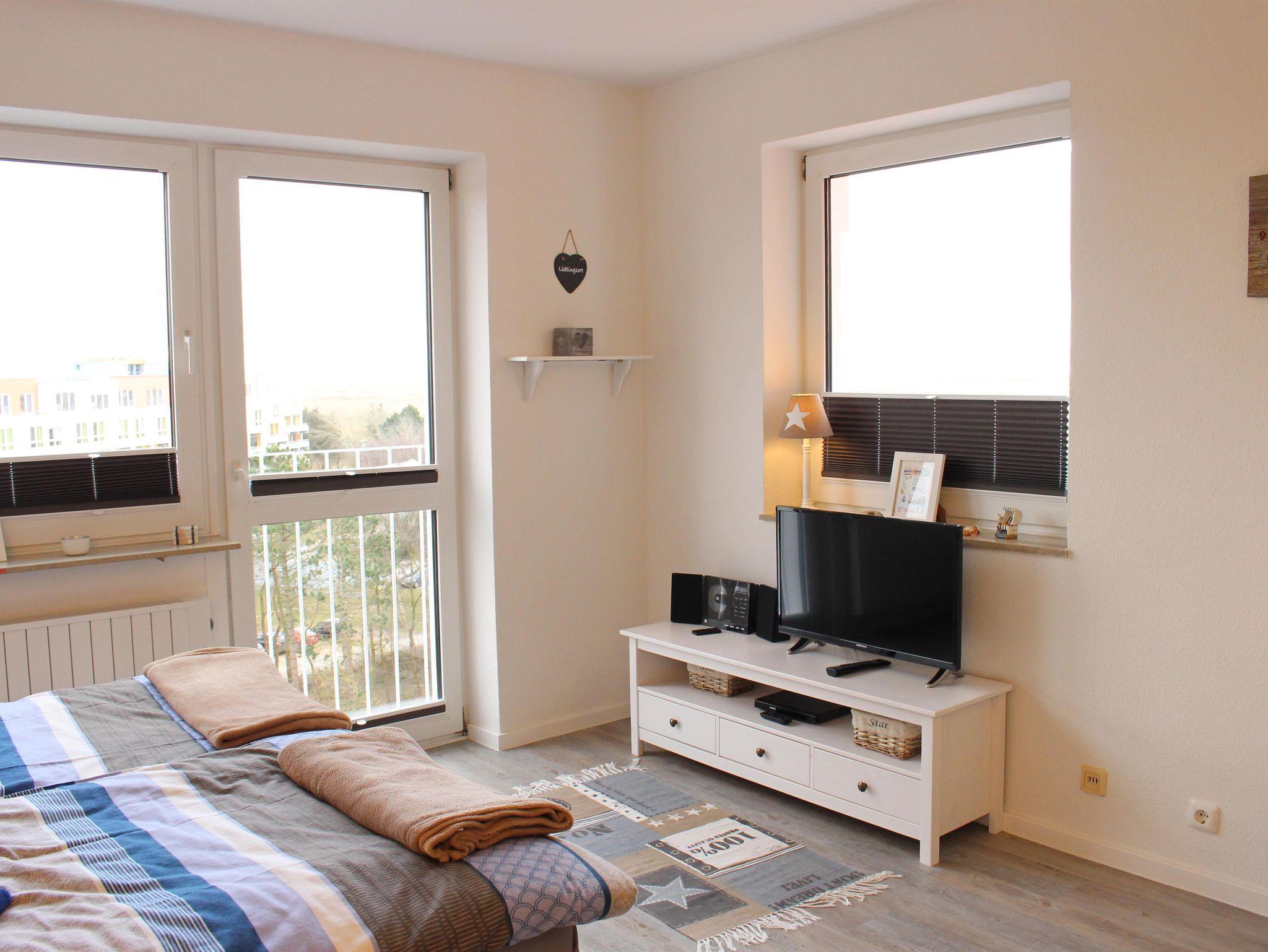 Das 1-Raum-Appartement befindet sich in der 7. Etage zur Seeseite mit Blick auf den großen Sandstrand.