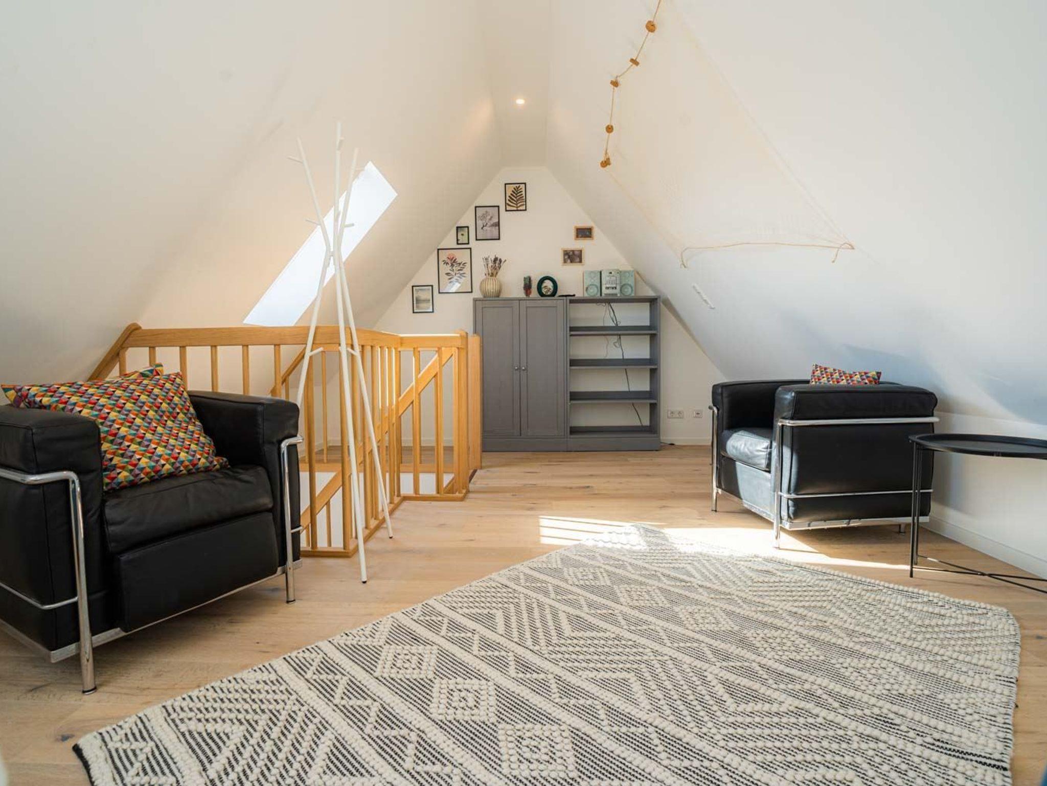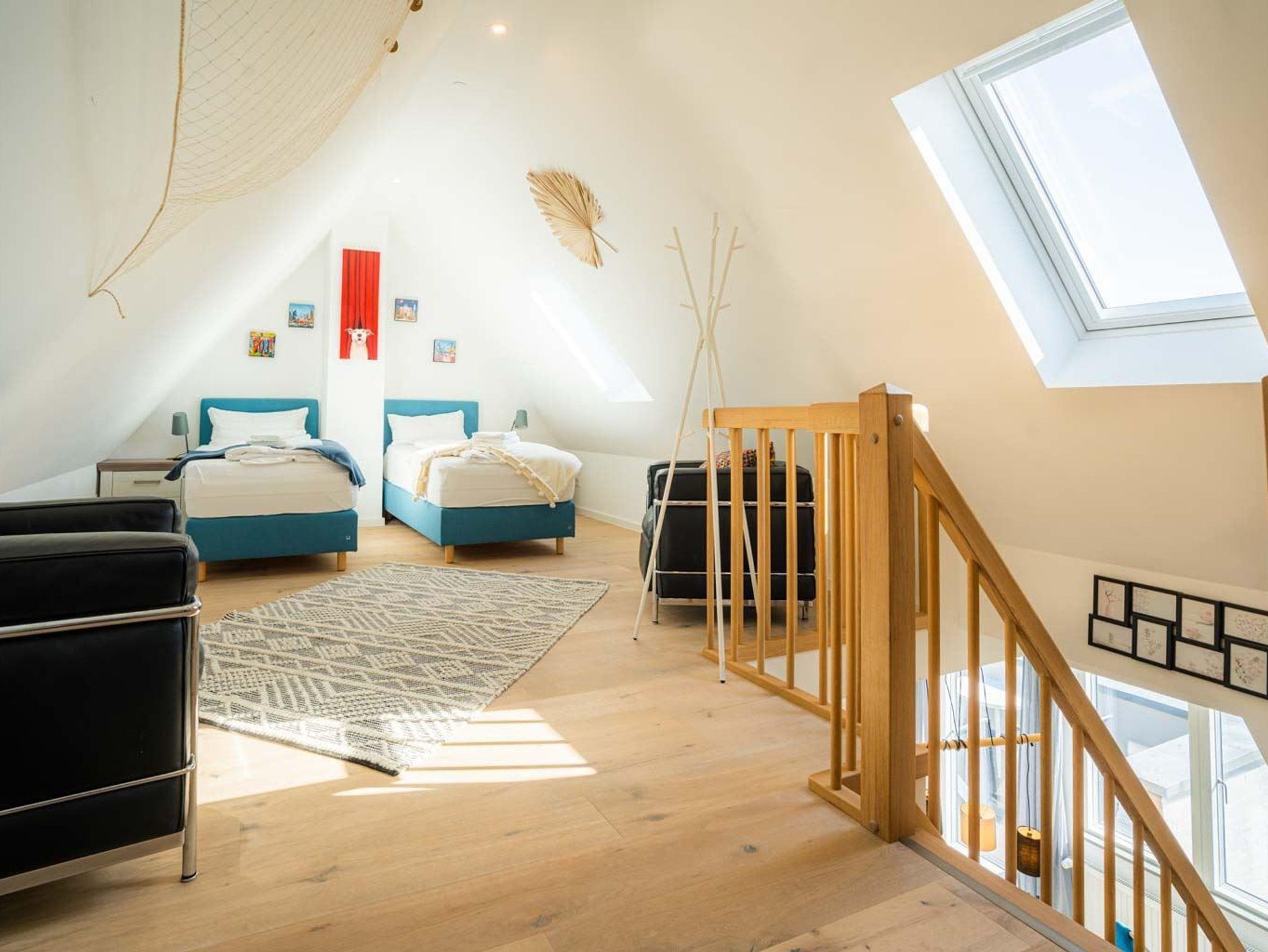 3. Schlafzimmer (galerieartig halboffen zum Wohnzimmer) mit 2 Einzelbetten (je 90x200cm), 2 Ledersesseln, Regalschrank, Garderobenständer und Stereokompaktanlage.