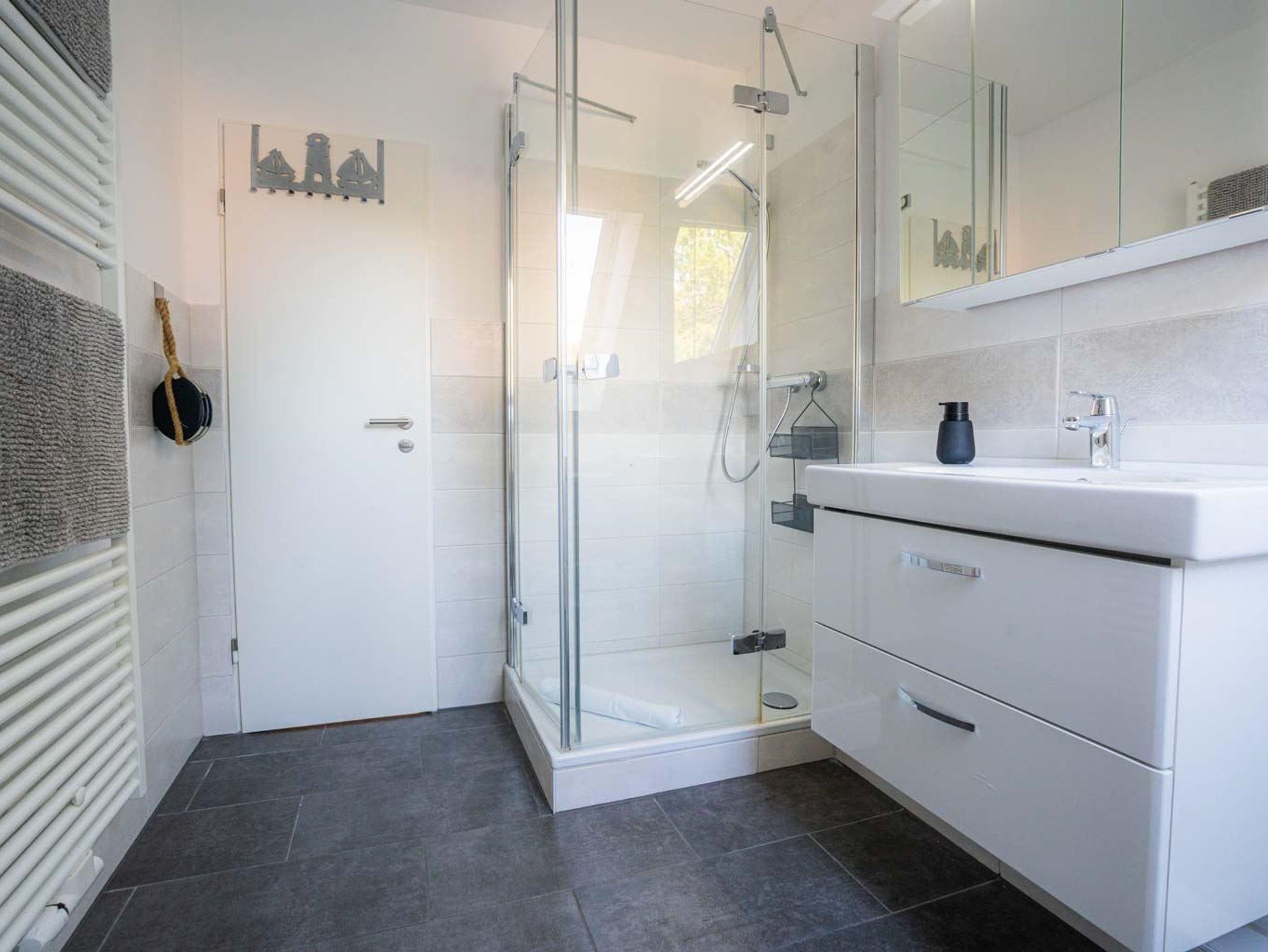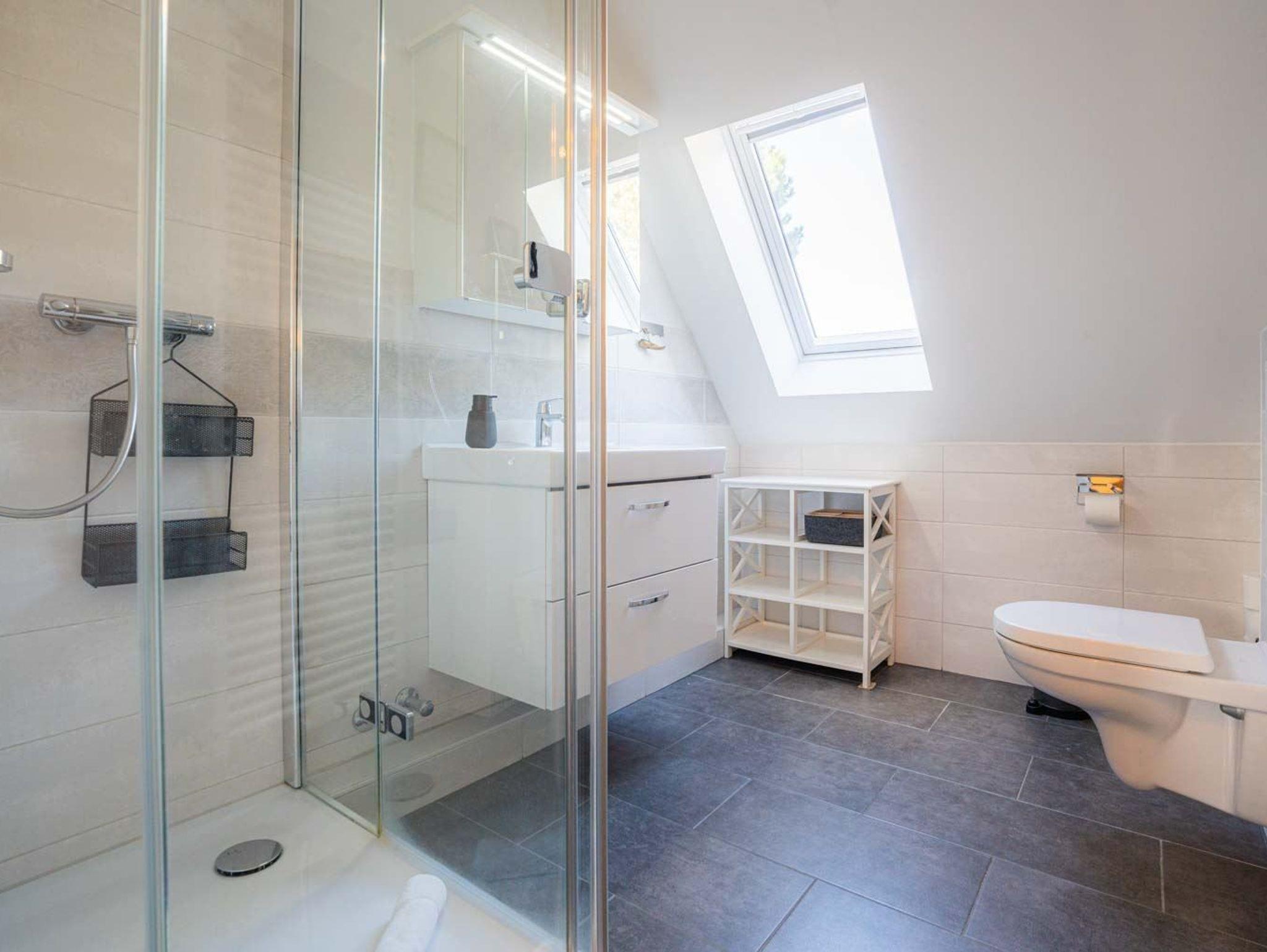 Badezimmer (Duschbad) mit Dusche, WC, Handtuchwärmer, Föhn und Tageslicht.