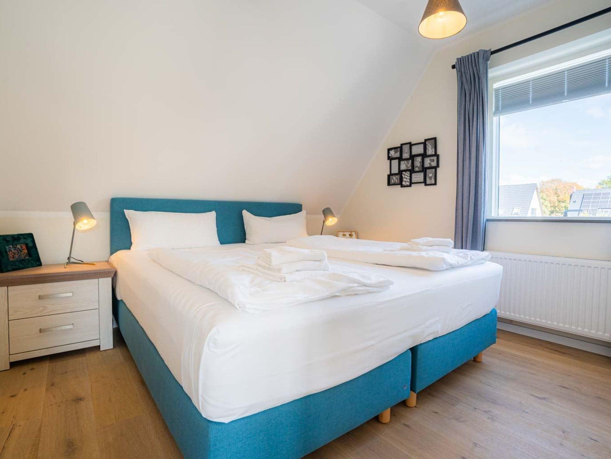 1. Schlafzimmer mit Doppelbett (180x200cm, Boxspring) und Einbaukleiderschrank.