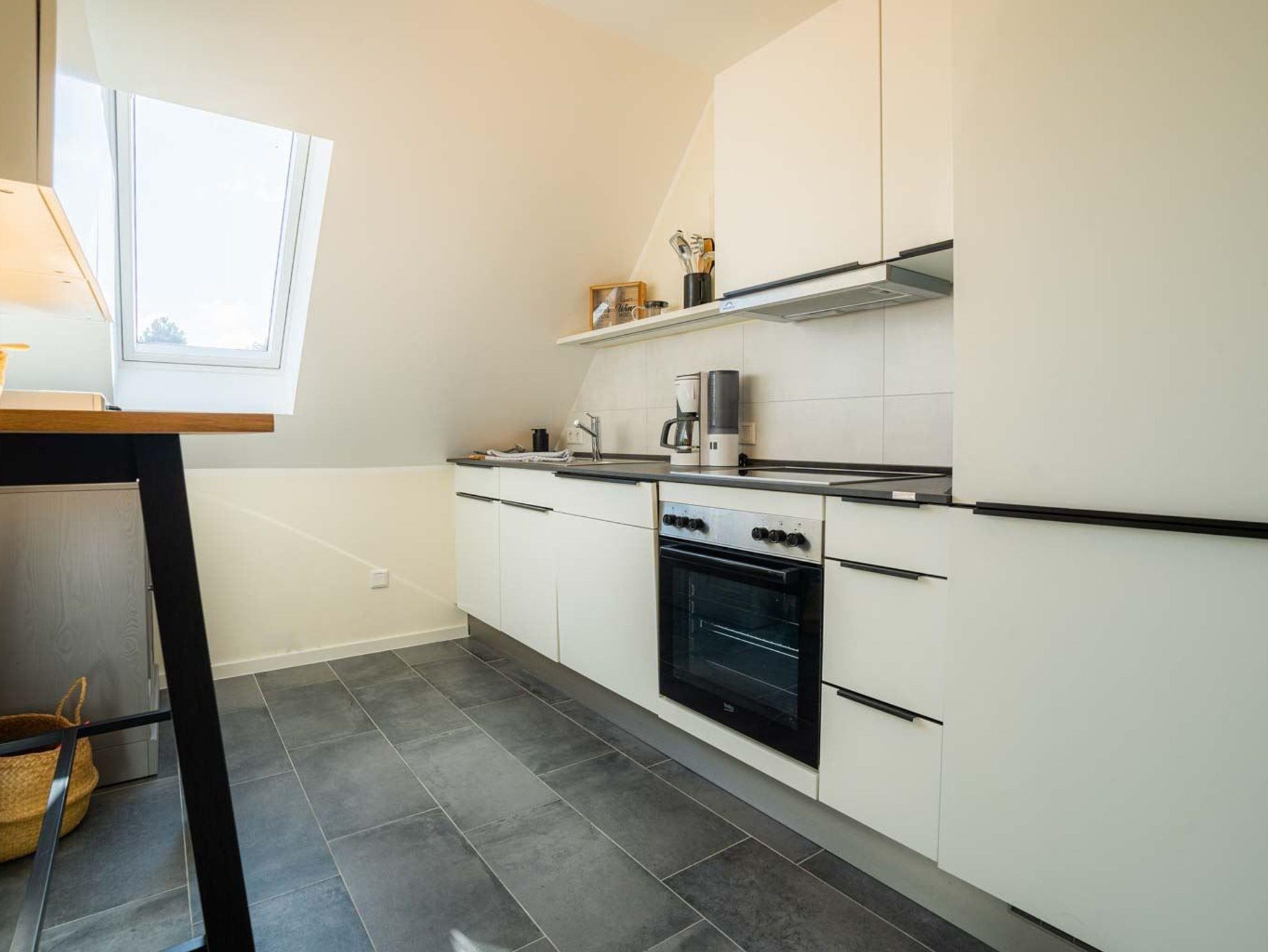 Separate Küche mit Backofen, Mikrowelle, Geschirrspüler und Kühl-Gefrier-Kombination.