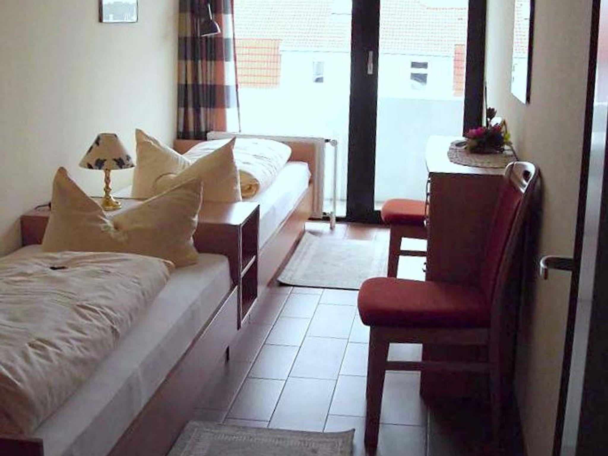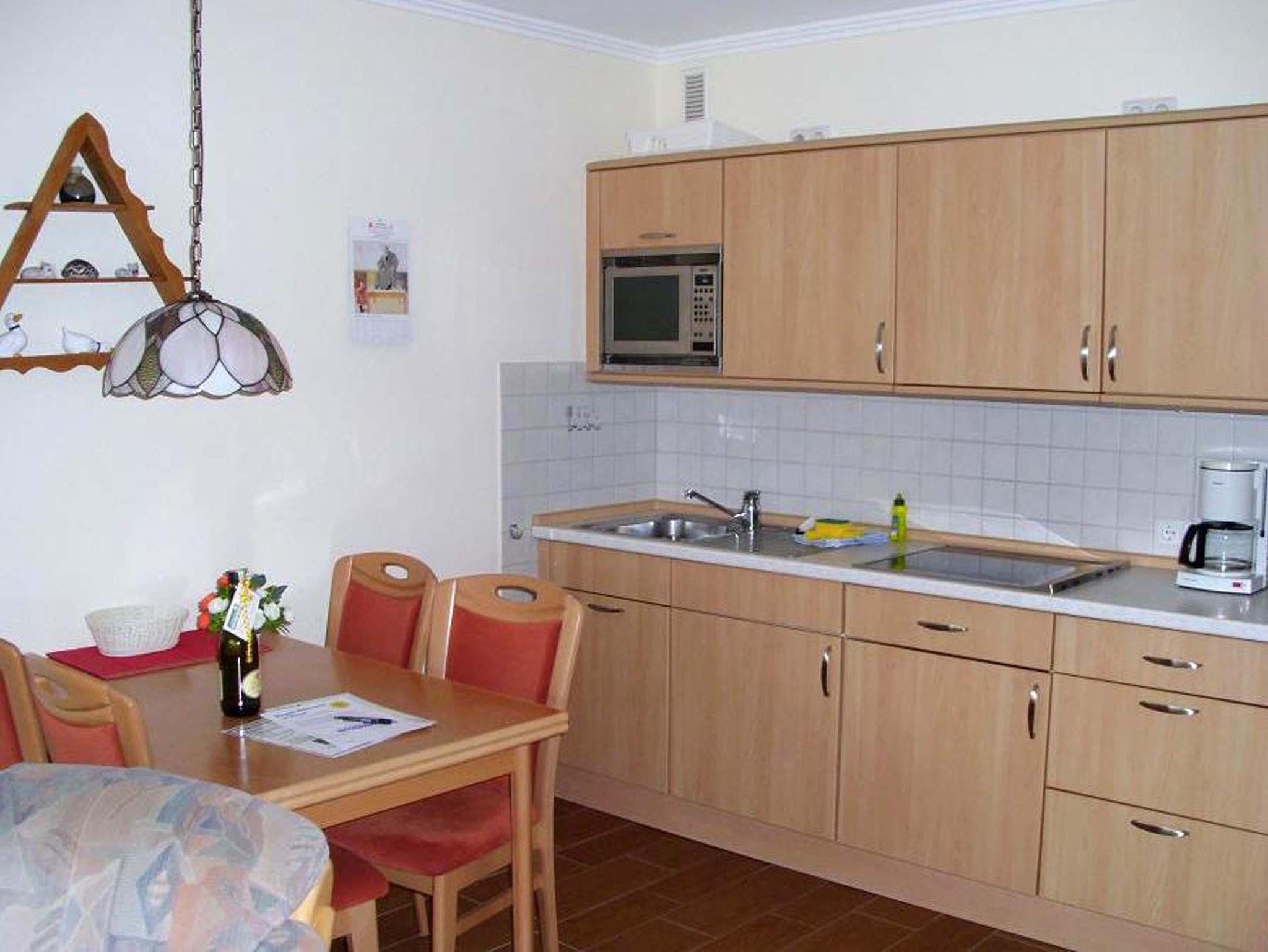 Schlafraum mit 2 Einzelbetten, Wohn-Schlafraum mit 2 Wandschrankbetten, Holzfußboden, Sitzecke, Essecke, Küchenzeile mit Mikrowelle, Dusche/WC, Durchwahltelefon, Kabel-TV, Balkon, PKW-Platz-Nr. 51, Aufzug und Fahrradkeller vorhanden.