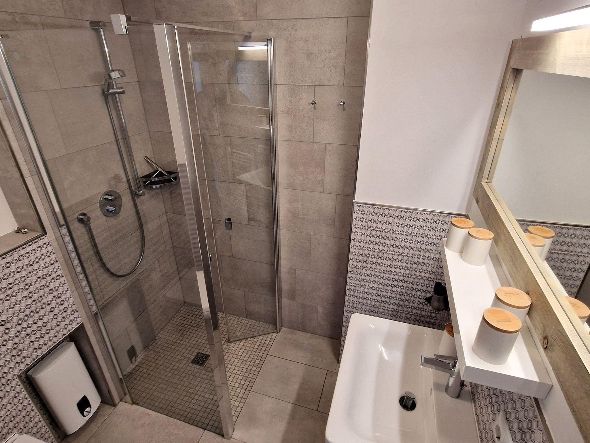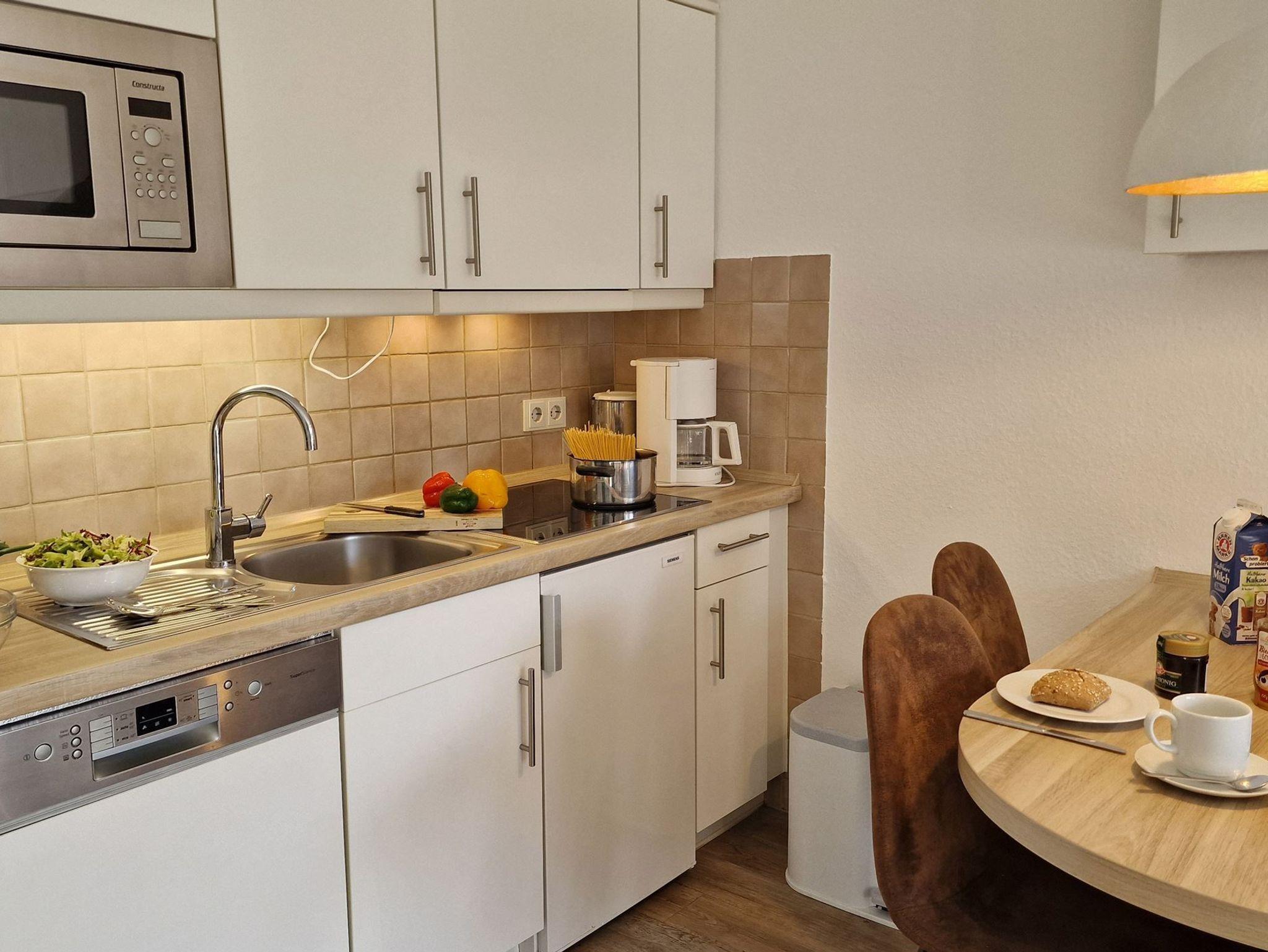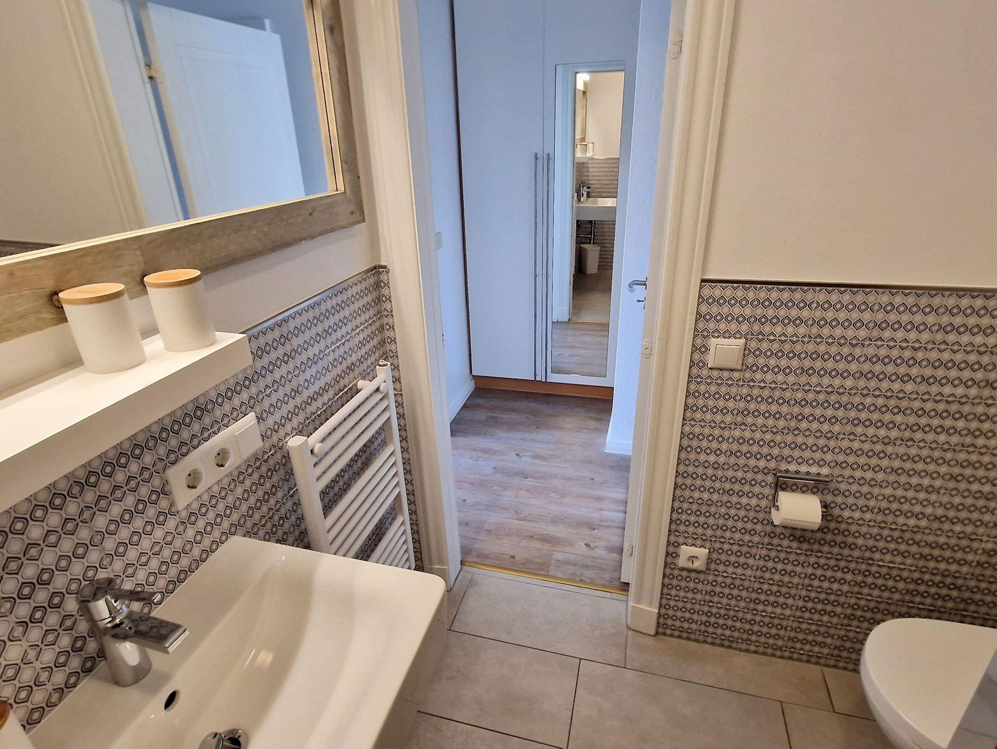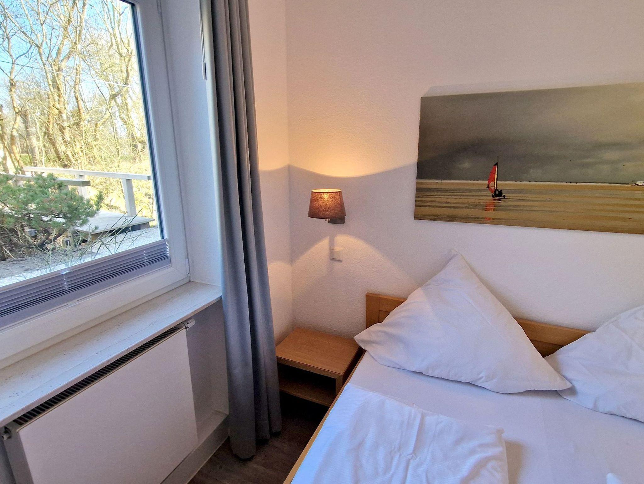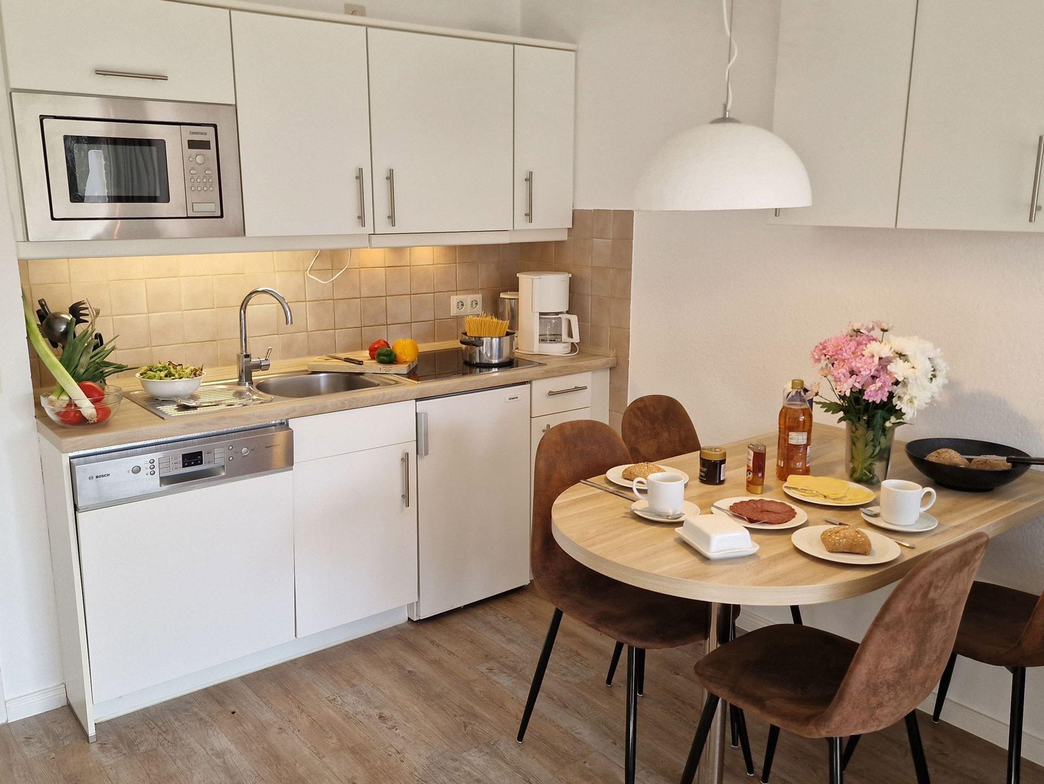 Sie teilt sich wie folgt auf: Eingangsdiele mit Garderobe, Schlafzimmer mit Doppelbett, Duschbad mit WC. Der großzügige Wohnraum mit direktem Zugang zur Terrasse und Garten überzeugt mit seiner gemütlichen Sitzecke mit direktem Blick nach draußen, moderne, weiße Küche, Essecke und als weitere Schlafmöglichkeit 1 Doppelschrankbett. Die Fußböden der Ferienwohnung sind aus Designerparkett oder Fliesen, Allergikergeeignet.