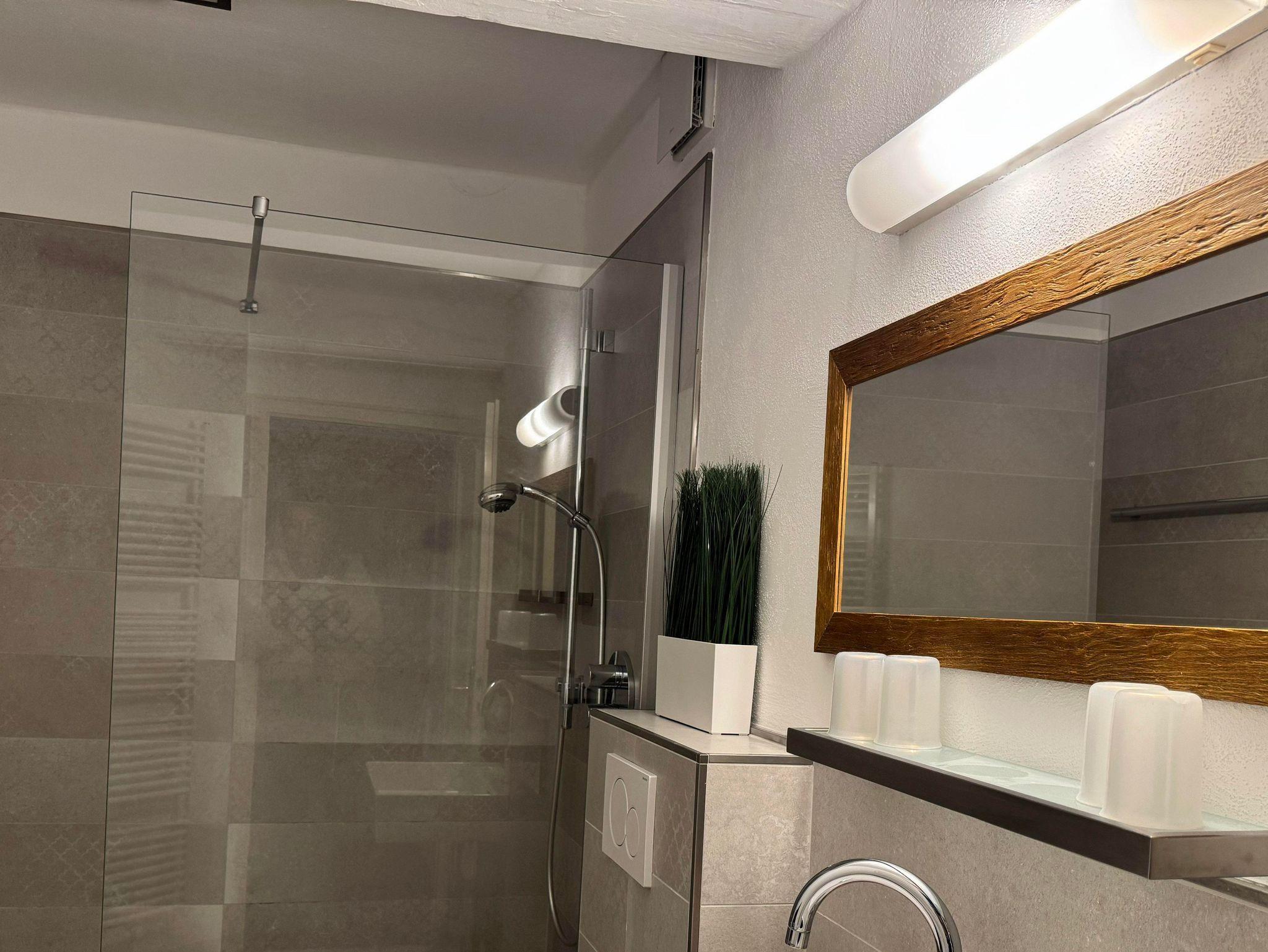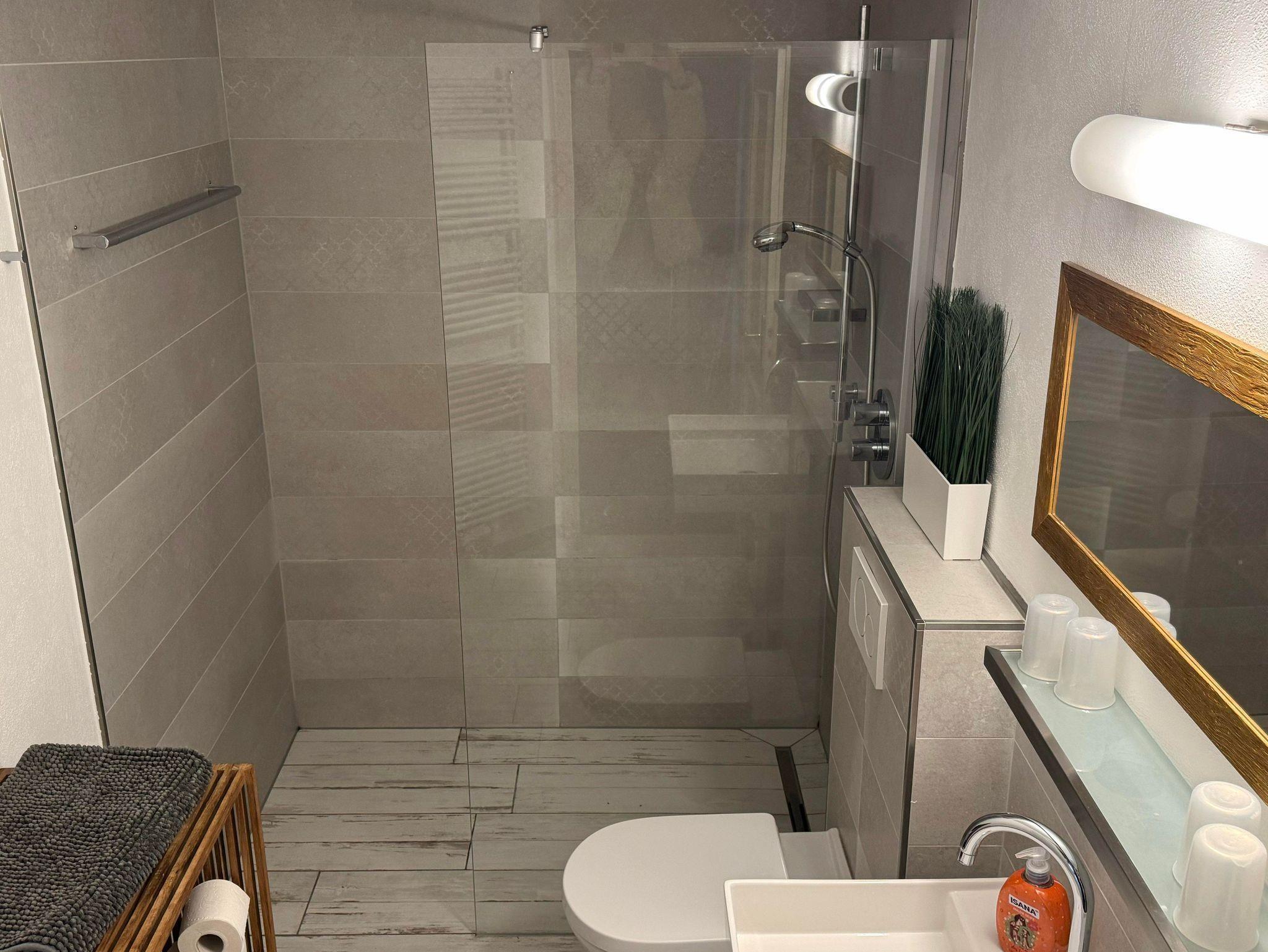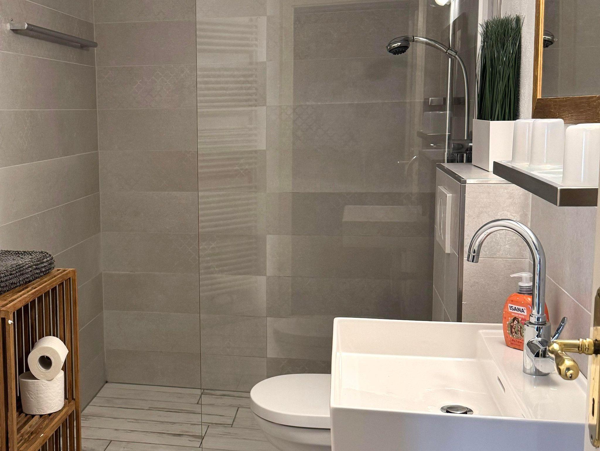 In den Schlafräumen sind noch die alten Holzfußböden erhalten, der restliche Bereich wurde gefliest, sichtbare Deckenbalken und Füllungstüren geben der Wohnung den besonderen Charme. Beide Wohnungen sind für 4 Personen ausgelegt und haben jeweilig Terrassen mit Strandkorb und Gartenmöbeln.
