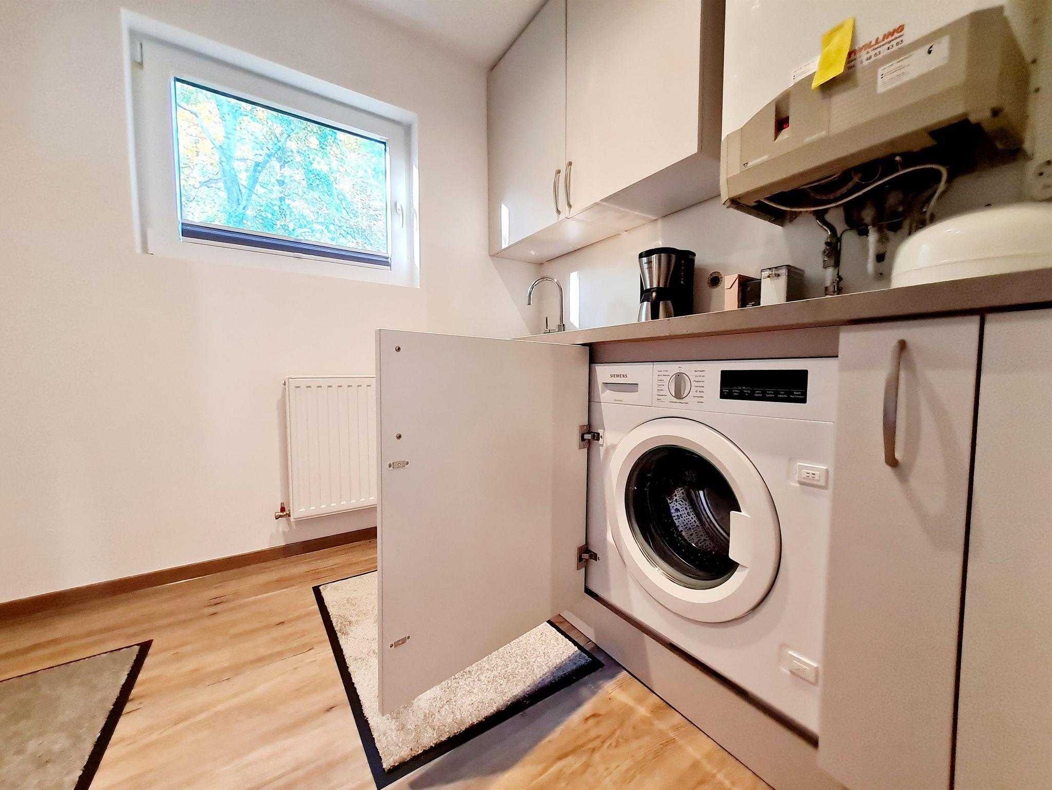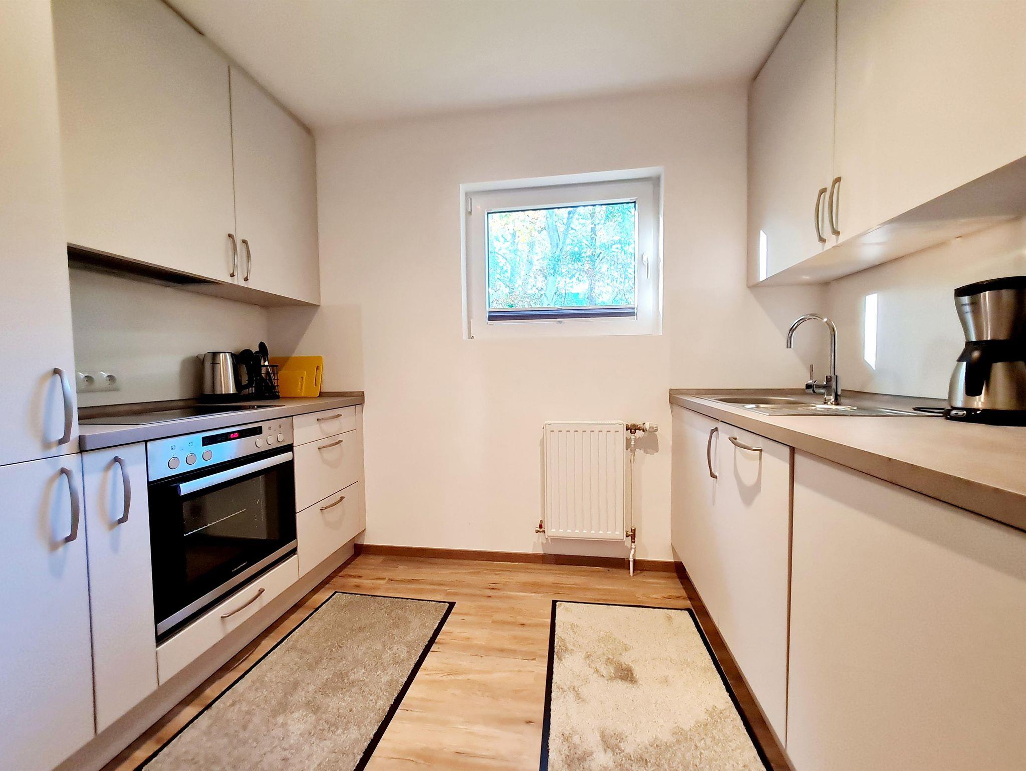 Großzügiger und moderner Wohnbereich mit Sitzgruppe, Essbereich, komplett ausgestattete Küche mit Geschirrspüler, Ceran-Feld, Backofen und Waschmaschine.