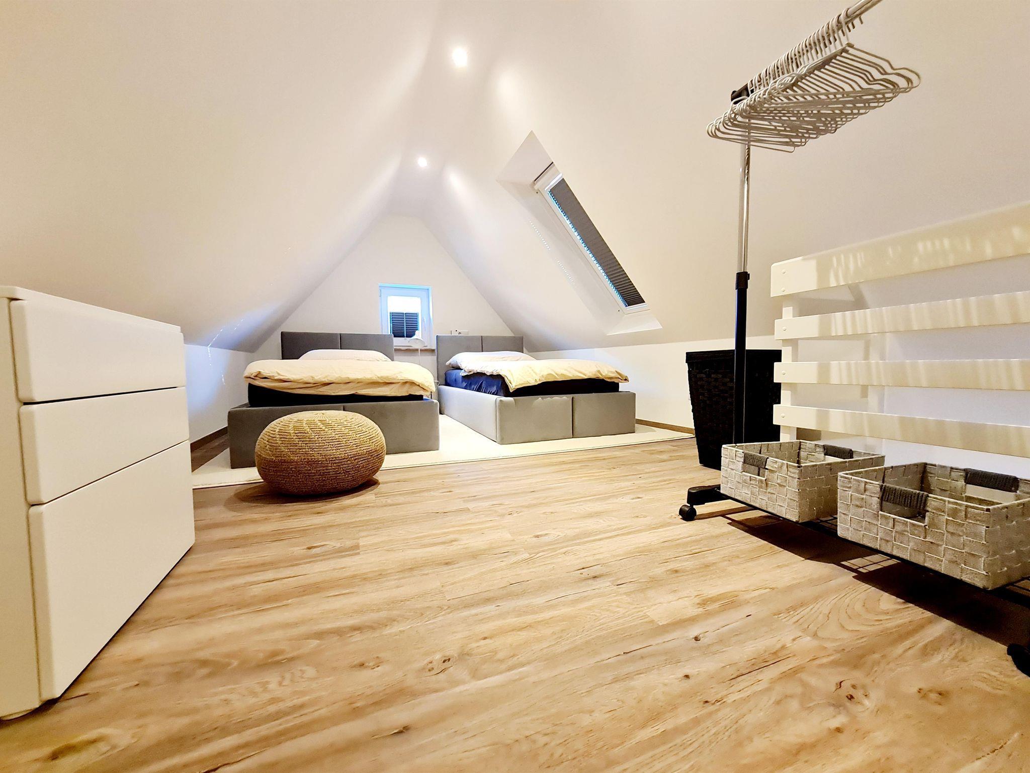 Das Schlafzimmer befindet sich im Dachgeschoss.
