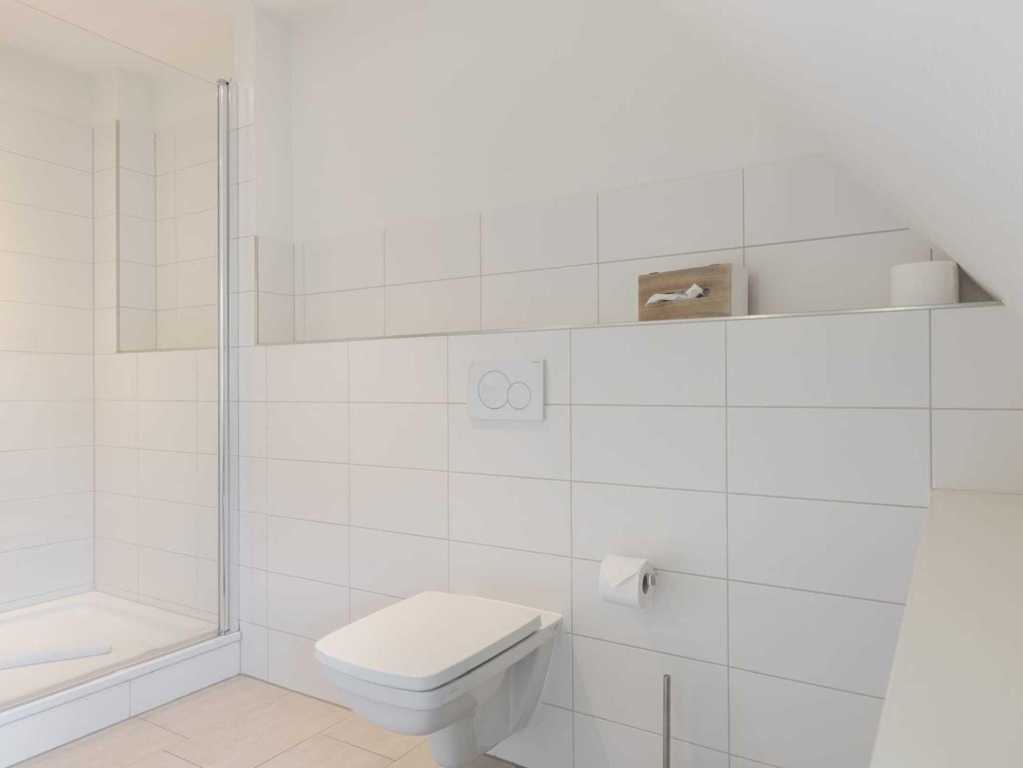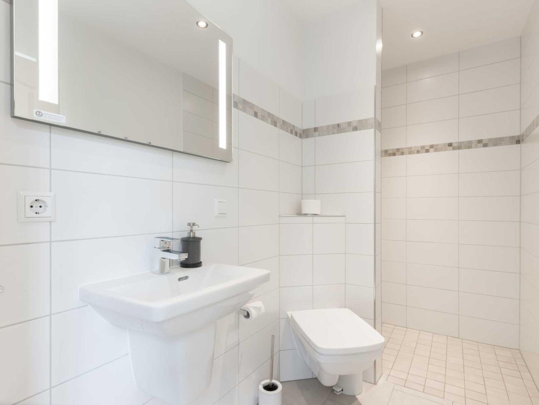 1. Badezimmer mit bodengleicher Dusche, WC und Tageslicht.