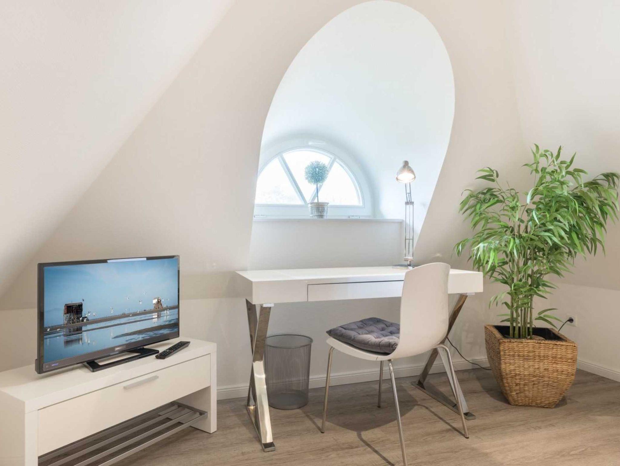 Arbeitszimmer mit Schreibtisch, Stuhl, TV und ausziehbarem Schlafsessel (für Jugendliche).