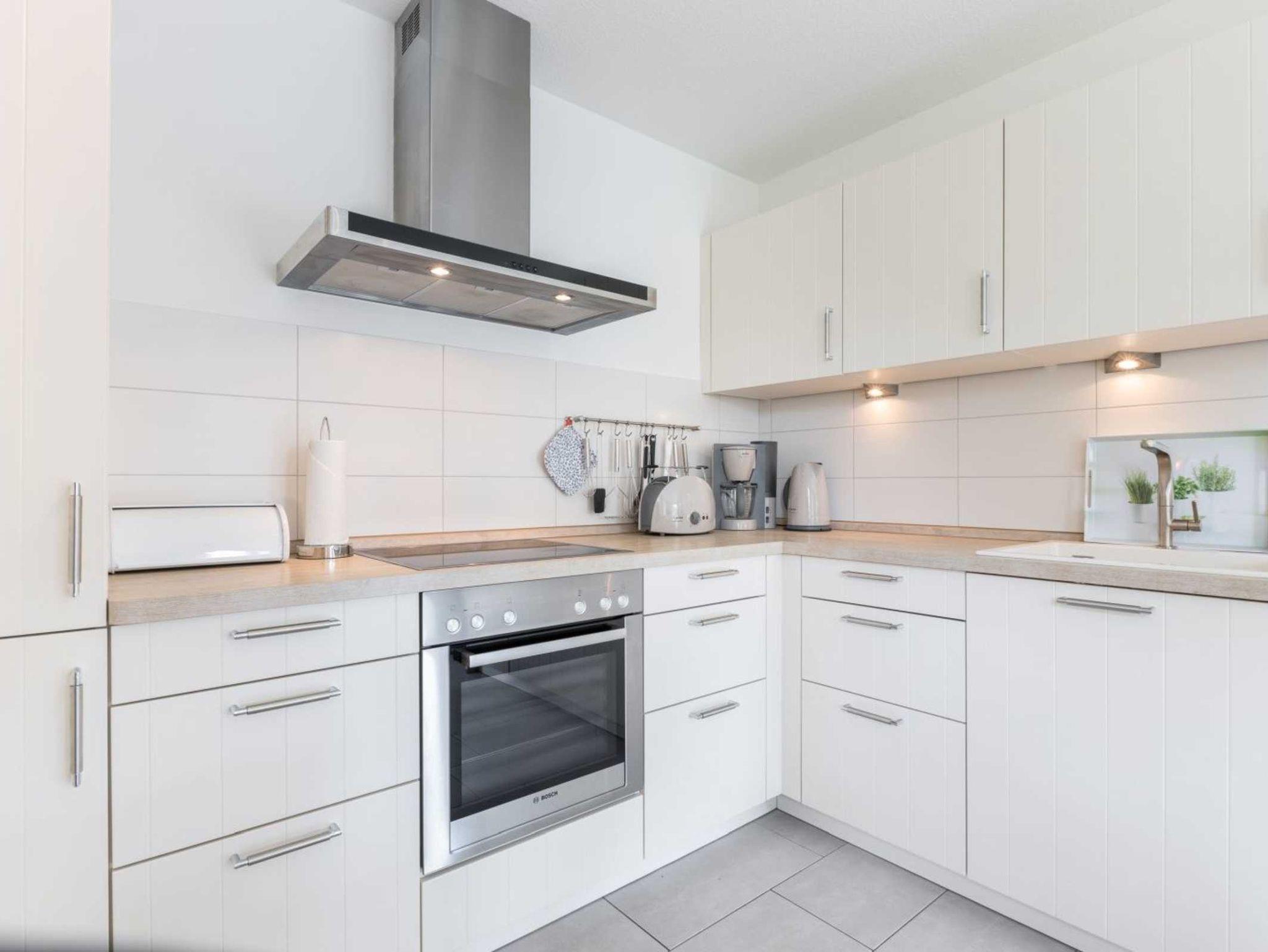Wohnzimmer mit Sofa (2-3 Personen), 2 Korbsesseln, Kaminofen, TV (Kabel), BluRay-Player, Esstisch mit 5 Stühlen und zwei Austritten in den Garten. Direkter Zugang zur möblierten Südterrasse mit Strandkorb. Offene Küche mit Backofen, Mikrowelle, Geschirrspüler und Kühl-Gefrier-Kombination.