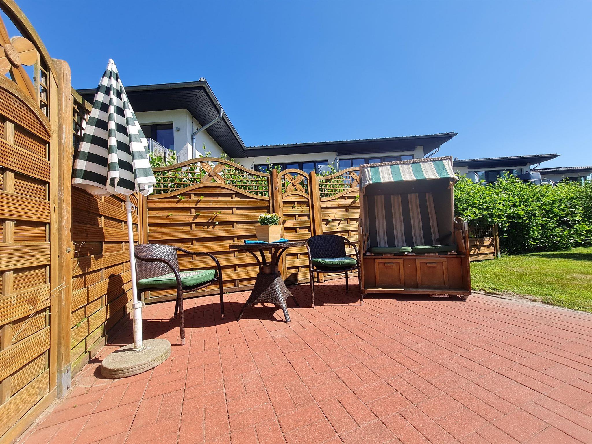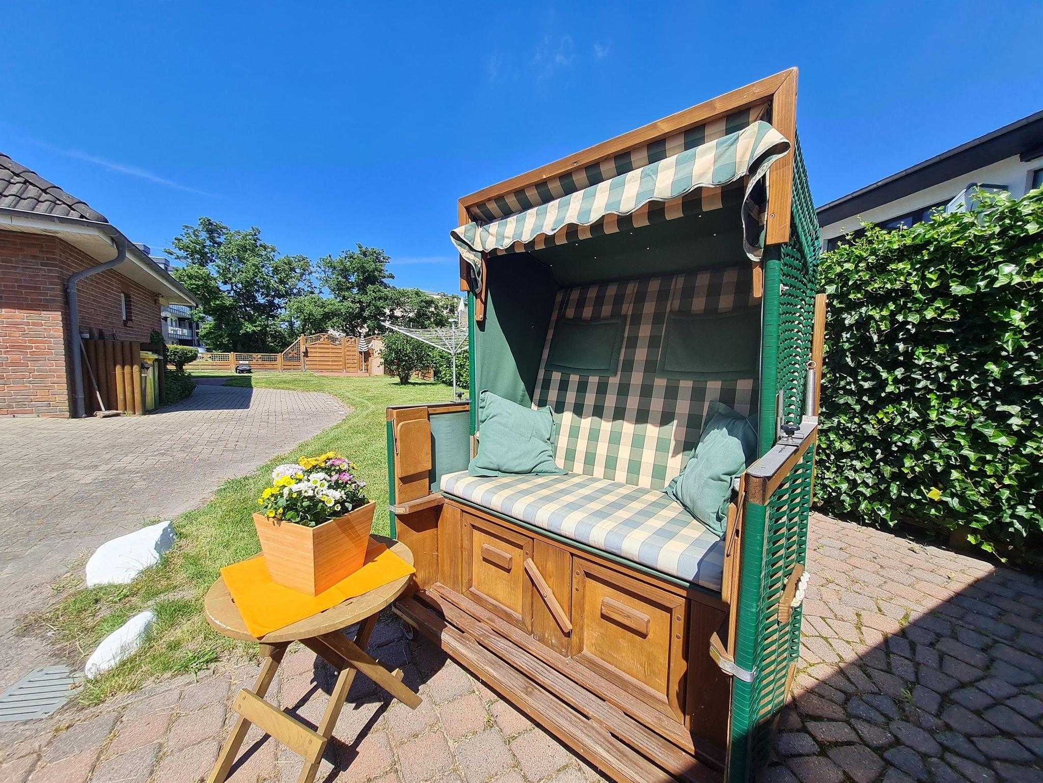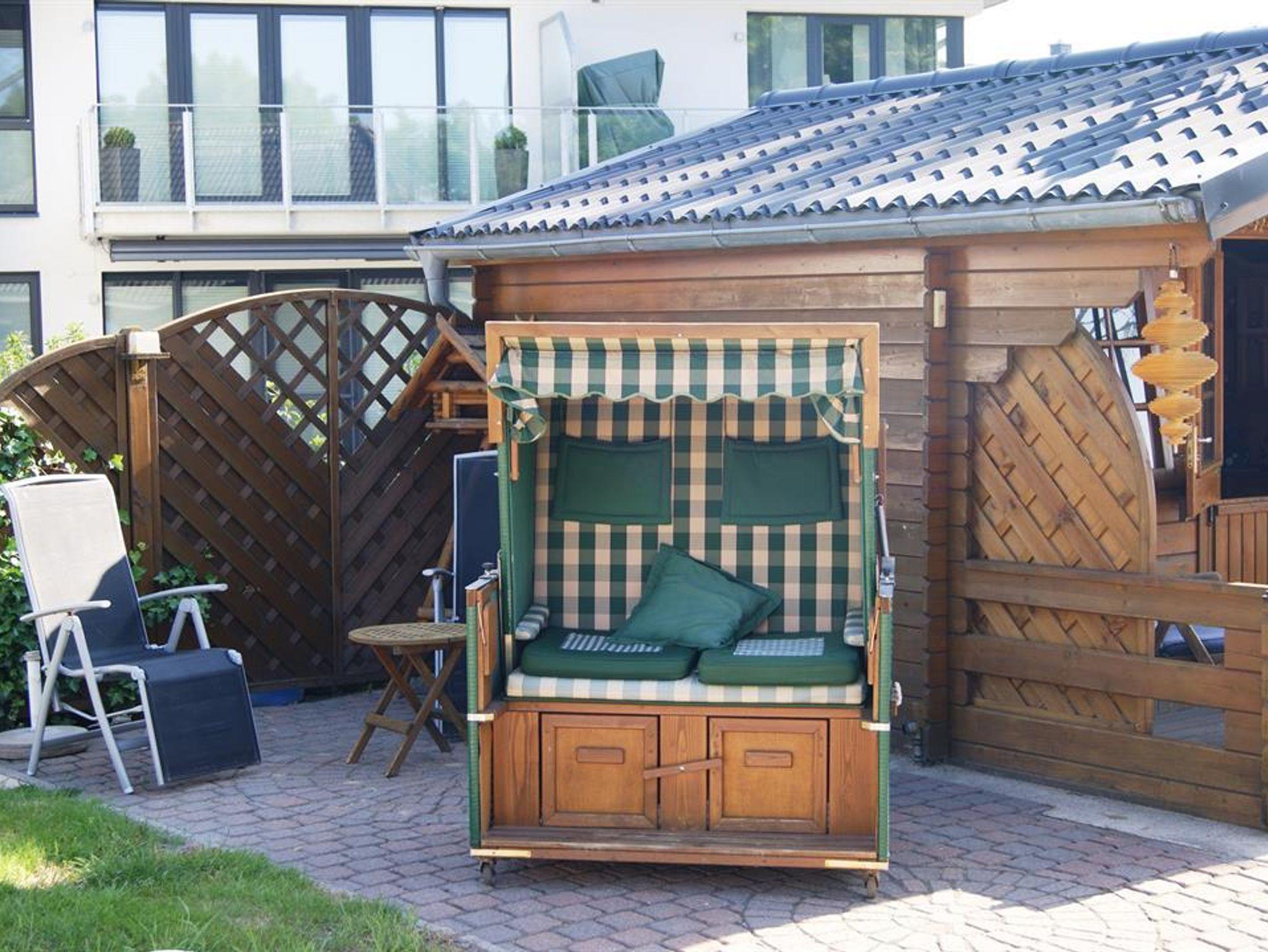 Im Garten stehen Ihnen Gartenmöbel, eine Blockhütte und ein Strandkorb mit zur Verfügung.