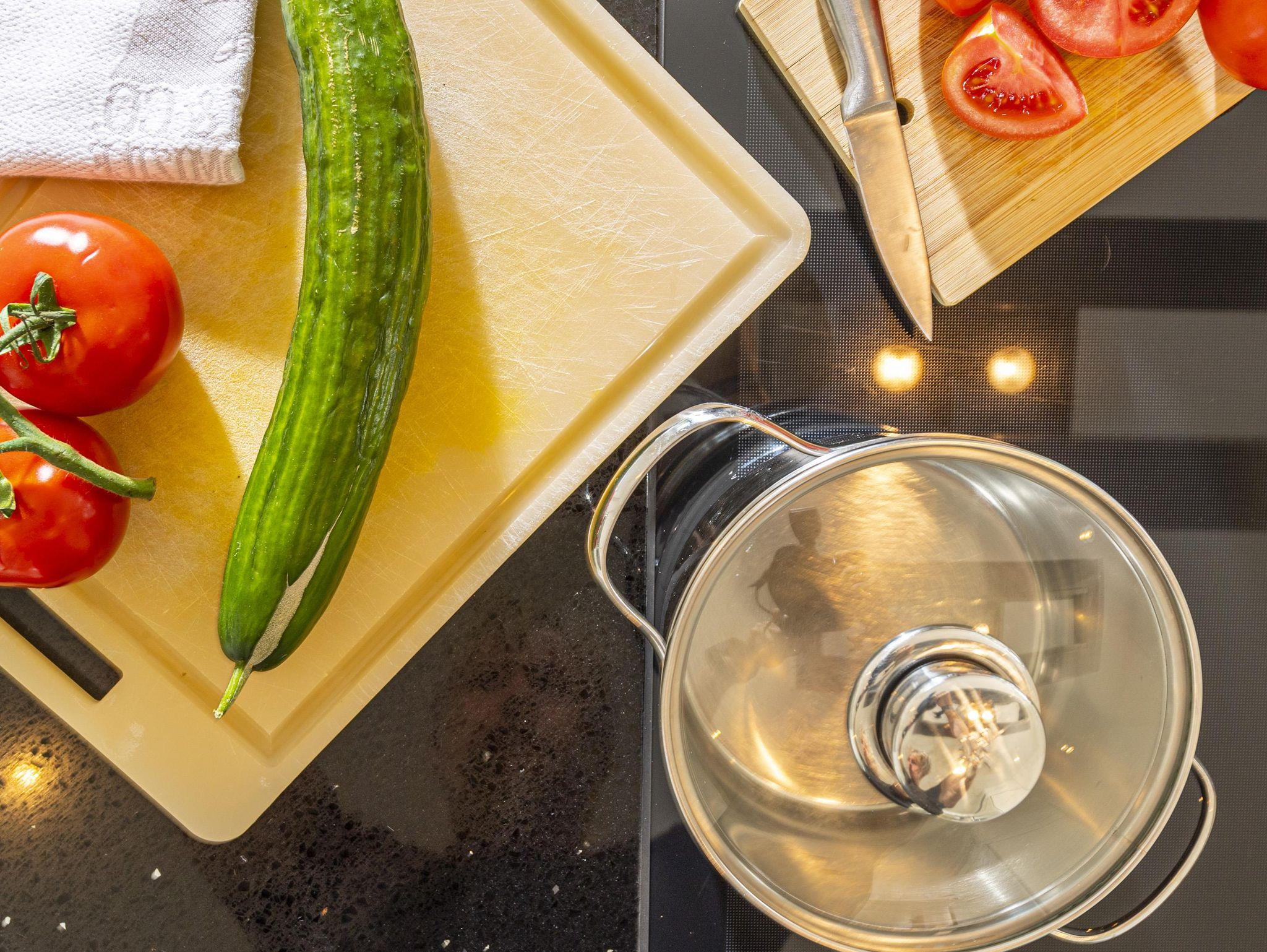 Im Erdgeschoss sind der Eingangsbereich, der Wohnraum mit offener Küche, der Essbereich, ein Kamin und der Zugang zur Terrasse. Zudem finden Sie dort ein Schlafzimmer mit Doppelbett (180 x 200 cm) und angegliedertem Duschbad / WC, ein separates Gäste-WC, ein Hauswirtschaftsraum und ein Abstellraum.
